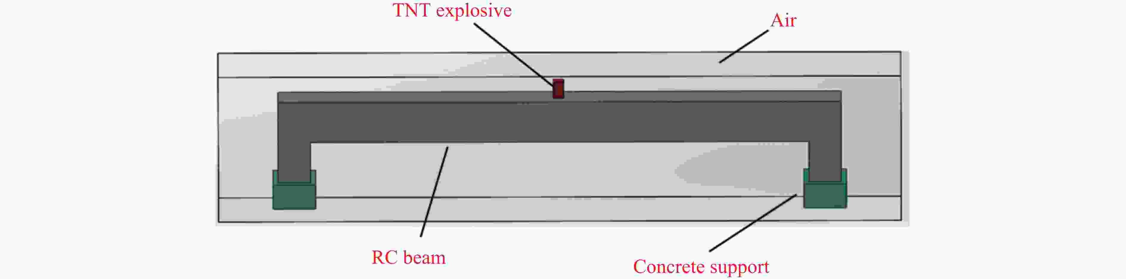 $ \rho /({\mathrm{g\cdot c{m}}}^{-3}) $ $ D_{{\mathrm{CJ}}}/(\text{km}\cdot {\text{s}}^{-\text{1}}) $ $ {p_{{\mathrm{CJ}}}}/{\text{GPa}} $ $ A/{\text{GPa}} $ $ B/{\text{MPa}} $ $ {R_1} $ $ {R_2} $ $ \omega $ 1.63 0.693 21 371.2001 32.31 4.15 0.95 0.3 $ \rho/(\mathrm{kg\cdot m}^{-3}) $ $ {C_0} $ $ {C_1} $ $ {C_2} $ $ {C_3} $ $ {C_4} $ $ {C_5} $ $ {C_6} $ 1.29 0 0 0 0 0.4 0.4 0 $ \rho /({\mathrm{g\cdot c{m}}}^{-3}) $ $ E/{\text{GPa}} $ $ \nu $ 7.83 210 0.30 $ \rho /({\mathrm{g\cdot c{m}}}^{-3}) $ $ E/{\text{GPa}} $ $ \nu $ $ \sigma _{\mathrm{s}}/{\text{GPa}} $ $ F_{\mathrm{S}} $ 7.89 206 0.30 1.724 0.500 $ \rho /({\mathrm{g\cdot c{m}}}^{-3}) $ $ {A_{\text{0}}} $/MPa Rsize/(m/inches) wUCF/(Pa/PSI) LCRATE 2.30 −45.4 3.94×10−2 145 723 $ \rho /({\mathrm{g\cdot c{m}}}^{-3}) $ $ E/{\text{MPa}} $ $ \nu $ $ {\sigma _{\mathrm{Y}}}/{\text{MPa}} $ $ G/{\text{MPa}} $ 1.02 230 0.4 1.38 3.5 表 7 3种工况下RC梁的数值模拟与试验结果对比