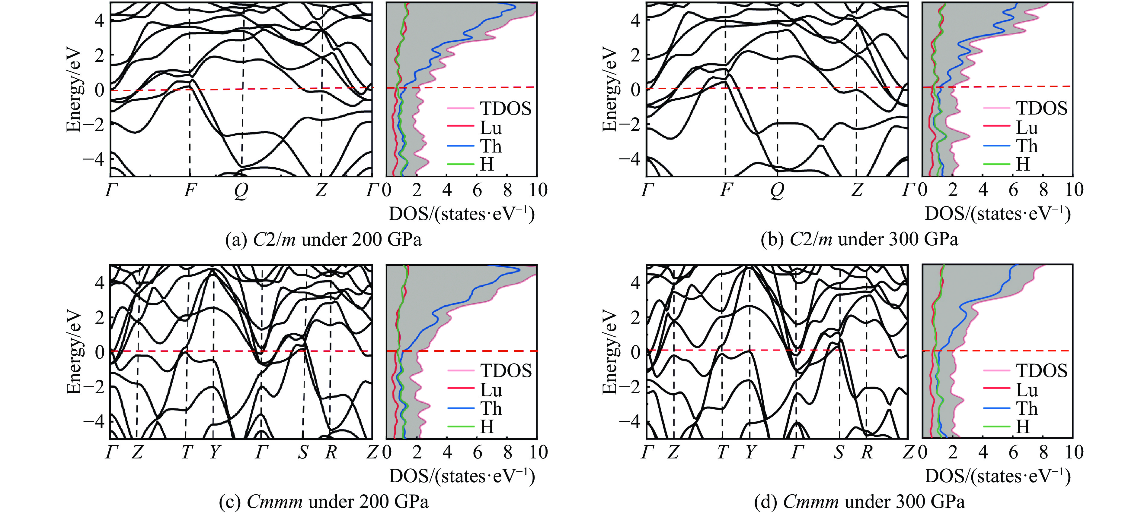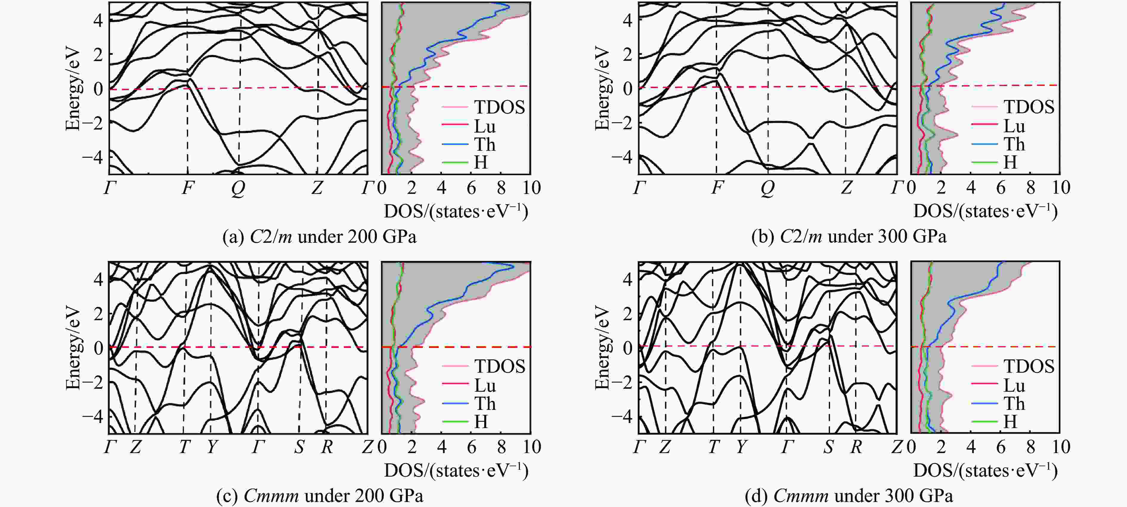Figure  2.  Energy band and DOS for C2/m and Cmmm phases of LuThH10