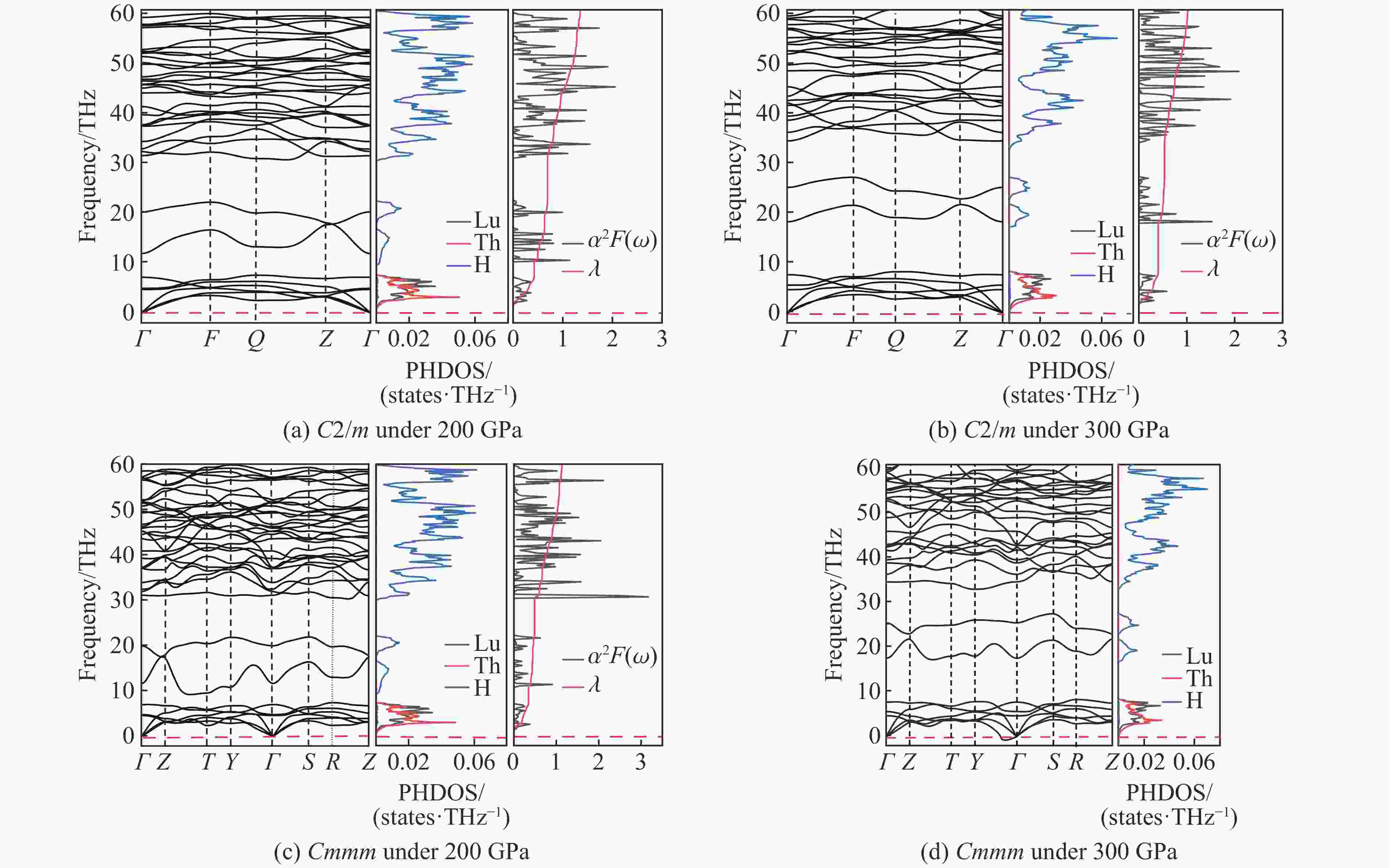 图  高压下LuThH10C2/m相和Cmmm相的声子谱、声子态密度、谱函数和电声耦合常数
