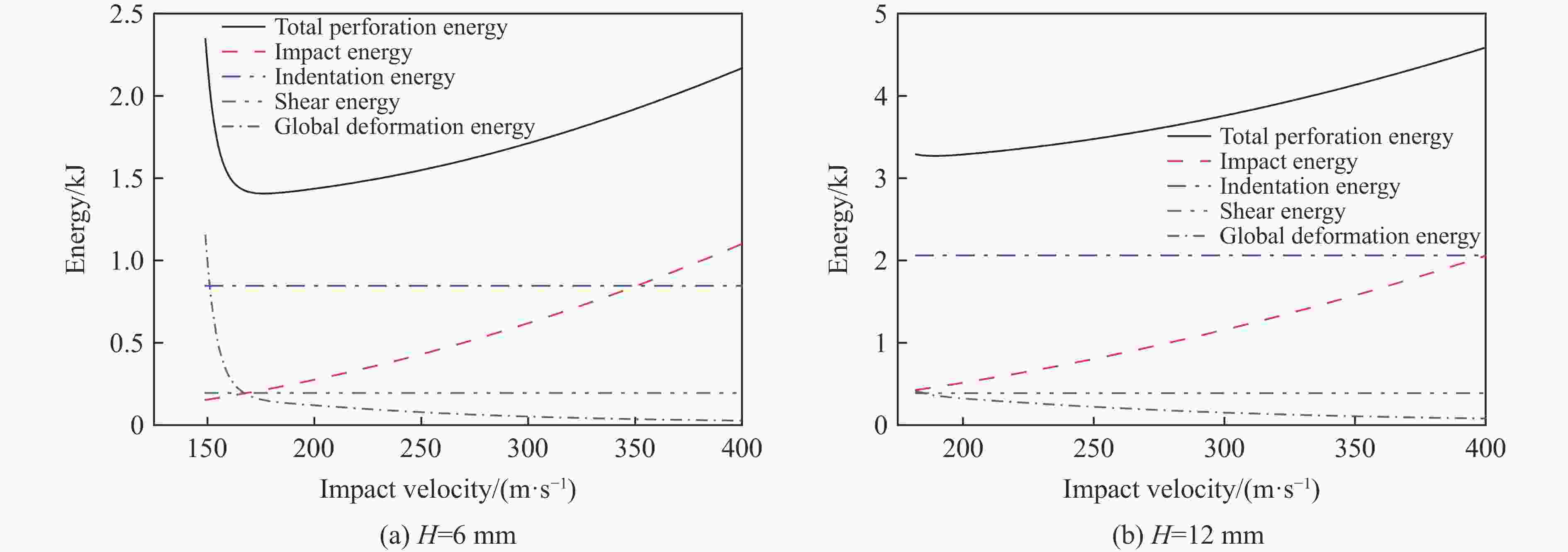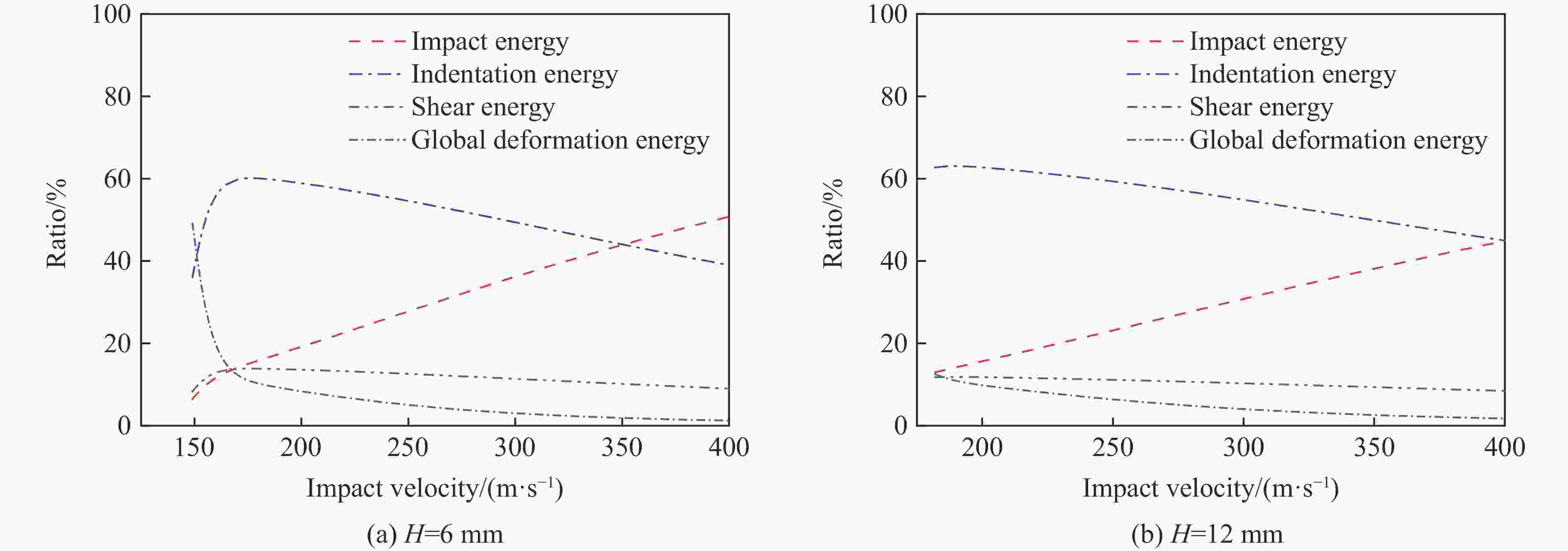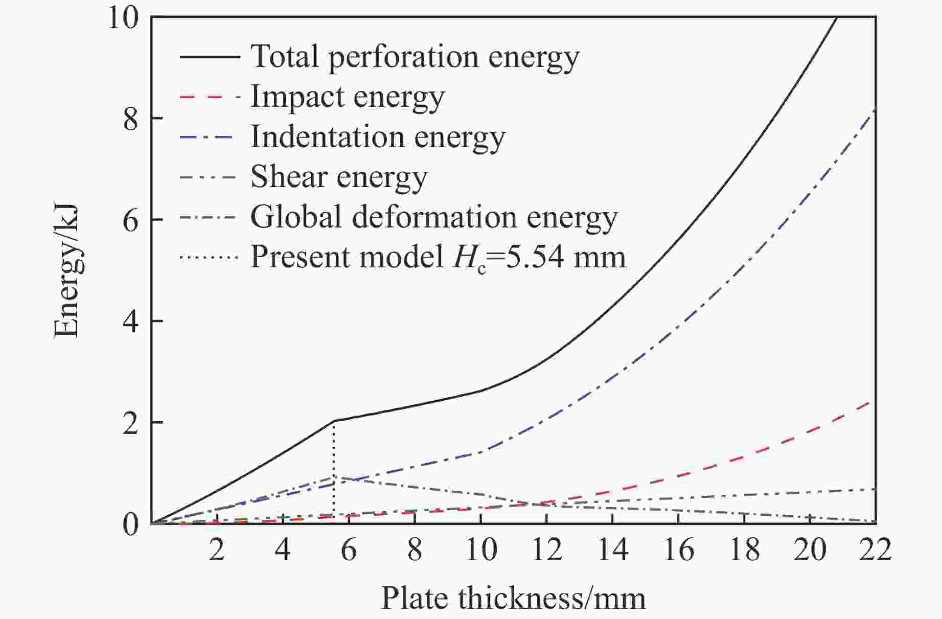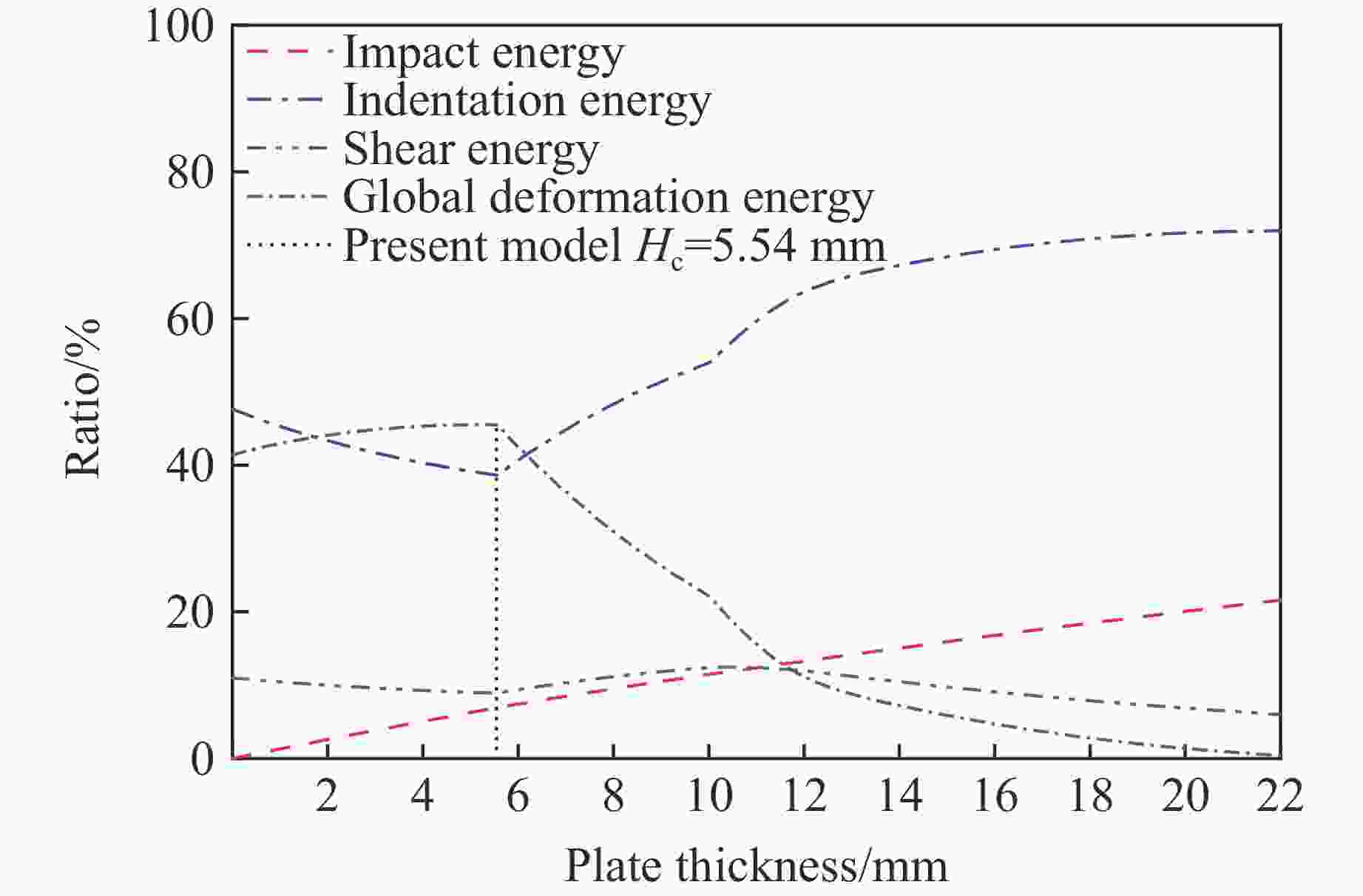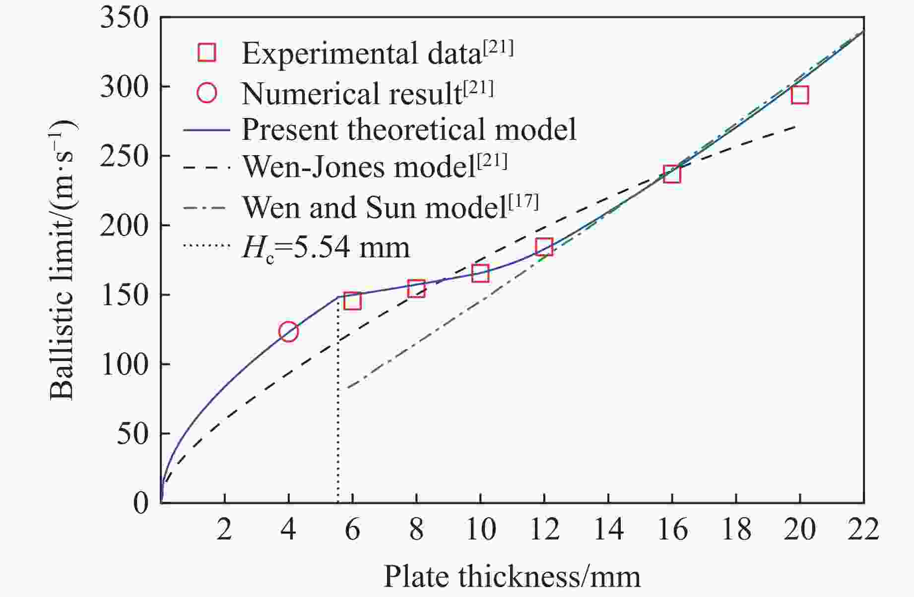 摘要: 利用先前提出的统一框架内平头弹穿透有限金属靶板的理论模型,对平头弹撞击下Weldox 460E钢板的穿透问题进行了研究。该模型包含一个无量纲半经验方程,考虑了整体变形吸能随撞击速度的变化,由此讨论了Weldox 460E钢板的能量吸收机理,解释了“平台”现象(随着板厚的增大,弹道极限的提高有限),并将Weldox 460E钢板结果与先前研究的2024-T351铝板结果进行了对比。结果表明:模型预测的Weldox 460E钢板在平头弹撞击下的整体变形与撞击速度之间的关系、弹道极限、残余速度以及破坏模式临界转化条件等均与实验结果吻合得很好;模型也能很好地预测中厚板范围内的“平台”现象。与2024-T351铝板相比,被平头弹贯穿的Weldox 460E钢板的压入吸能在总吸能中的占比明显更大,这是两种靶板材料的不同特性所导致的。Abstract: A theoretical analysis on the perforation of Weldox 460E steel plates struck by flat-nosed projectiles is presented using a previously developed model within a unified framework. This model contains a dimensionless empirical equation to describe the variation of energy absorbed through global deformation as a function of impact velocity. The study further investigates the energy absorption mechanisms of Weldox 460E steel plates, with particular focus on the “plateau” phenomenon, i. e., limited increase in ballistic limit with increasing plate thickness. This phenomenon is explained and compared with results from previously studied 2024-T351 aluminium plates. The model predictions agree well with experimental data for Weldox 460E steel plates impacted by flat-nosed projectiles, including: relationship between global deformation and impact velocity, ballistic limit, residual velocity, and critical conditions for the transition of failure modes. Moreover, the model effectively predicts the “plateau” phenomenon observed in intermediate plate thickness range. It is also found that the indentation absorption energy contributes a significantly larger fraction of the total absorption energy in Weldox 460E steel plates perforated by flat-nosed projectiles than in 2024-T351 aluminium plates, due to the differences in material properties.