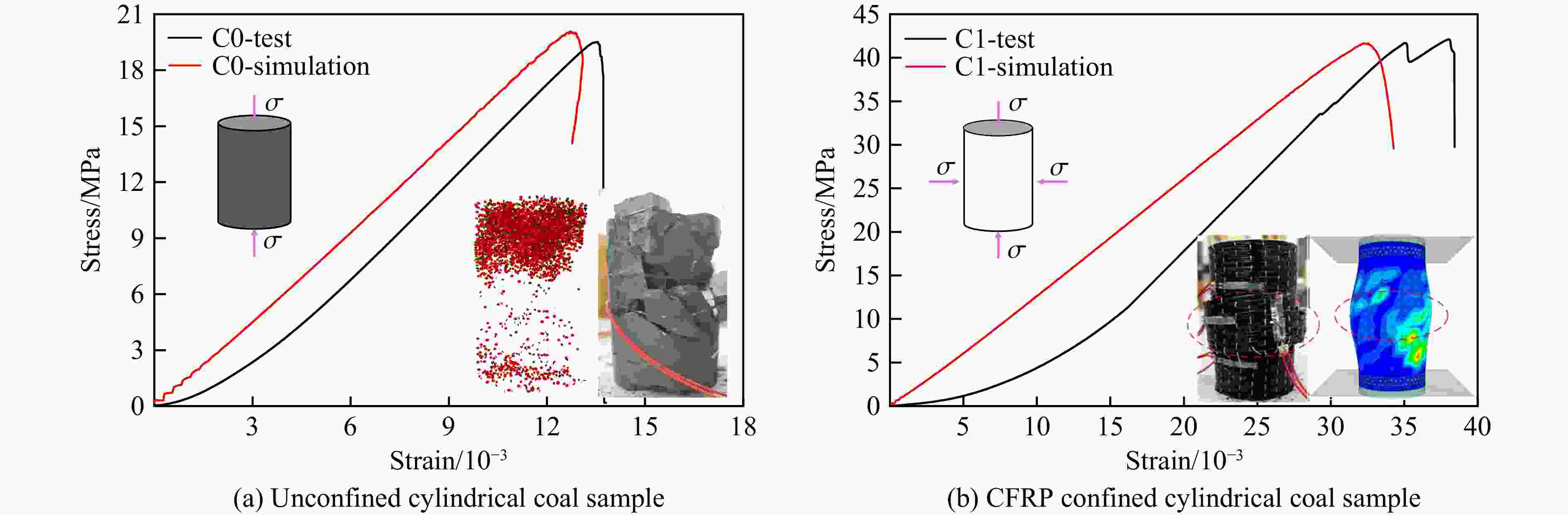 Sample σp εp E Test/MPa Sim./MPa Error/% Test/10−3 Sim./10−3 Error/% Test/GPa Sim./GPa Error/% Unconfined 19.50 20.08 3.0 13.53 12.71 6.1 1.72 1.63 5.2 CFRP confined 42.14 41.63 1.2 37.04 33.40 9.8 1.61 1.48 8.10 表 5 煤圆柱和CFRP布的细观参数