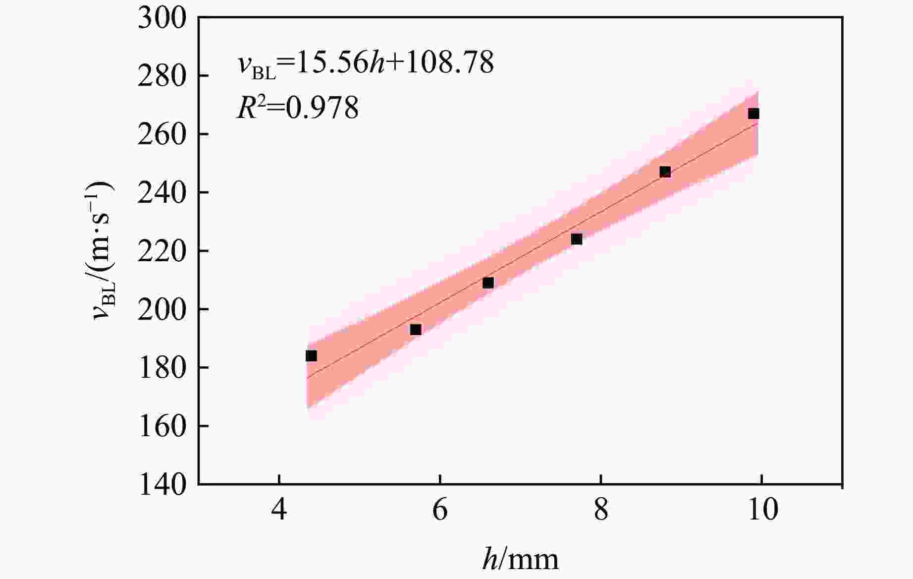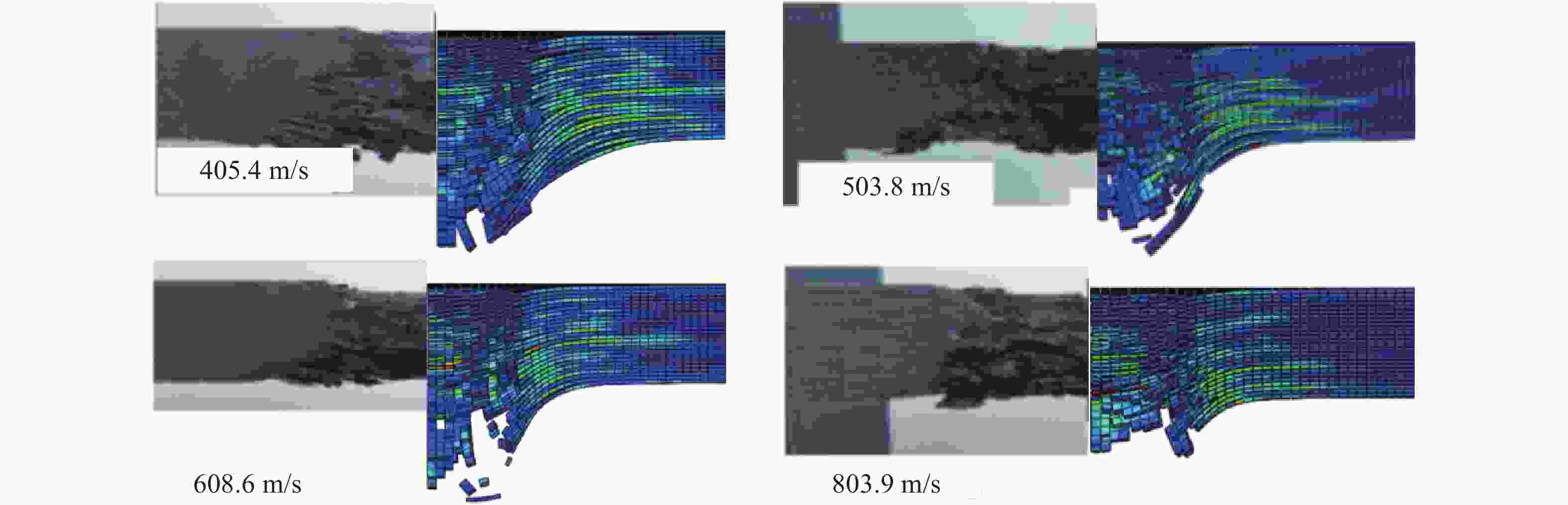 Method E1/GPa E2/GPa E3/GPa G12/GPa G13/GPa G23/GPa Xt/MPa Simulation 56.50 56.50 7.90 3.59 2.51 2.51 740.37 Test[15] 57.94 57.94 3.59 726 Error/% −2.49 −2.49 0 1.98 Method Yt/MPa Xc/MPa Yc/MPa S12/MPa S13 /MPa S23/MPa Simulation 740.37 630.34 630.34 64.95 62.88 62.88 Test[15] 726 113.29 65.82 65.82 Error/% 1.98 −42.67 −4.47 −4.47 $ {t}_{\mathrm{n}}^{0} $/MPa $ {t}_{\mathrm{s}}^{0} $/MPa $ {t}_{\mathrm{t}}^{0} $/MPa $ {G}_{\mathrm{c}}^{{Ⅰ}} $/(kJ·m−2) $ {G}_{\mathrm{c}}^{{Ⅱ}} $/(kJ·m−2) $ {G}_{\mathrm{c}}^{{Ⅲ}} $/(kJ·m−2) 50 90 90 0.52 0.92 0.92 表 8 仿真与试验得到的剩余速度和单位面密度吸能的对比