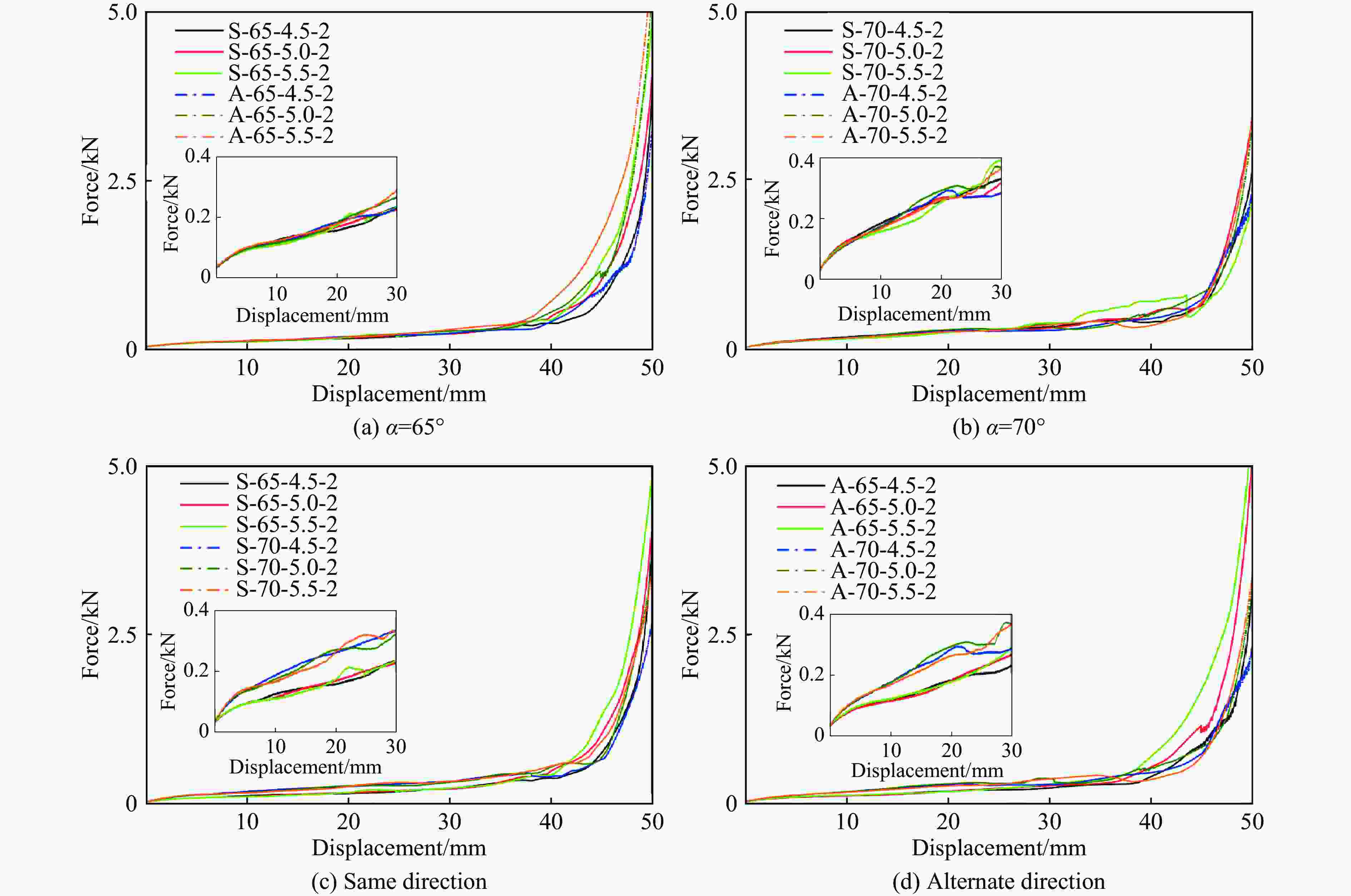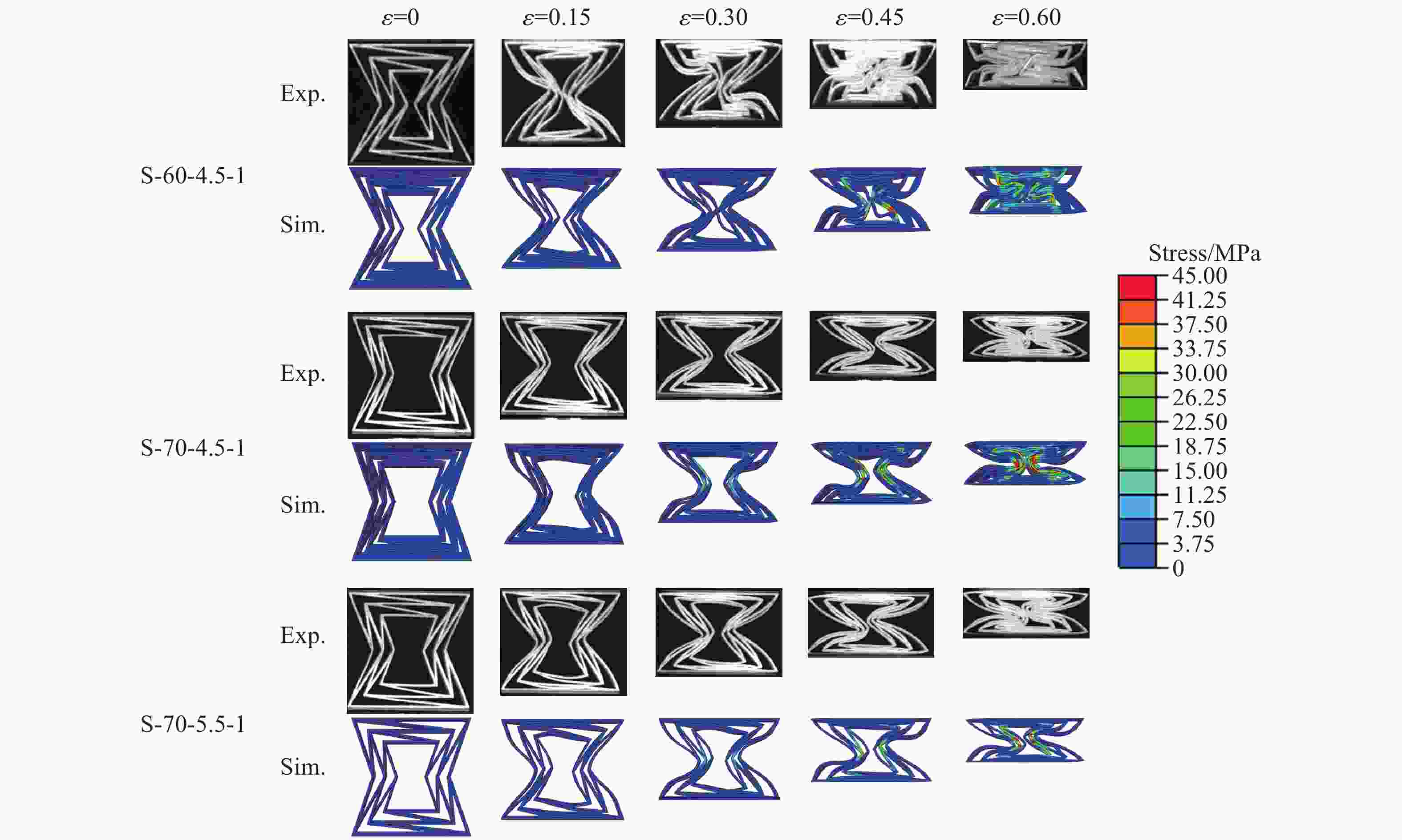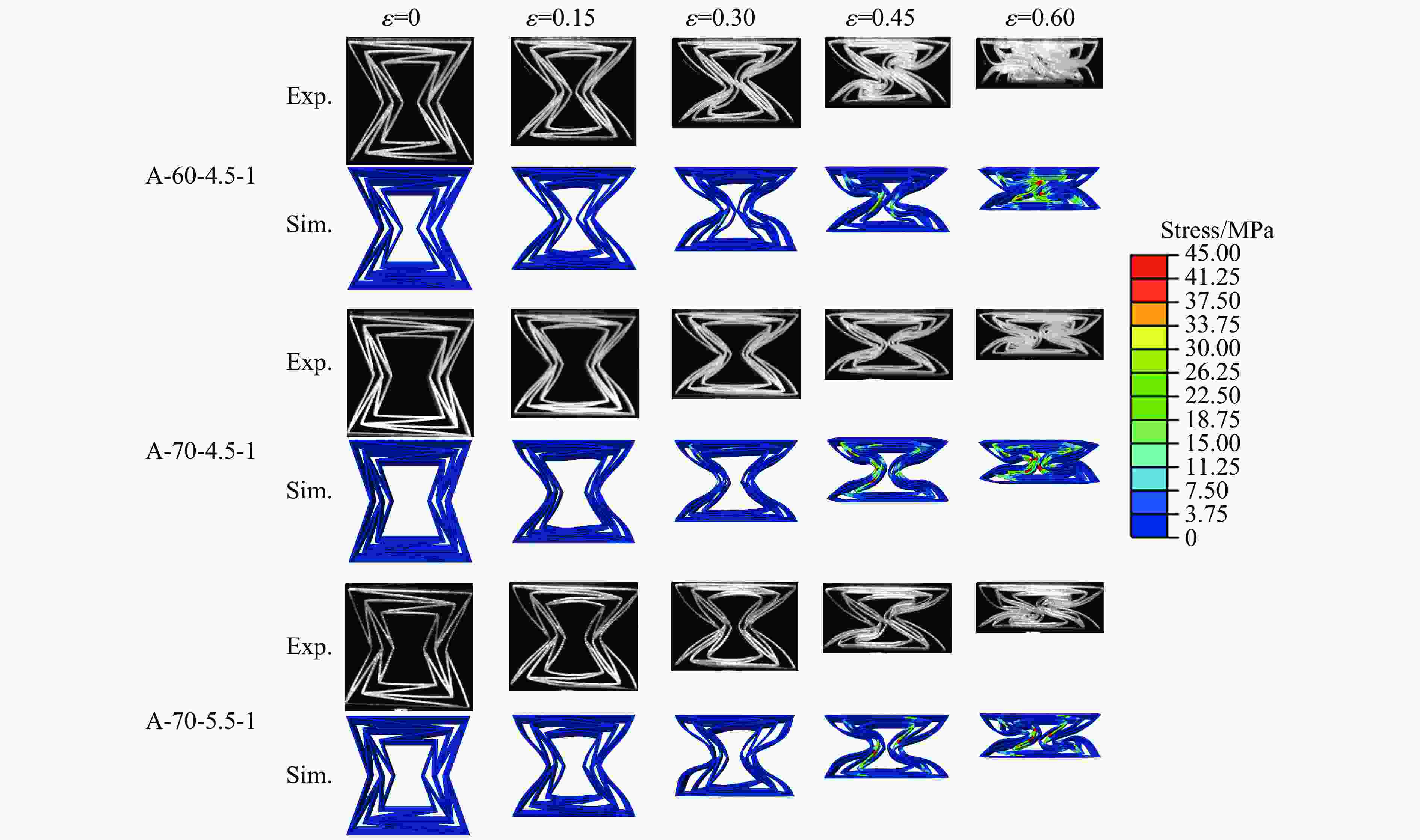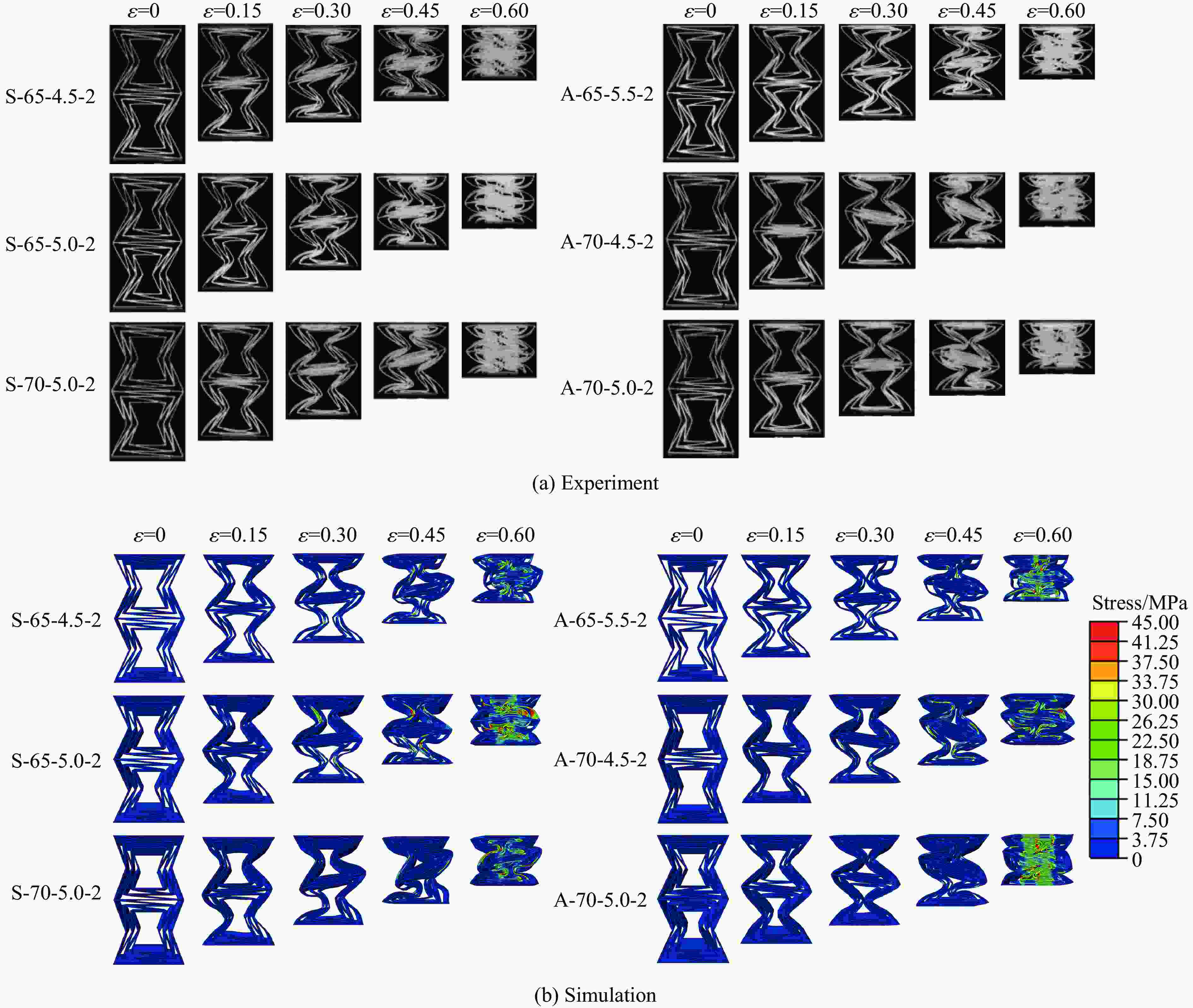 Model Ea/J Esa/(J·g−1) Model Ea/J Esa/(J·g−1) Model Ea/J Esa/(J·g−1) S-60-4.5-1 17.236 0.827 S-65-4.5-1 18.475 0.847 S-70-4.5-1 11.009 0.500 S-60-5.0-1 18.972 0.930 S-65-5.0-1 21.508 1.003 S-70-5.0-1 14.852 0.691 S-60-5.5-1 19.896 0.997 S-65-5.5-1 23.880 1.137 S-70-5.5-1 17.913 0.837 A-60-4.5-1 12.307 0.597 A-65-4.5-1 10.931 0.513 A-70-4.5-1 10.222 0.475 A-60-5.0-1 13.571 0.669 A-65-5.0-1 12.577 0.600 A-70-5.0-1 11.253 0.533 A-60-5.5-1 14.407 0.726 A-65-5.5-1 14.867 0.722 A-70-5.5-1 14.256 0.685 表 2 负泊松比串联结构的吸能指标