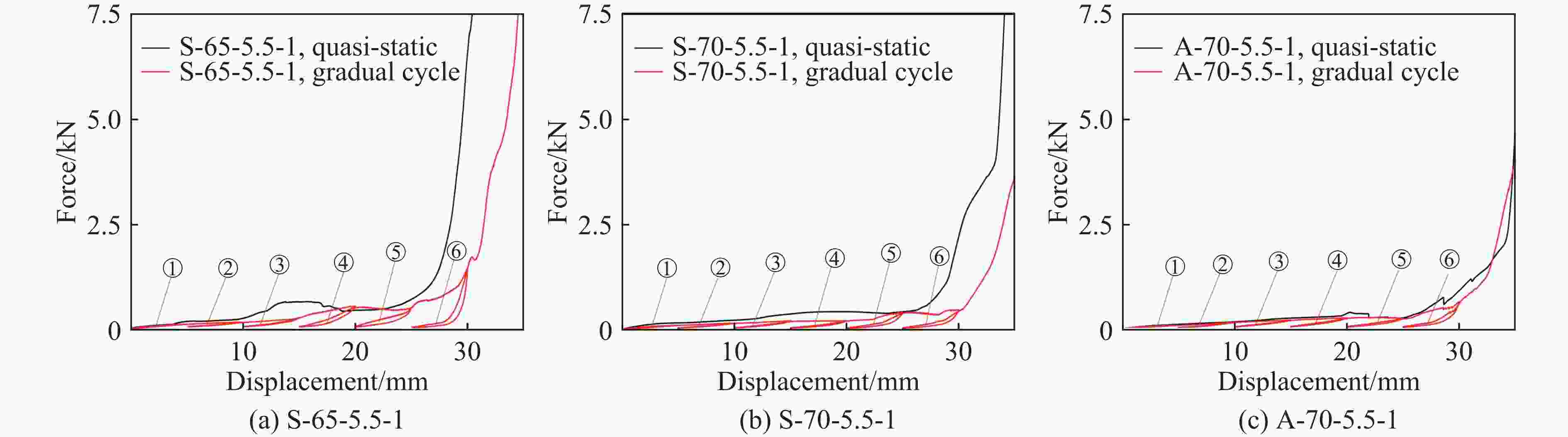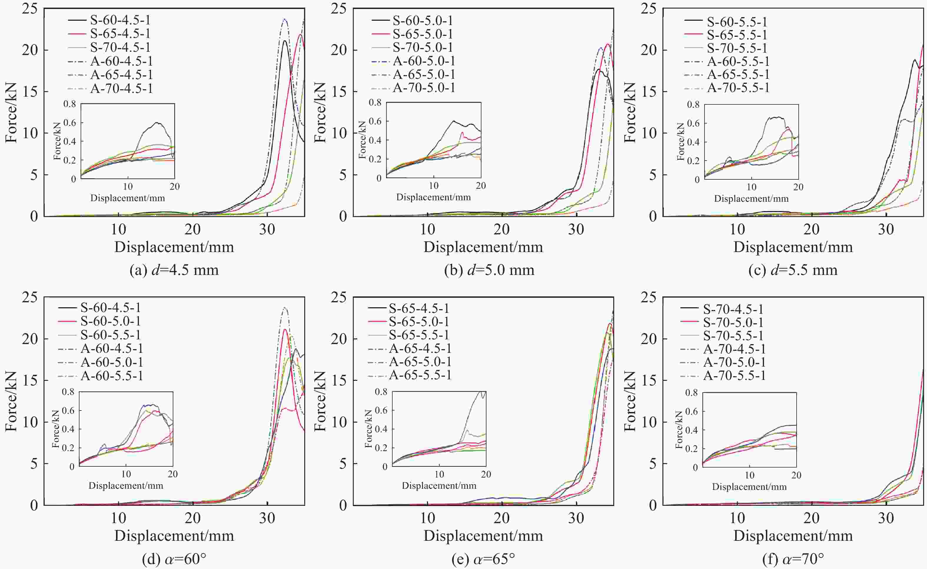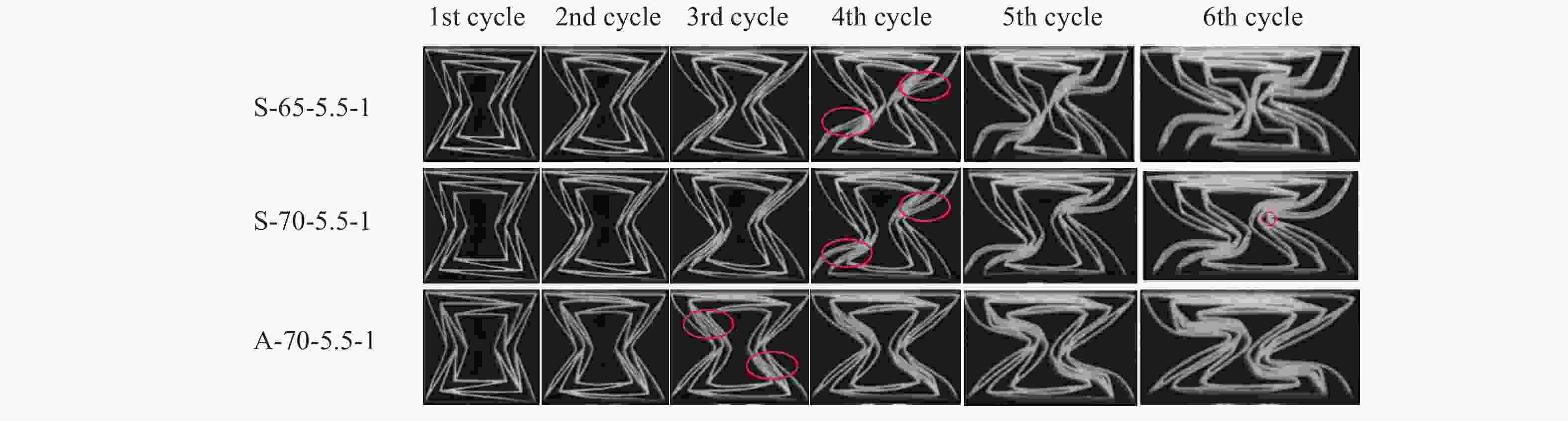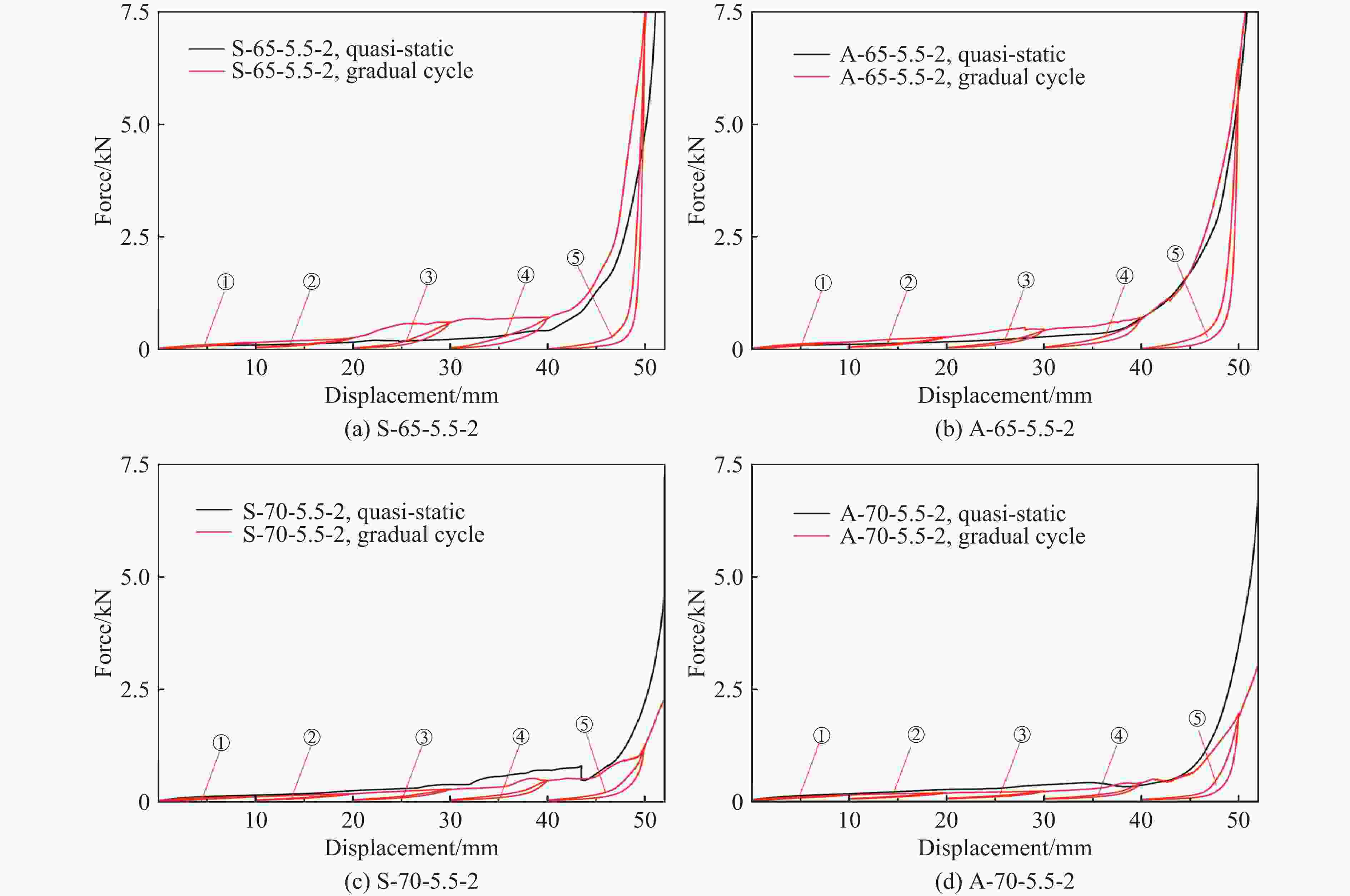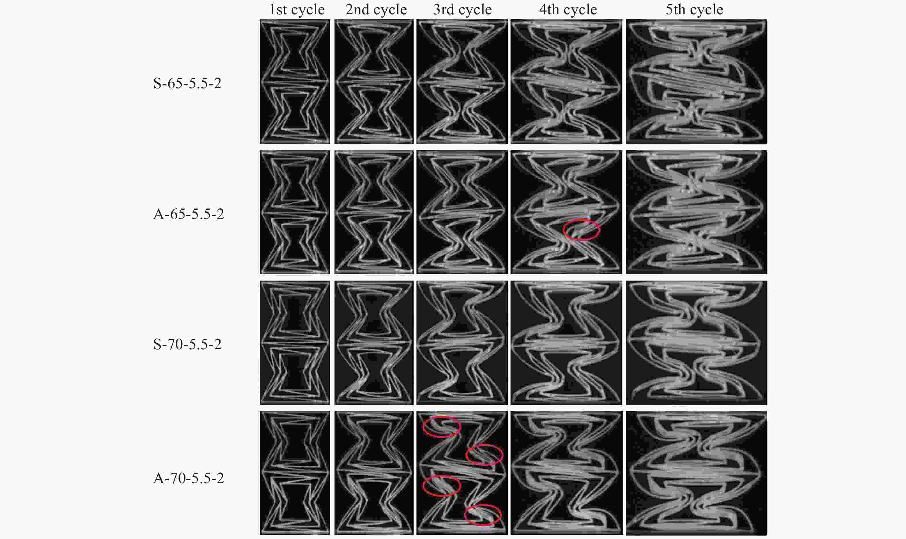Model Ea/J Esa/(J·g−1) Model Ea/J Esa/(J·g−1) Model Ea/J Esa/(J·g−1) S-60-4.5-1 17.236 0.827 S-65-4.5-1 18.475 0.847 S-70-4.5-1 11.009 0.500 S-60-5.0-1 18.972 0.930 S-65-5.0-1 21.508 1.003 S-70-5.0-1 14.852 0.691 S-60-5.5-1 19.896 0.997 S-65-5.5-1 23.880 1.137 S-70-5.5-1 17.913 0.837 A-60-4.5-1 12.307 0.597 A-65-4.5-1 10.931 0.513 A-70-4.5-1 10.222 0.475 A-60-5.0-1 13.571 0.669 A-65-5.0-1 12.577 0.600 A-70-5.0-1 11.253 0.533 A-60-5.5-1 14.407 0.726 A-65-5.5-1 14.867 0.722 A-70-5.5-1 14.256 0.685 表 2 负泊松比串联结构的吸能指标