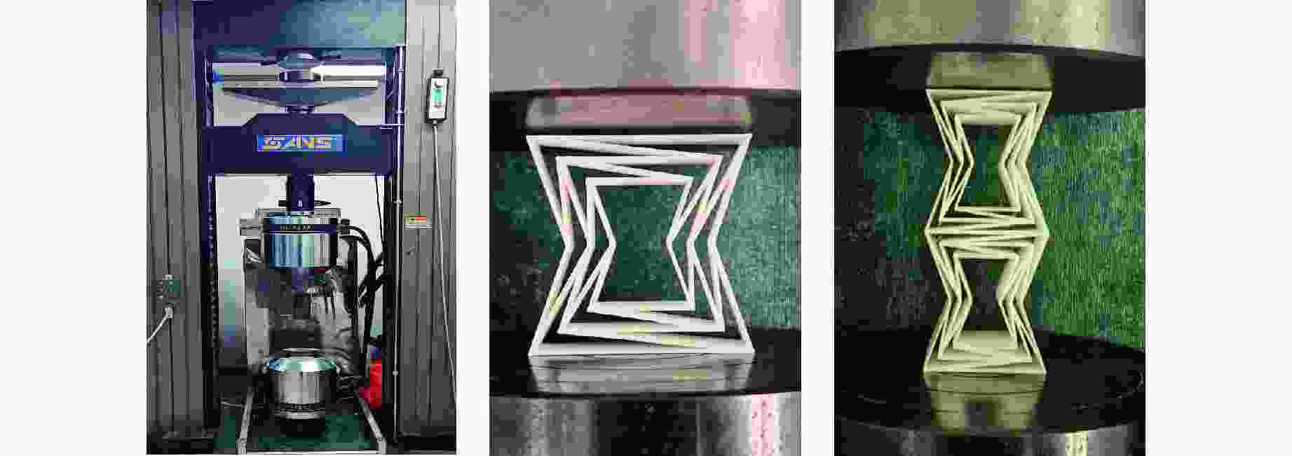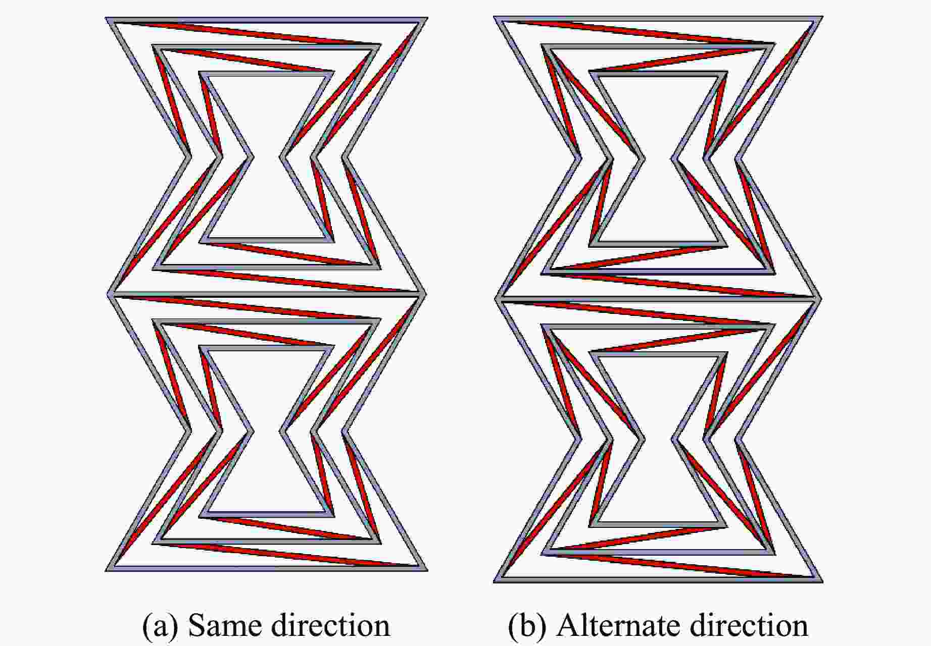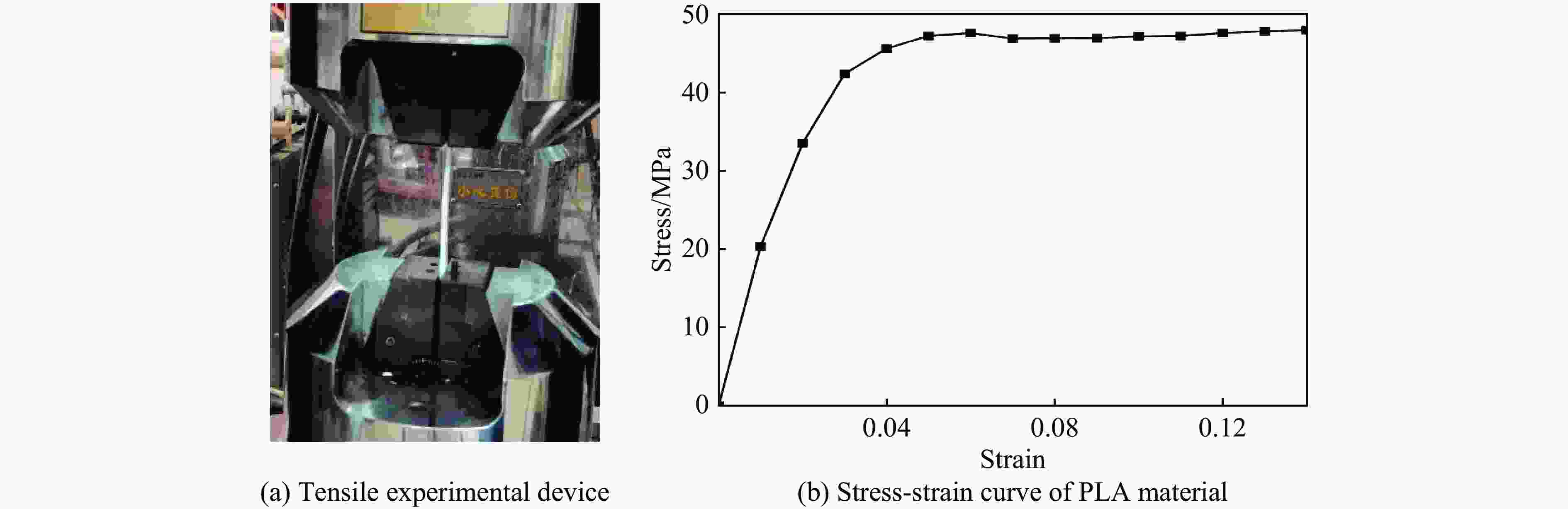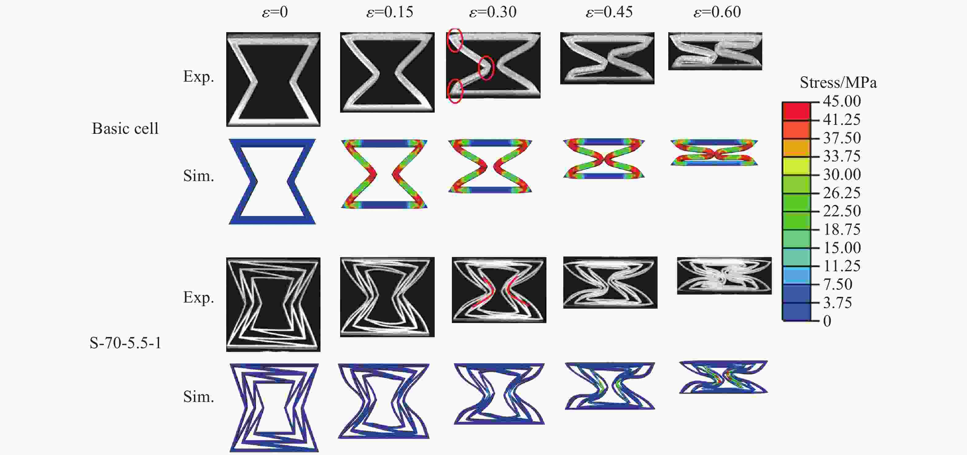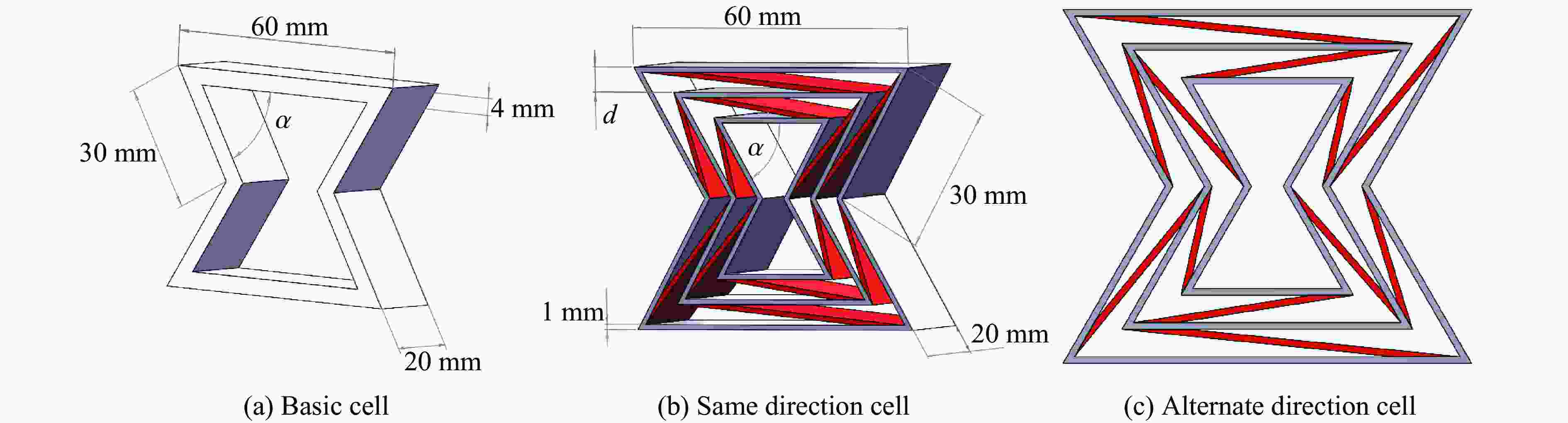 摘要: 采用准静态单轴压缩实验、循环压缩实验和有限元数值模拟,对不同角度、间距和连接方式的多层嵌套内凹六边形单胞结构及其串联结构的变形行为和吸能特性进行分析。结果表明:多层嵌套结构多发生剪切变形,应力小且多集中在斜杆连接处;角度更大、间距更小的交替方式连接的单胞结构拥有更长的平台期;负泊松比单胞结构且角度为65°的试件吸能表现更优异,且同向连接以及间距增大有助于吸能的提升;角度和间距对串联结构平台期的影响与单胞结构相同,连接方式的影响则相反;角度和间距增大、连接方式改变与吸能成正反馈;在循环压缩实验下,试件更易发生分层破坏和塑性断裂,多出现在二次循环后,并伴随应力软化和能量耗散行为,其效果随着循环次数的增加而加重。Abstract: The deformation behavior and energy absorption characteristics of multilayer nested auxetic hexagonal single-cell structures and tandem configurations with different angles, spacing and connection modes were analyzed through quasi-static uniaxial compression experiments, cyclic compression experiments and finite element simulations. The results show that the multilayer nested structure exhibits predominant shear deformation with localized stress concentration at diagonal bar connections, demonstrating lower stress magnitude distribution. The single-cell structures featuring alternating connections with larger angle and reduced spacing exhibit extended plateau phase duration. The specimen with α=65° achieves better energy absorption, where the isotropic connection and increasing spacing enhance the energy absorption capacity. The angle and spacing present analogous effects on the plateau period of both tandem and single-cell structures, while the connection mode demonstrate contrasting influences. Meanwhile, the energy absorption is positively correlated with increased angles and spacing, as well as the variation of the connection mode. Cyclic compression testing induces progressive delamination and plastic fracture in the specimen, predominantly initiating from the second cycle onward, accompanied by stress softening and energy dissipation behaviors that intensify with cycle repetition.