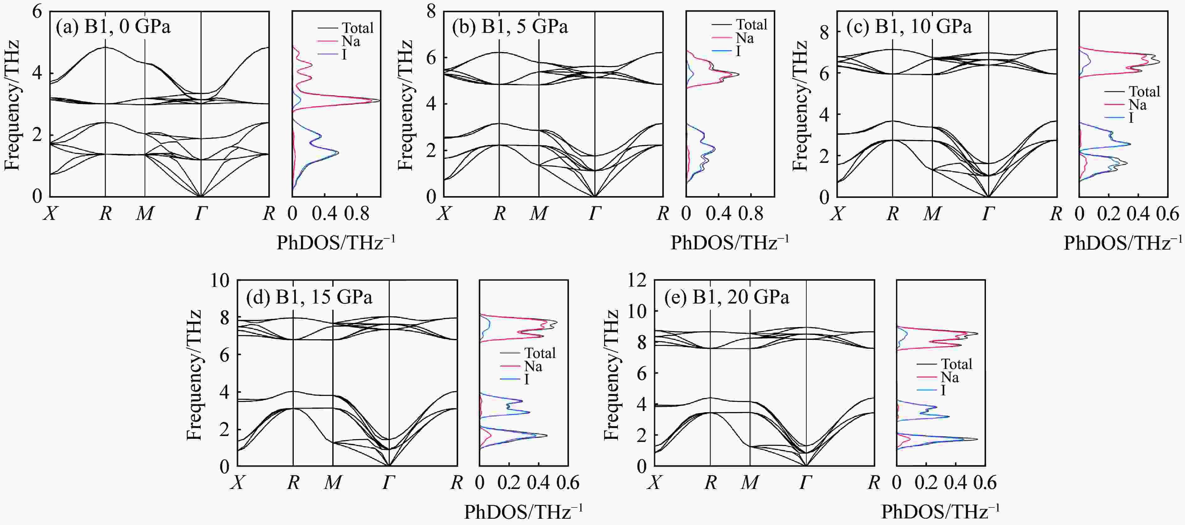 Figure  10.  NaI phonon dispersion and phonon density of states under pressures from 0 to 20 GPa