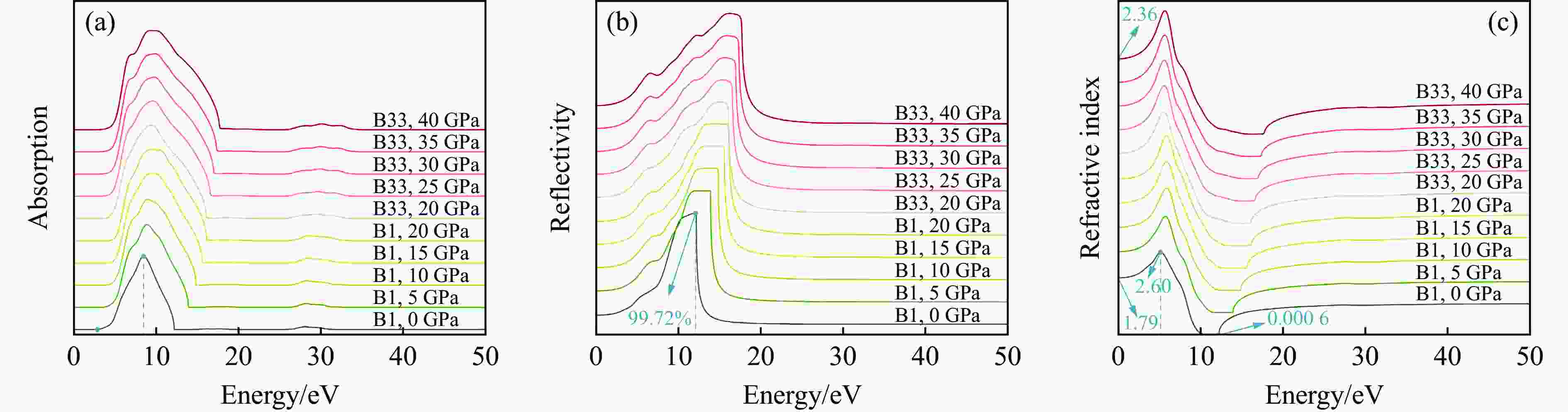 图  12  NaI在不同压力下的吸收谱、反射谱和复折射率