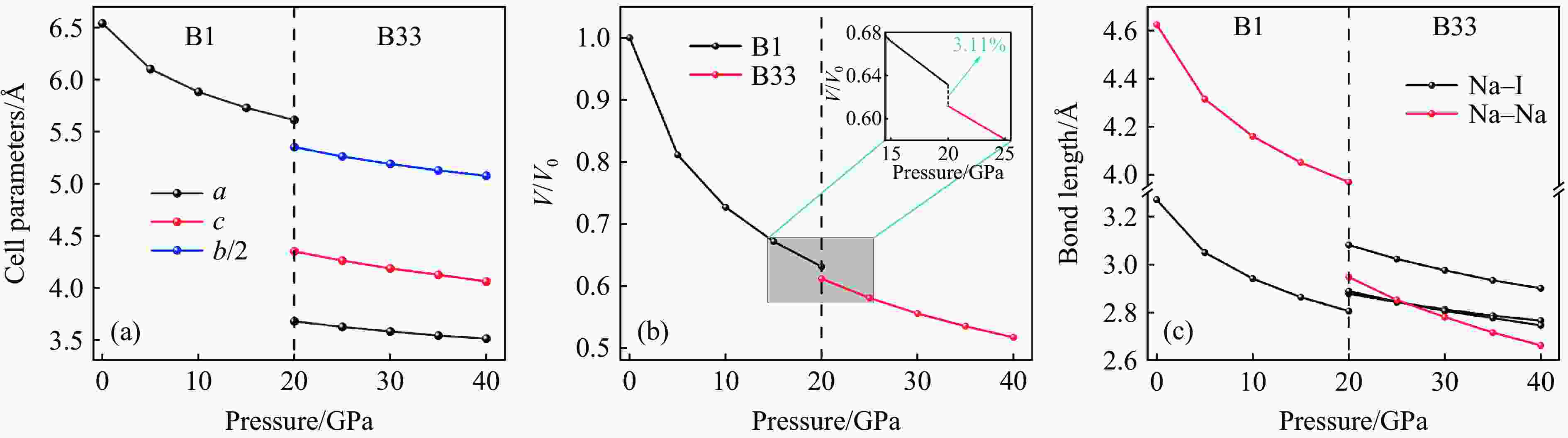 图  压力作用下B1相和B33相的晶胞参数(a)、归一化晶胞体积V/V0 (b)、键长(c)随压力的变化