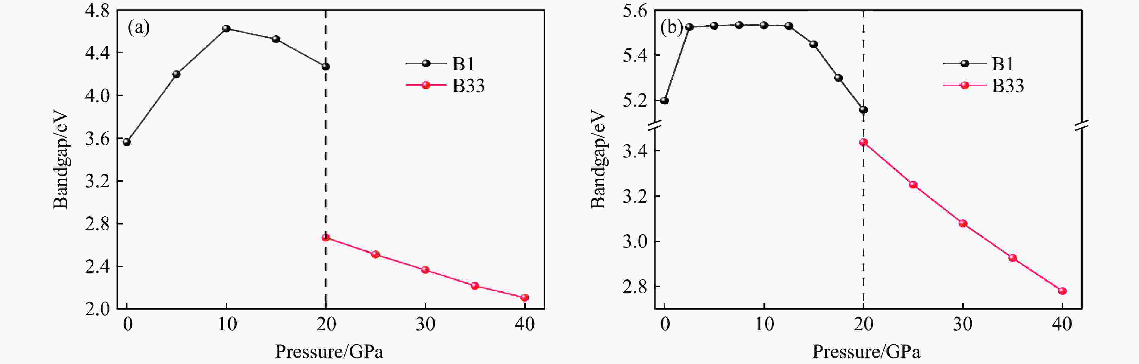 图  高压下NaI的B1相和B33相带隙演变(a)以及HSE杂化泛函计算的能带曲线(b)