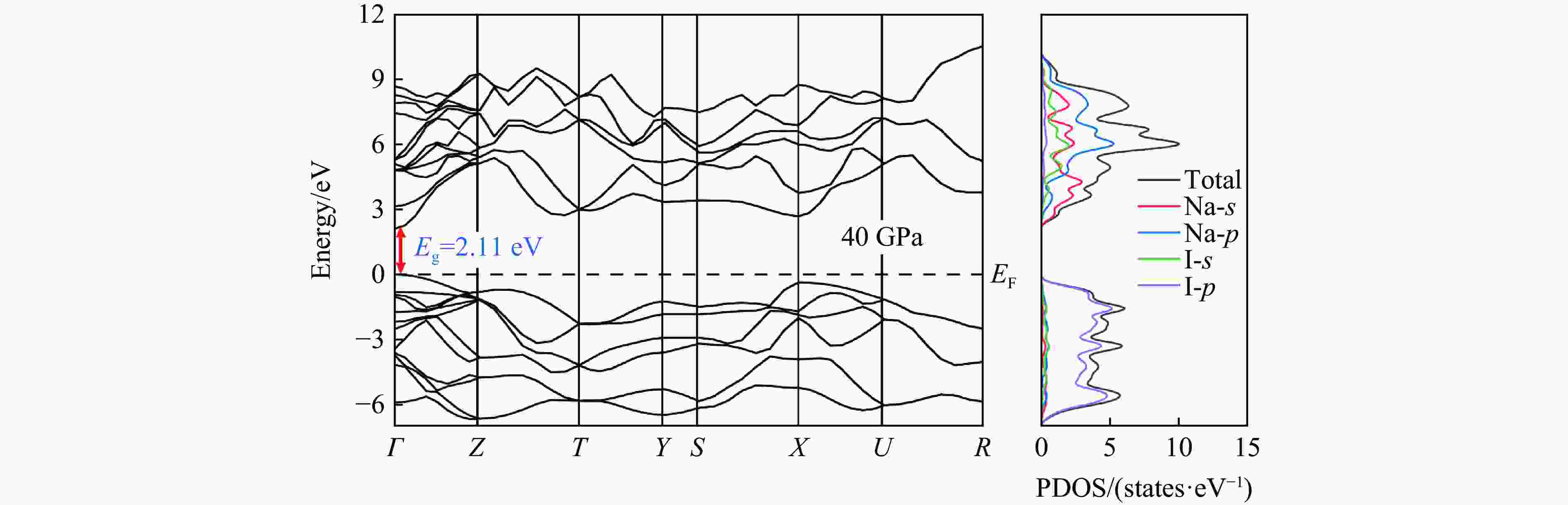 图  40 GPa压力下NaI的B33相的能带结构和投影态密度