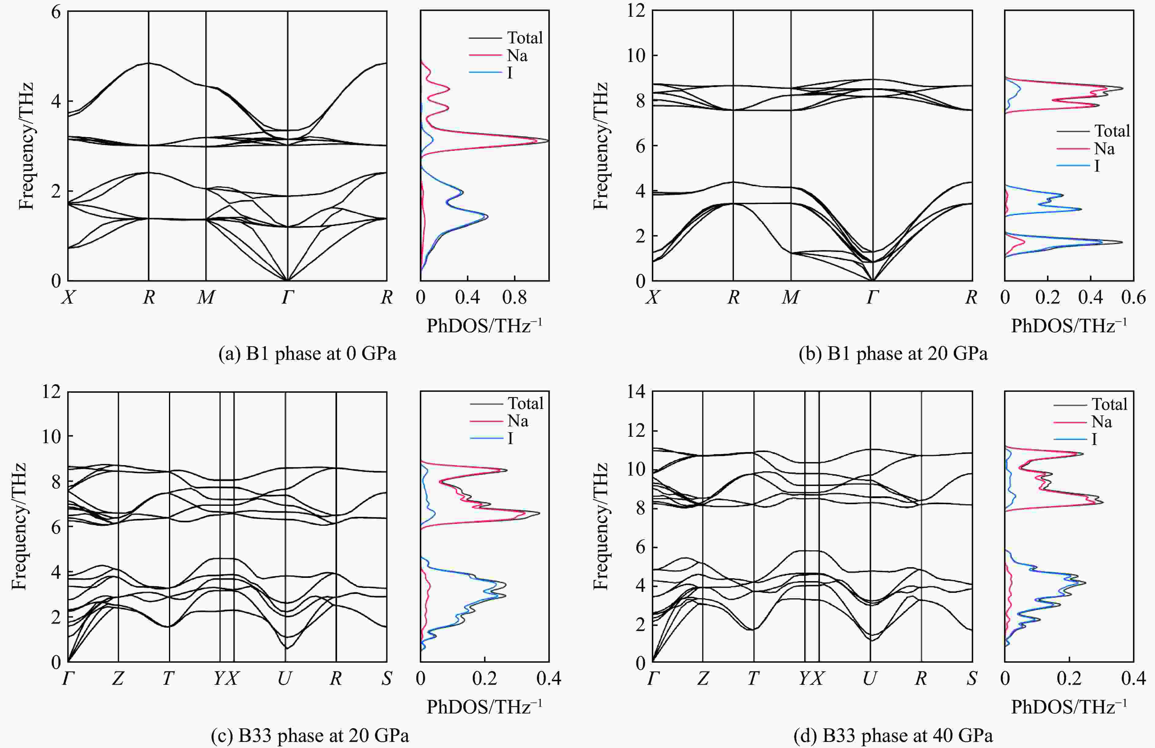 图  10  0~20 GPa压力下NaI的声子色散和声子态密度
