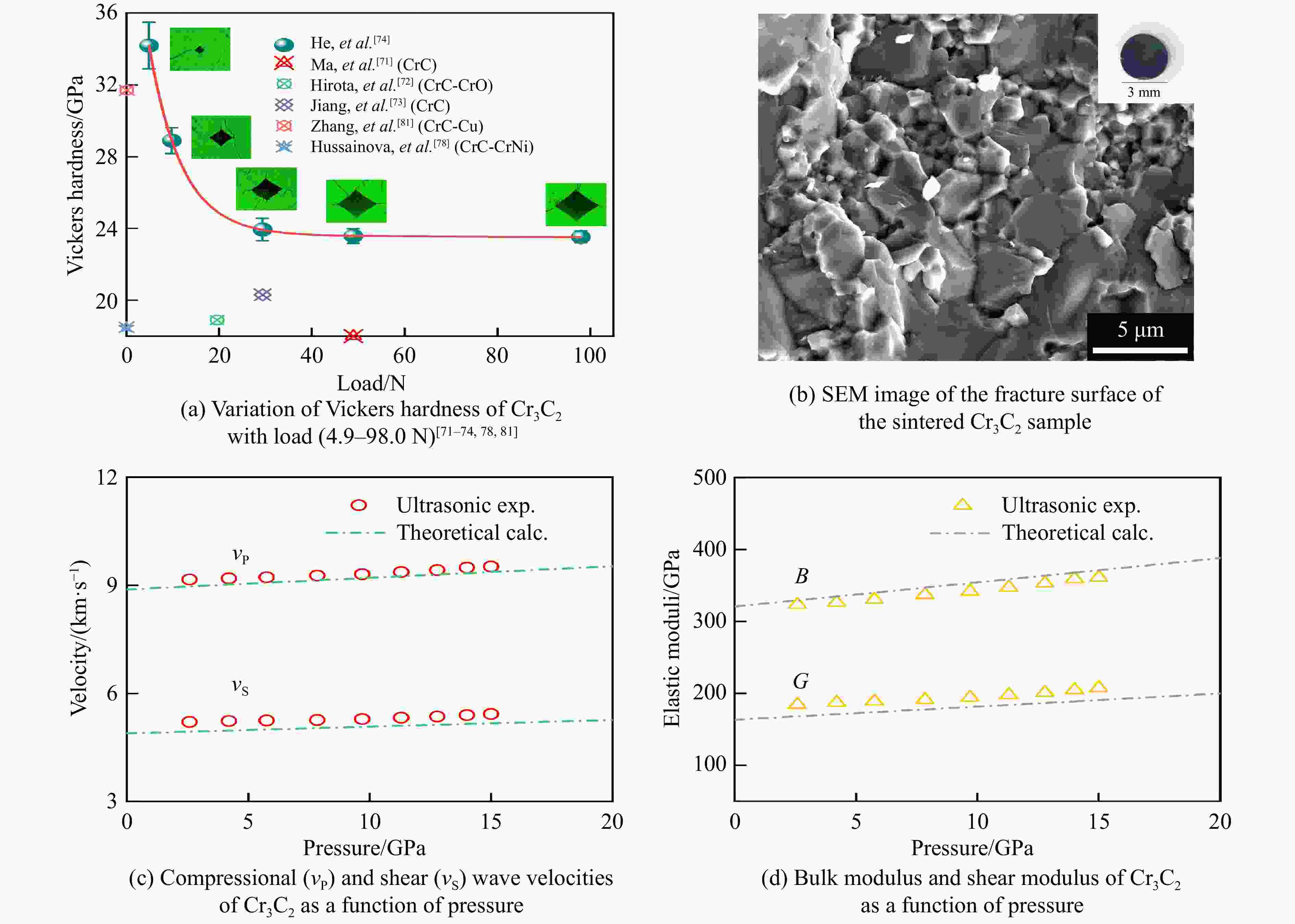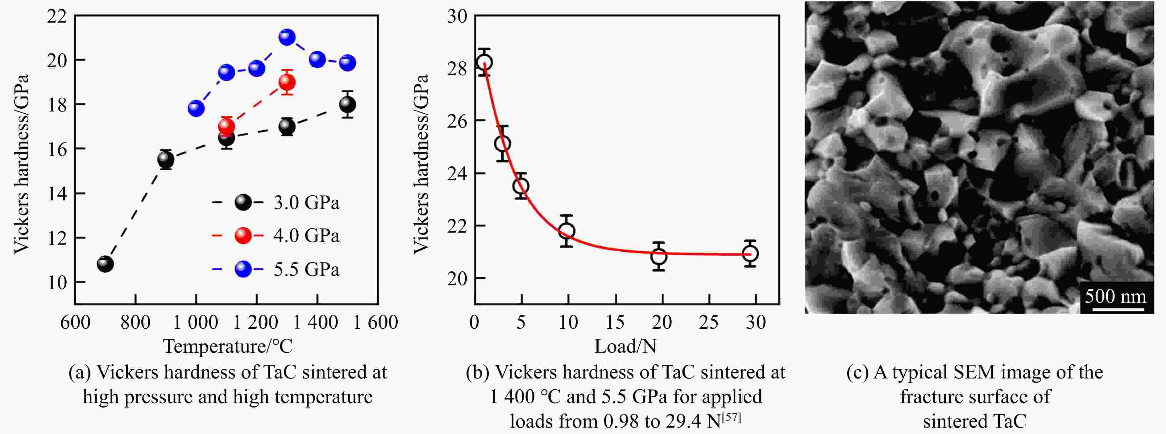 stability/℃TiC SPS 1 650 ℃, 100 MPa[38–39] 25.7/27 97.9/95.1 HFIHS 80 MPa[16] 25.7 99 PS 1 700 ℃[40] 20.3 95.7 HPHT 1 500 ℃, 14 GPa[41] 31.2 4.2 99.7 ZrC SPS 1 850 ℃, 100 MPa[42] 20.4 376 1.8 98 1 800 ℃, 40 MPa[43] 17.6 3.3 95.5 PS 2 100 ℃[89] 8.9 94.4 HPHT 1 300 ℃, 5 GPa[44] 27.4 412 4.3 98.2 713 HfC SPS 2 200 ℃, 65 MPa[31] 19 500 98 2 300 ℃, 38 MPa[13] 10.2 283 2.9 85 HPS 1 900 ℃, 30 MPa[10] 5.79 1.88 89 HPHT 1 700 ℃, 15 GPa[32] 25.8 455 5.5 99.5 860 VC HPHT 1 100 ℃, 5 GPa[59] 30.4 544 5.4 99.8 655 NbC HPHT 1400 ℃, 5 GPa[63]19.2 7.7 99.4 TaC SPS 2 350 ℃, 38 MPa[13] 13.9 458 2.7 98 HPS 2 300 ℃, 30 MPa[52] 14 3 94 2 000 ℃, 40 MPa[54] 15.7 4.1 97 HFIHS 80 MPa[53] 22 5.1 96 HPHT 1 300 ℃, 5.5 GPa[56] 21 457 97.7 Cr3C2 HPS 1 300 ℃, 40 MPa[70] 18.5 5.6 HIP 1 330 ℃, 150 MPa[70] 17 5 GPCS 727 ℃, 100 MPa[71] 18 5.6 PECPS 1 300 ℃, 30 MPa[72] 18.9 7.1 98.9 HPHT 1 700 ℃, 15 GPa[74] 24 459 4.9 99 Mo2C HPS 1 550 ℃, 50 MPa[66] 16 400 100 HPHT 1 100 ℃, 15 GPa[67] 23 397 3.9 99.8 655 WC SPS 1 400 ℃, 80 MPa[88] 27 7.2 99.3 HPHT 1 500 ℃, 5 GPa[85] 29.3 8.9 99.2 1 300 ℃, 10 GPa[86] 33 6.6 -