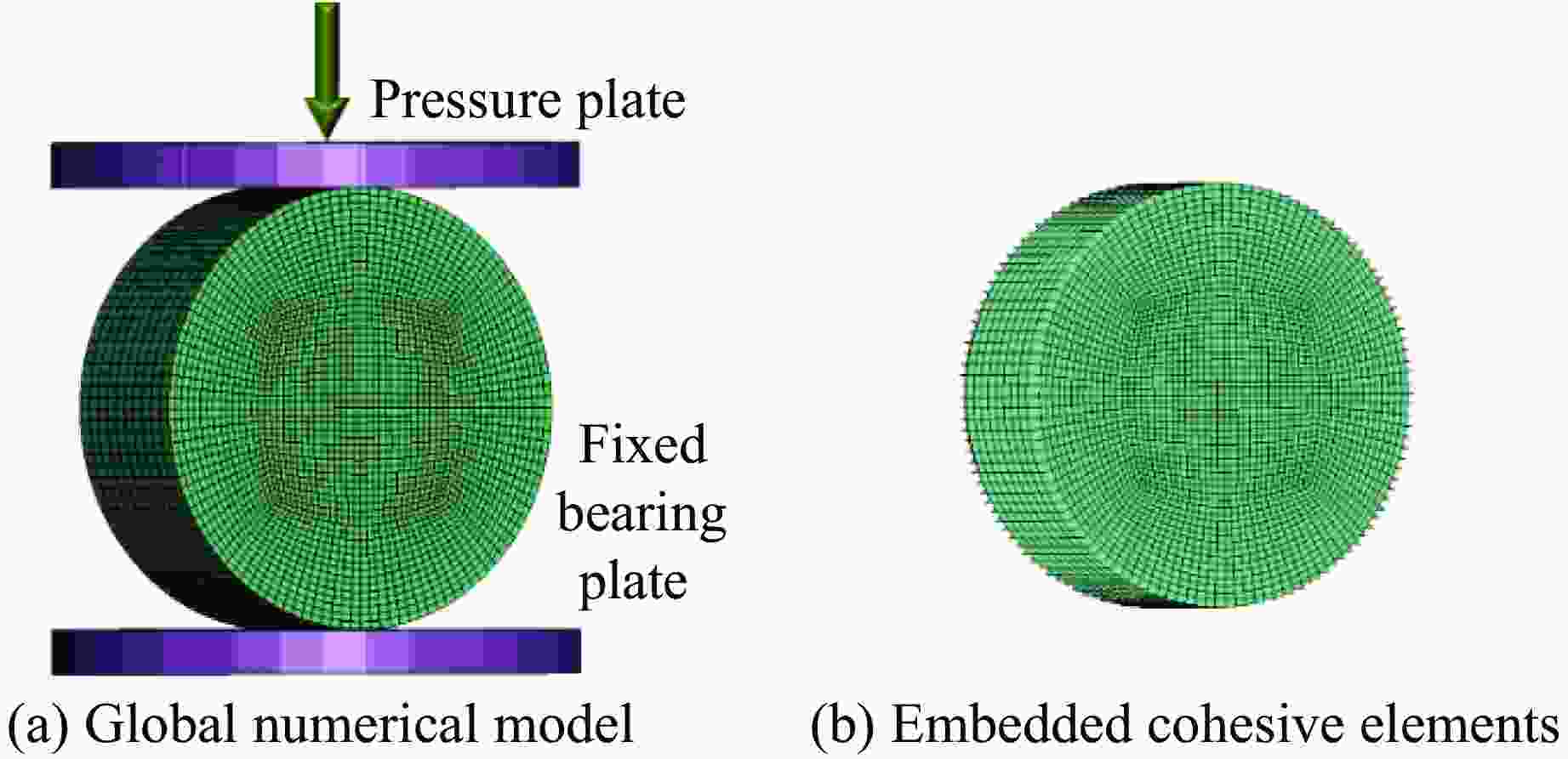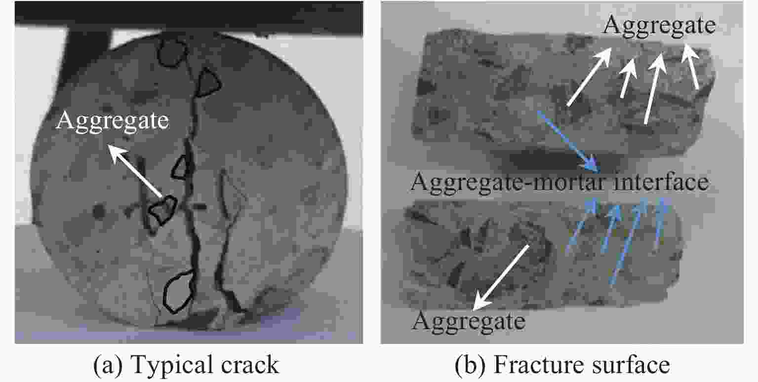 摘要: 为探究混凝土的拉伸断裂特性和裂纹演化规律,开展了巴西圆盘的准静态劈裂试验和落锤冲击动态劈裂试验,结合有限元-黏聚单元耦合法(finite-cohesive element method,FCEM)模拟分析裂纹扩展过程及力学响应。试验结果表明:准静态加载时,混凝土圆盘试件发生拉伸断裂,圆盘中心形成一条沿加载方向贯穿的主裂纹和少量与其平行的次裂纹,裂纹主要在砂浆内部及骨料-砂浆界面扩展;三维圆盘试件的拉伸性能随厚径比的增大而增强。在动态冲击载荷作用下,试件仍为中心起裂模式,即圆盘中心形成一条沿加载方向的主裂纹,边缘则产生三角状破碎区域。随着落锤释放高度的增加,试件的破坏形态依次表现为:未起裂、起裂未贯穿、起裂贯穿和严重破碎。通过高速摄影获得的不同时刻裂纹长度的结果表明,随着落锤释放高度的降低,裂纹扩展时间延长。数值模拟结果显示,试件的起裂时间随落锤释放高度的增加呈非线性递减,并给出了起裂时间与落锤释放高度关系的经验公式。Abstract: To investigate the tensile fracture characteristics and crack evolution mechanisms of concrete, Brazilian disc quasi-static splitting tests and falling weight impact tests were conducted. The crack propagation and mechanical responses were analyzed using the finite cohesive-element method (FCEM). Test results demonstrated that under quasi-static loading, concrete discs exhibited tensile fracture with a primary crack penetrating along the loading direction at the disc center, accompanied by minor parallel secondary cracks. Crack propagation primarily occurred within the mortar matrix and along aggregate-mortar interfaces. The tensile performance of three-dimensional concrete discs exhibited significant enhancement with increasing thickness-diameter ratio. Under dynamic impact loading, specimens maintained a center-initiated fracture pattern, where the main crack propagated along the loading diameter, while triangular crushing zones formed at the edges in contact with testing apparatus. With increasing drop height, the specimens sequentially exhibited four distinct failure modes: no crack initiation, crack initiation without penetration, complete crack penetration, and severe fragmentation. High-speed photography quantified time-dependent crack lengths, demonstrating prolonged crack propagation durations at reduced drop heights. Numerical simulations revealed a nonlinear decreasing trend in crack initiation time versus drop height, with an empirical formula established to describe their relationship.