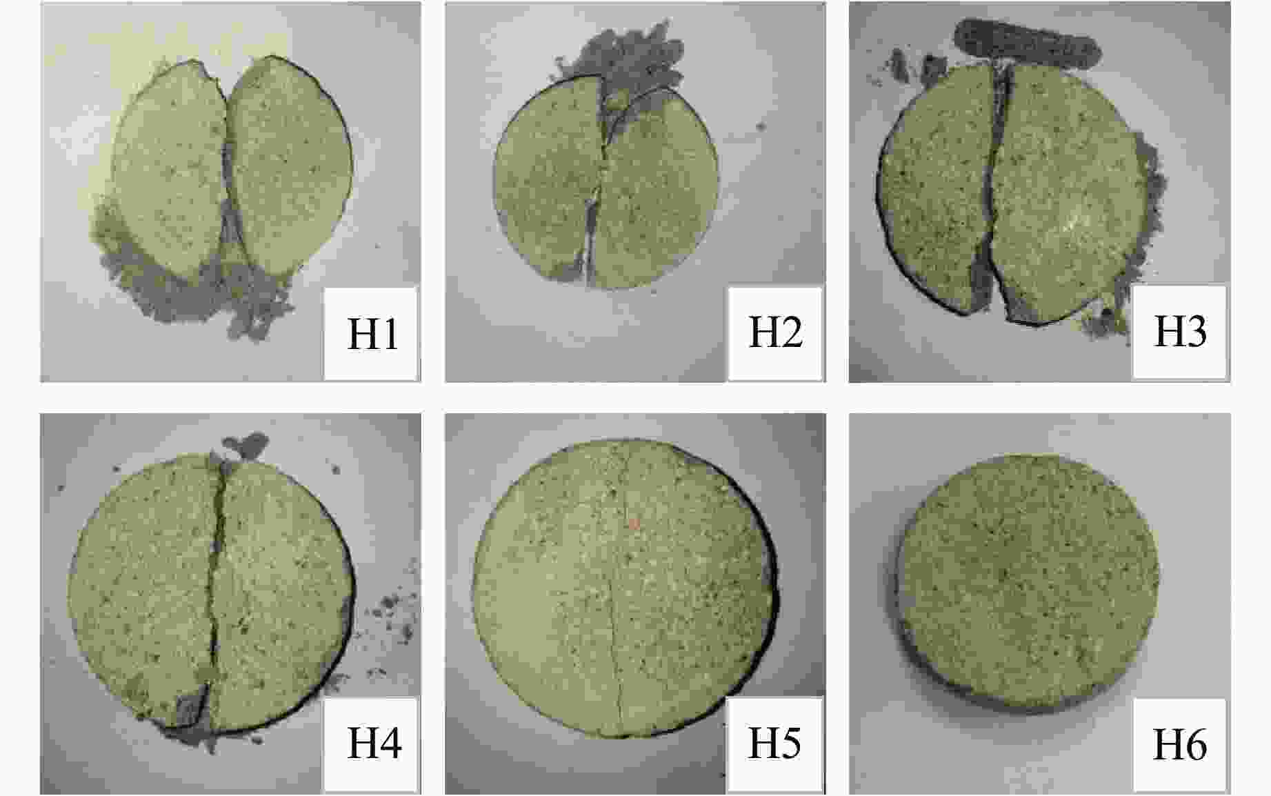 Specimen No. Falling weight mass/kg Height/mm Velocity/(m·s–1) Impact energy/J H1 10 300 2.42 29.40 H2 10 200 1.98 19.60 H3 10 100 1.40 9.80 H4 10 50 0.99 4.90 H5 10 20 0.63 1.96 H6 10 15 0.54 1.47 表 4 落锤冲击试验得到的圆盘起裂时间与裂纹扩展时间