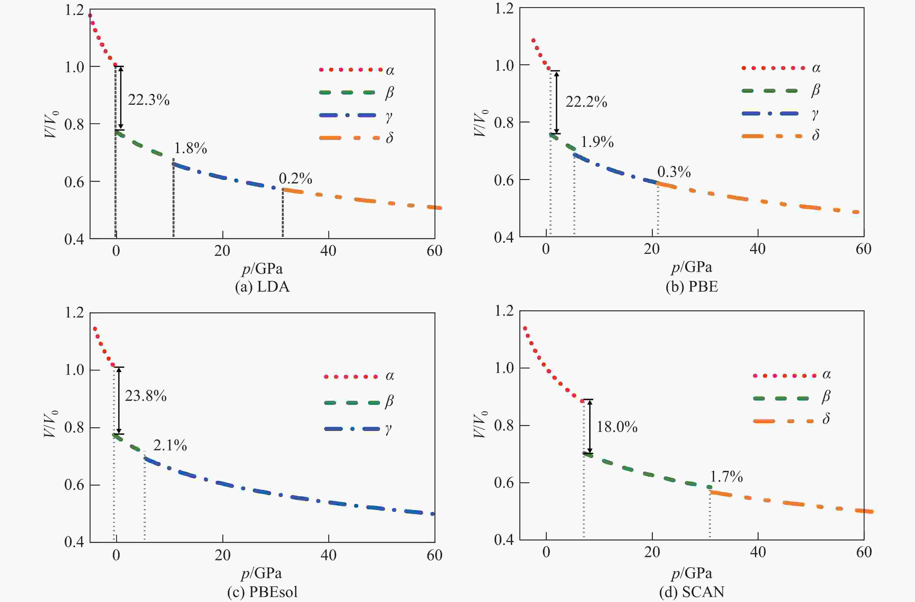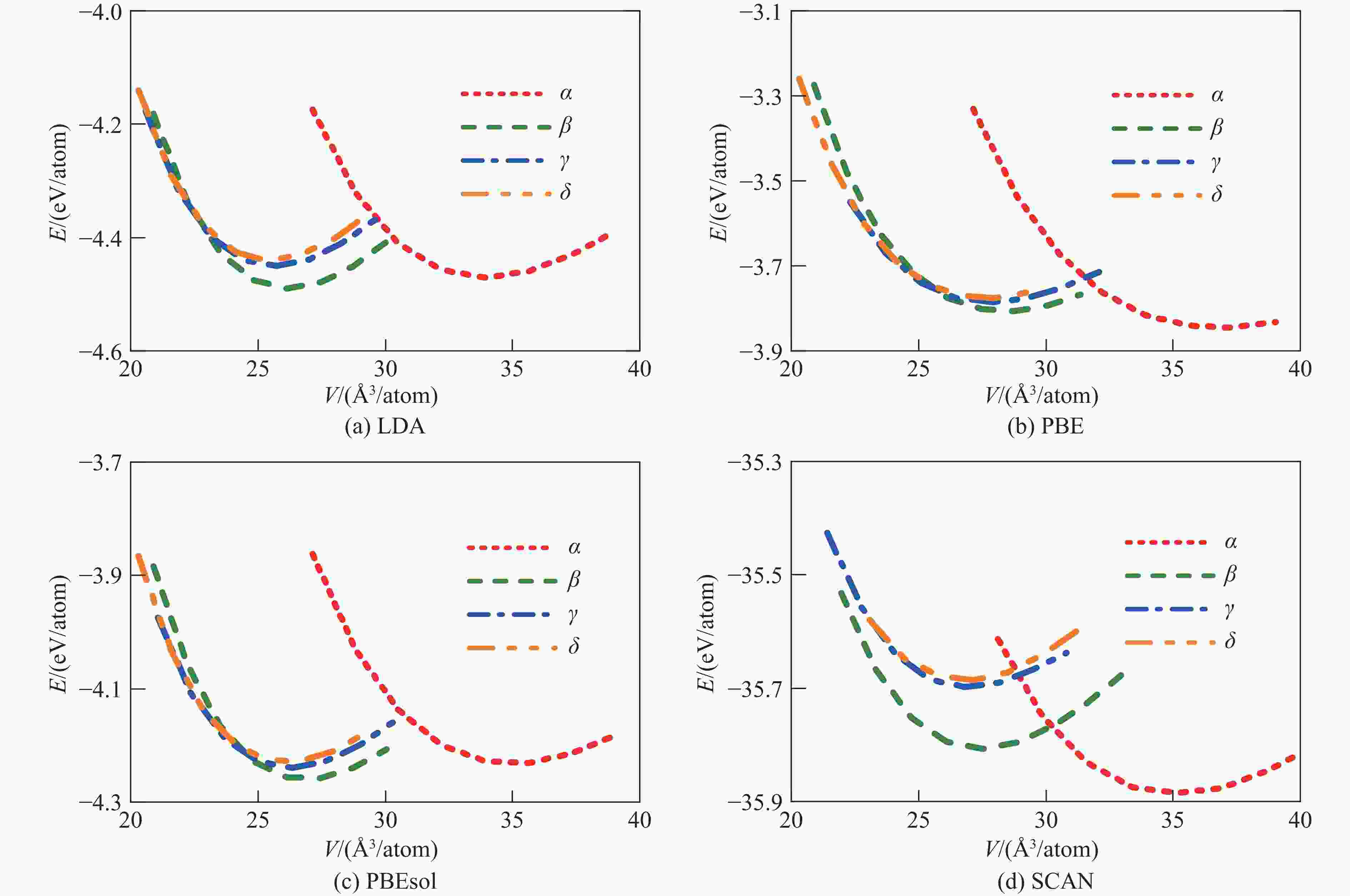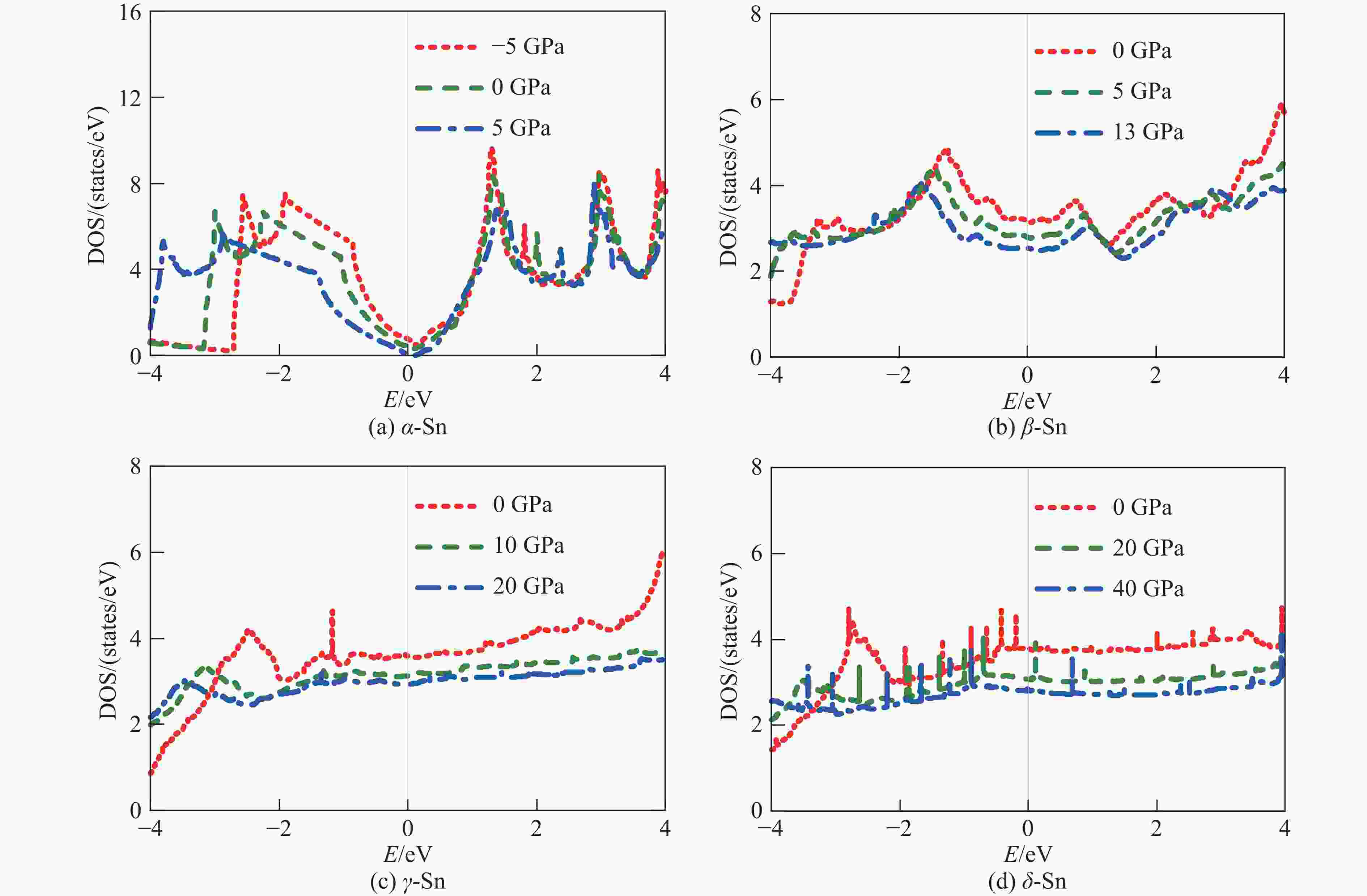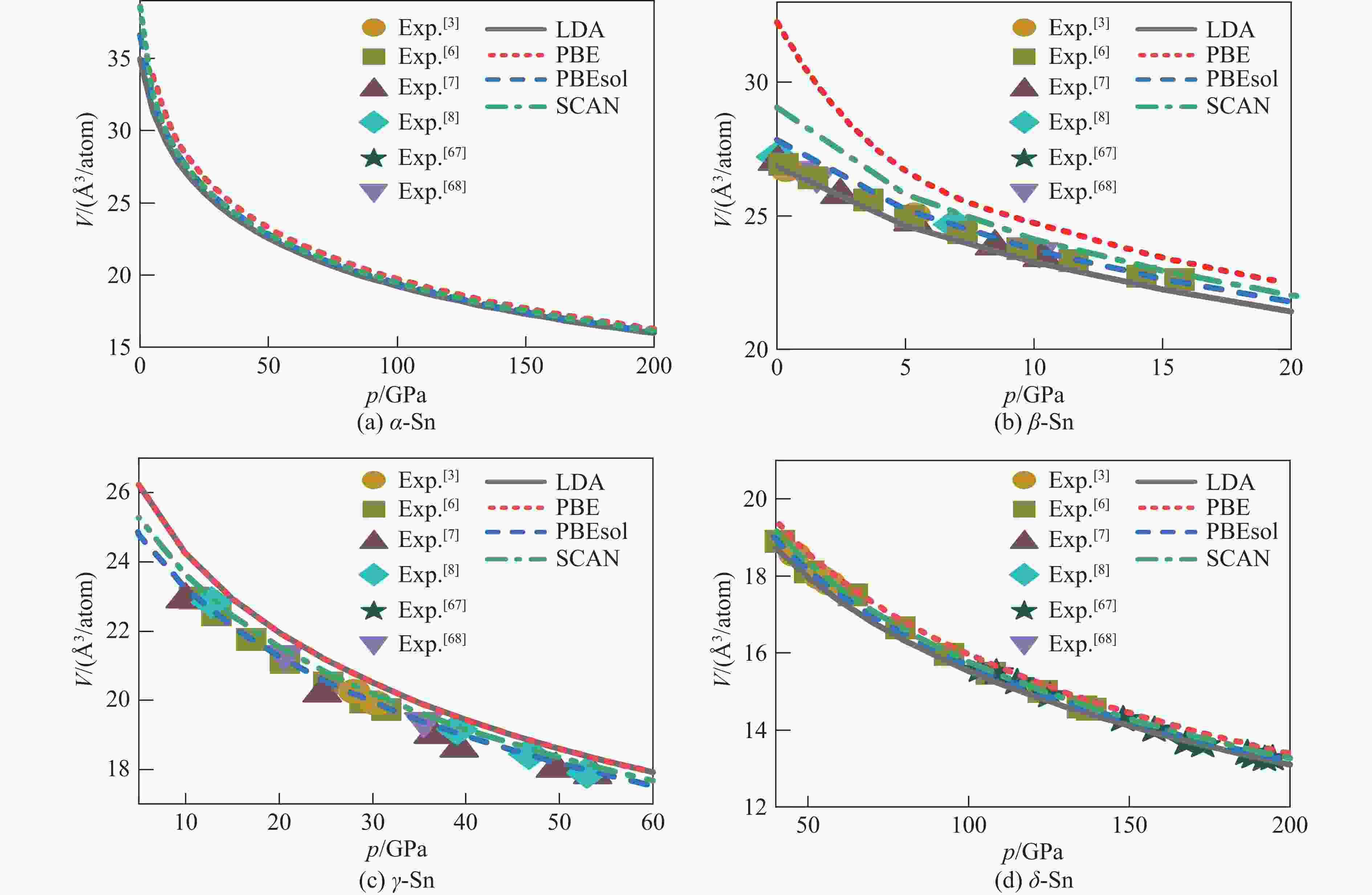 Phase Method a0/Å c0/a0 V0/(Å3/atom) E0/(eV/atom) B0/GPa $B'_0 $ Exp. 6.483[60] 1.000[60] 34.06[60] 3.140[61] 42.6[62] LDA 6.476 1.000 33.94 3.958 45.0 4.9 α-Sn PBE 6.654 1.000 36.83 3.152 35.9 4.8 PBEsol 6.539 1.000 34.95 3.509 41.7 4.8 SCAN 6.549 1.000 35.11 3.414 41.5 4.6 Exp. 5.831[60] 0.546[60] 27.07[60] 3.100[16] 57.0[62] LDA 5.778 0.543 26.19 3.977 60.1 4.8 β-Sn PBE 5.929 0.544 28.40 3.112 47.6 4.8 PBEsol 5.827 0.543 26.87 3.536 56.1 4.8 SCAN 5.868 0.544 27.45 3.335 52.7 4.8 LDA 3.920 0.854 25.63 3.938 57.0 4.9 PBE 4.041 0.846 27.80 3.091 45.5 4.9 γ-Sn PBEsol 3.945 0.859 26.26 3.517 54.3 4.8 SCAN 3.956 0.866 26.99 3.226 47.3 5.2 Exp. 76.4[9] 4.04[9] LDA 3.708 1.000 25.48 3.928 59.4 4.8 δ-Sn PBE 3.809 1.000 27.63 3.081 47.3 4.8 PBEsol 3.738 1.000 26.12 3.507 55.8 4.8 SCAN 3.770 1.000 26.78 3.215 51.4 4.8 表 3 采用4种交换-关联泛函计算得到的Sn的4个相分别稳定存在的压强范围
