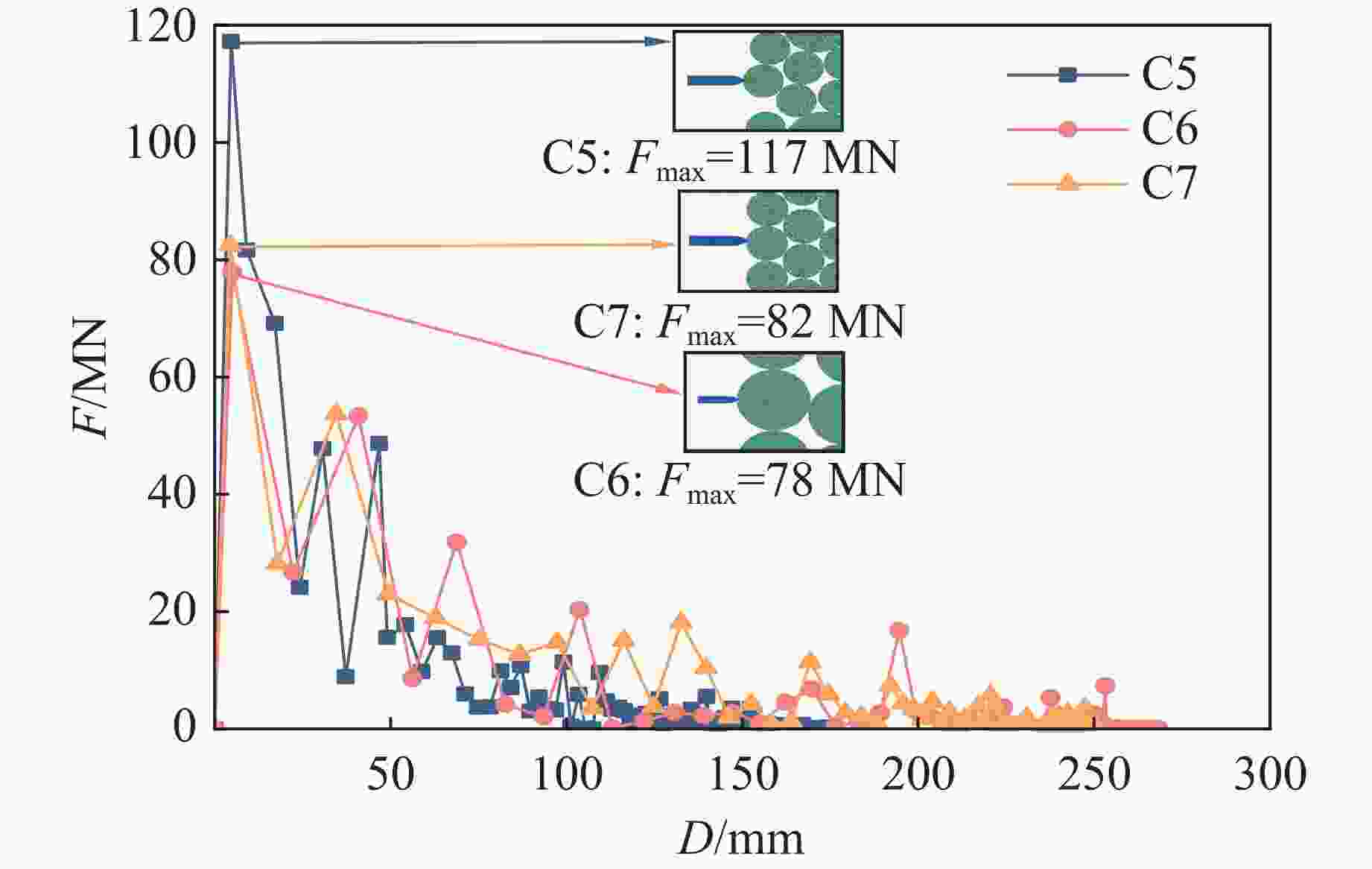 图  不同粒径块石工况下的侵彻阻力-侵彻深度曲线