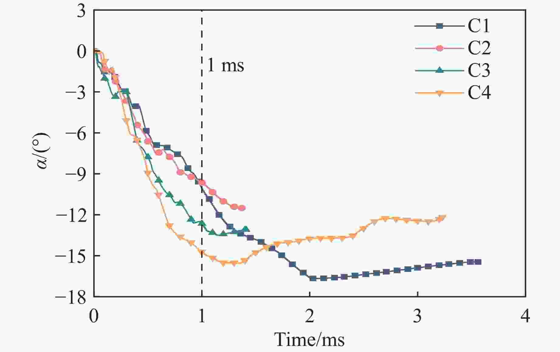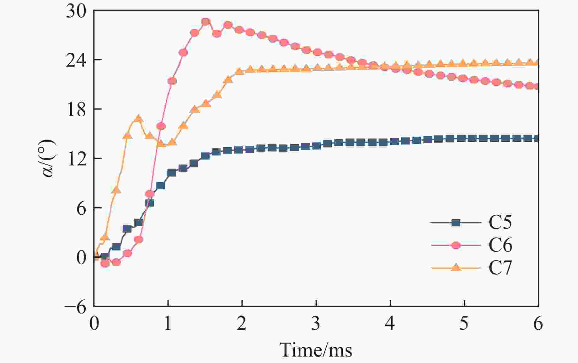 图  23  不同空间排布工况下的弹体偏转角时程曲线