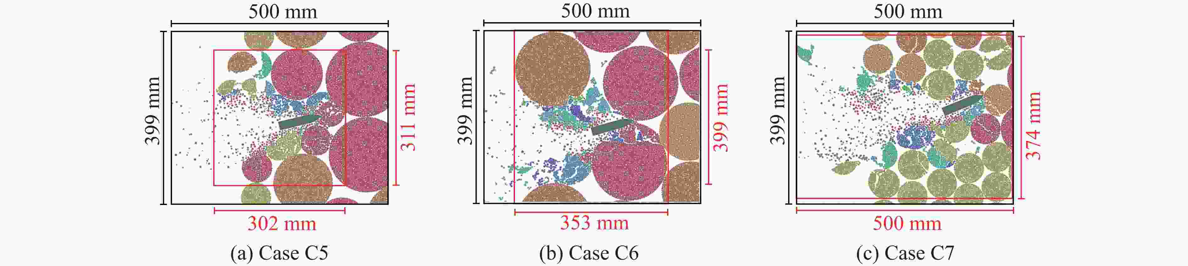 • 摘要: 遮弹层作为现代军事防御体系的关键组成部分,可为后方重要目标提供防护。块石作为遮弹层的常用堆筑材料,其遮弹机理及性能优化研究具有重要意义。采用离散元球体单元和黏结破碎模型,模拟了块石在弹体冲击载荷下的破碎现象,并对刚性弹正侵彻密实堆积的块石结构进行了数值模拟,探讨了块石粒径、形状及空间排布特性对其抗侵彻性能的影响。结果表明:在侵彻过程中,块石通过碰撞和滑移耗散了90%以上的弹体动能;块石破碎数量与块石粒径呈负相关,与块石长短轴比呈正相关;采用单粒径块石多层位错排布时,弹体侵彻深度主要取决于侵彻阻力峰值,粒径为120 mm的圆形块石工况的侵彻阻力最大且侵彻深度最小;采用块石粒径沿迎弹面方向梯度递减的分层排布时,不能有效提高结构体的遮弹效果。研究结果可为理解块石遮弹机理提供参考。