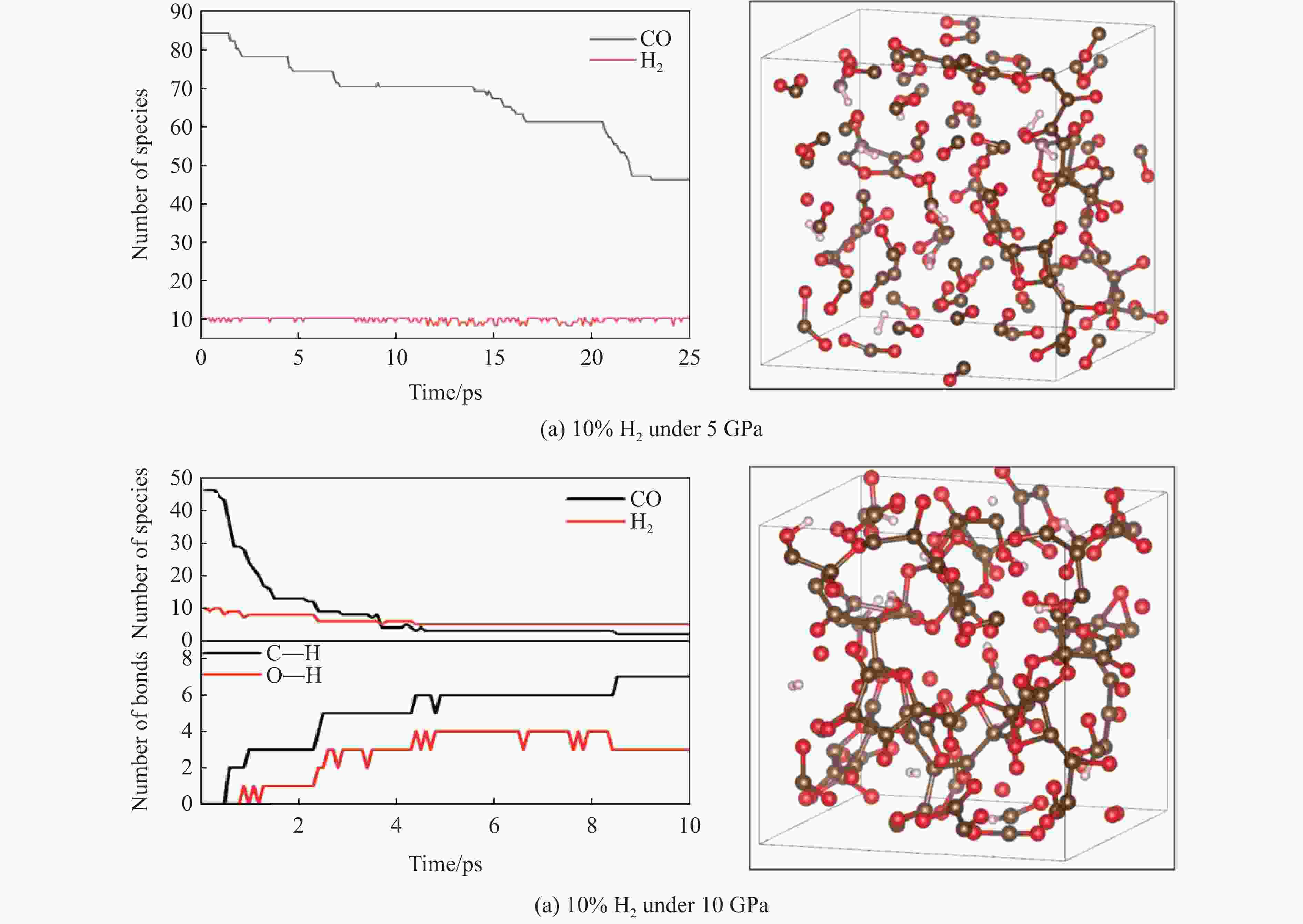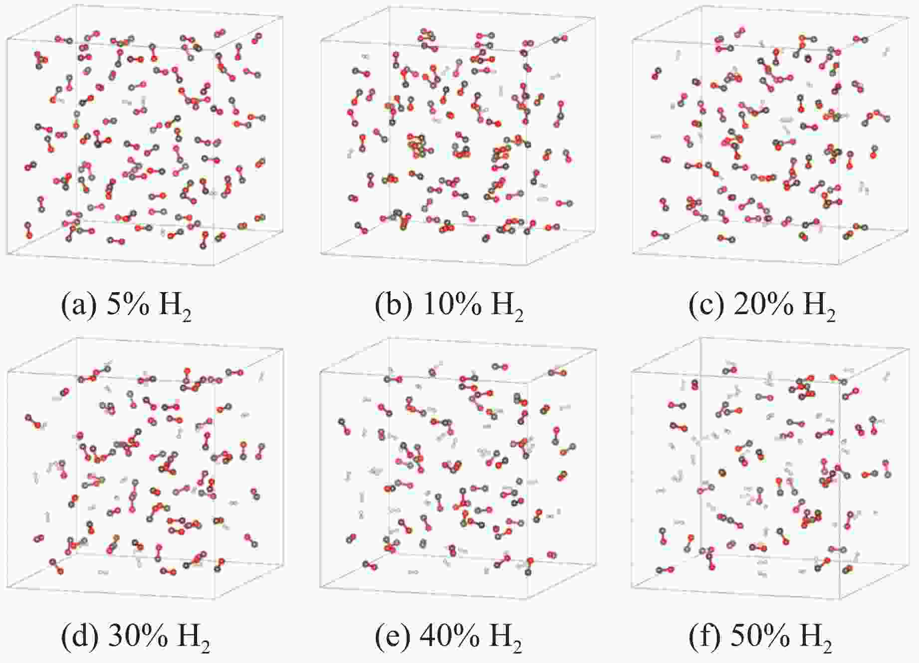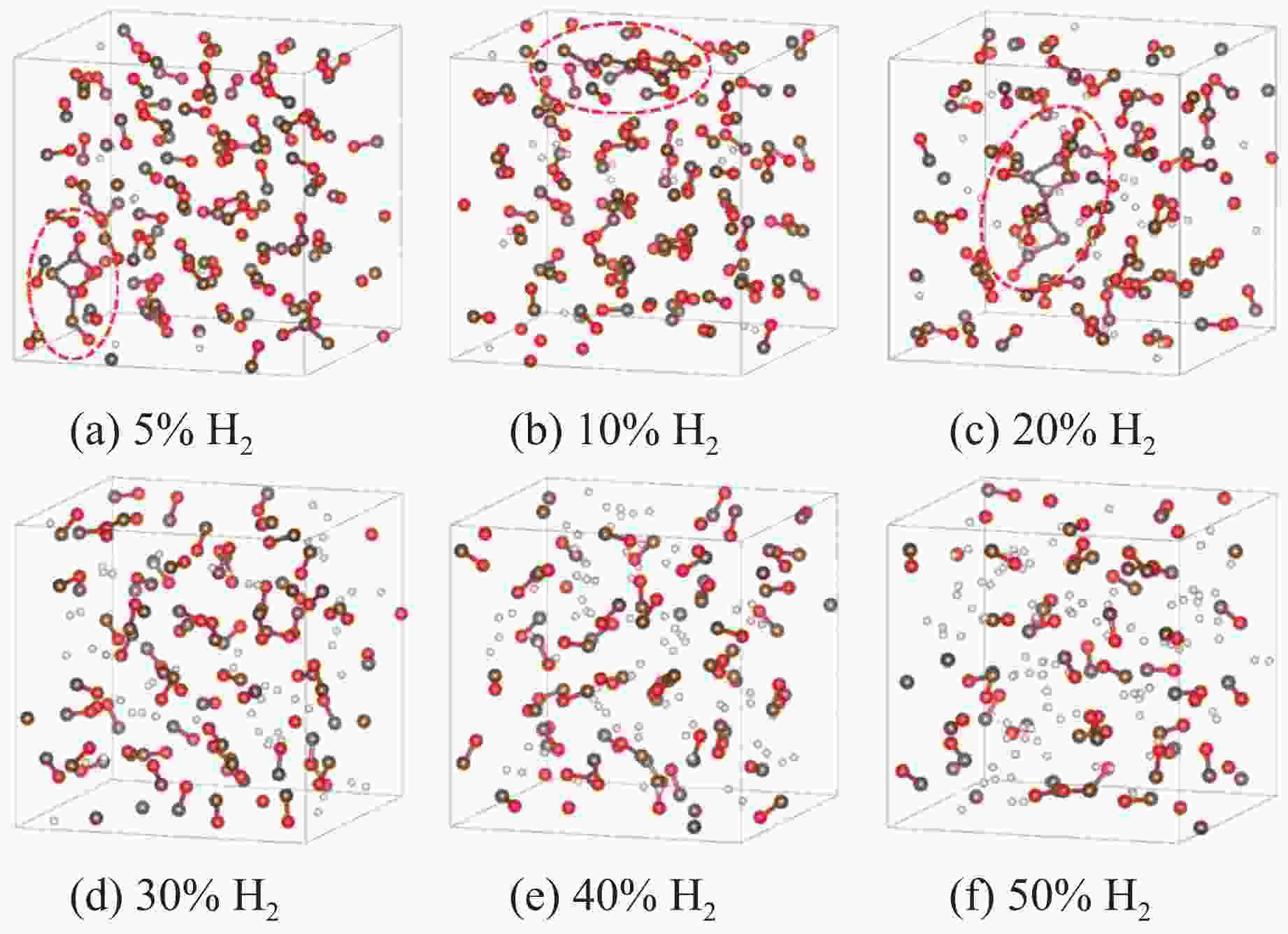 • 图  不同H2摩尔分数的H2/CO混合体系结构模型(褐色球为C,红色球为O,白色球为H)