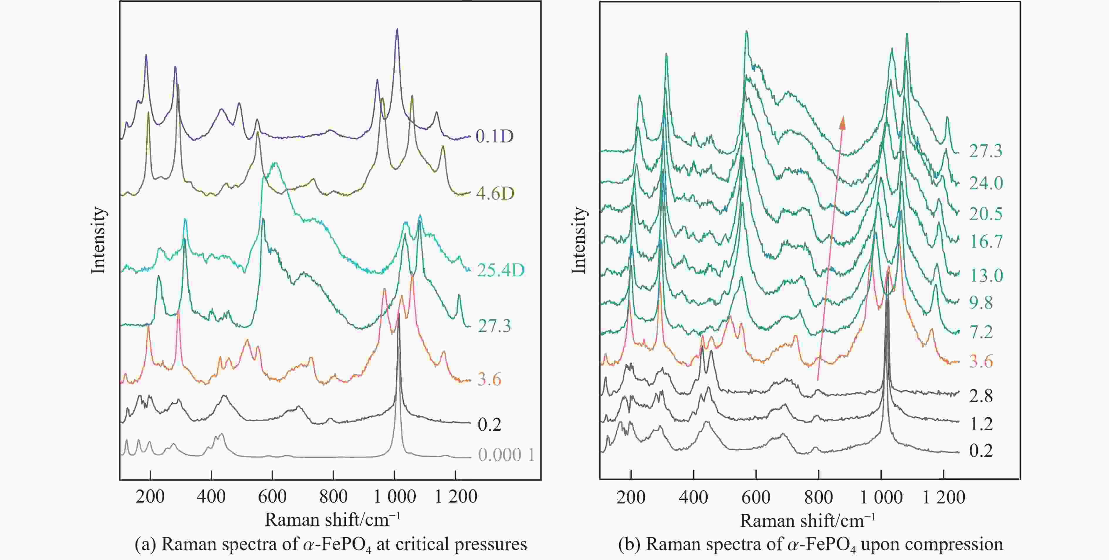摘要: 鉴于α-FePO4和α-石英的拓扑同构性,采用金刚石压腔结合拉曼光谱技术,从分子尺度上原位厘定了α-FePO4在常温高压下的相变行为。在0.2~27.3 GPa压力范围内,揭示了其3个阶段的结构演化特征。在2.8~3.6 GPa区间,α-FePO4开始发生相变,并于4.6 GPa时完全转变为FePO4-Ⅱ。在宽泛的4.6~27.3 GPa区间,FePO4-Ⅱ的结构稳定/亚稳定性依赖于柔性[FeO6]八面体与刚性[PO4]四面体的协同形变。在该压力区间,结构无序度增加,振动频率漂移速率减缓,表明结构进入非线性压缩阶段。值得注意的是,在9.8~11.1 GPa临界窗口,P―O键的平均键长和部分振动峰半高宽出现不连续变化,暗示[FeO6]-[PO4]网络中存在压力诱导的非均匀应变,推测FePO4-Ⅱ开始进入亚稳定域。直到卸压至4.6 GPa,FePO4-Ⅱ的部分结构才恢复有序性,并在常压下保持亚稳态,表现出独特的结构记忆功能。研究结果系统地限定了α-FePO4的相变压力边界,阐明了正磷酸盐高压结构稳定性的内在调控机制,并预测了其未来结构演化趋势,为解析类石英矿物的高压动态响应提供了重要参考。Abstract: Given the topological isomorphism between α-FePO4 and α-quartz, this study employed a diamond anvil cell coupled with Raman spectroscopy to examine the phase transition of α-FePO4. The structural evolution across a pressure range of 0.2−27.3 GPa was delineated into three stages. At 2.8−3.6 GPa, α-FePO4 initiates a phase transition, achieving a complete transformation to FePO4-Ⅱ at 4.6 GPa. Between 4.6−27.3 GPa, the (meta) stability of FePO4-Ⅱ is predicated on the cooperative deformation of the adaptable [FeO6] octahedra and the rigid [PO4] tetrahedra. The progressive increase in structural disorder and the slowing of vibrational frequency shifts signify a transition to a non-linear compression regime. Notably, in the 9.8−11.1 GPa threshold, discontinuous variations in P―O bond lengths and mode widths serve as evidences of pressure-induced heterogeneous strain within the [FeO6]-[PO4] network, suggesting entry into a metastable region. Upon decompression to 4.6 GPa, FePO4-Ⅱ exhibits partial recovery of structural order, maintaining metastability at ambient conditions, which underscores its unique pressure memory characteristics. This study demarcates the stability boundary of α-FePO4, elucidates the fundamental mechanisms underpinning stability in orthophosphates, and forecasts structural evolution pathways. The findings offer insights into high-pressure dynamic response of quartz-like minerals.