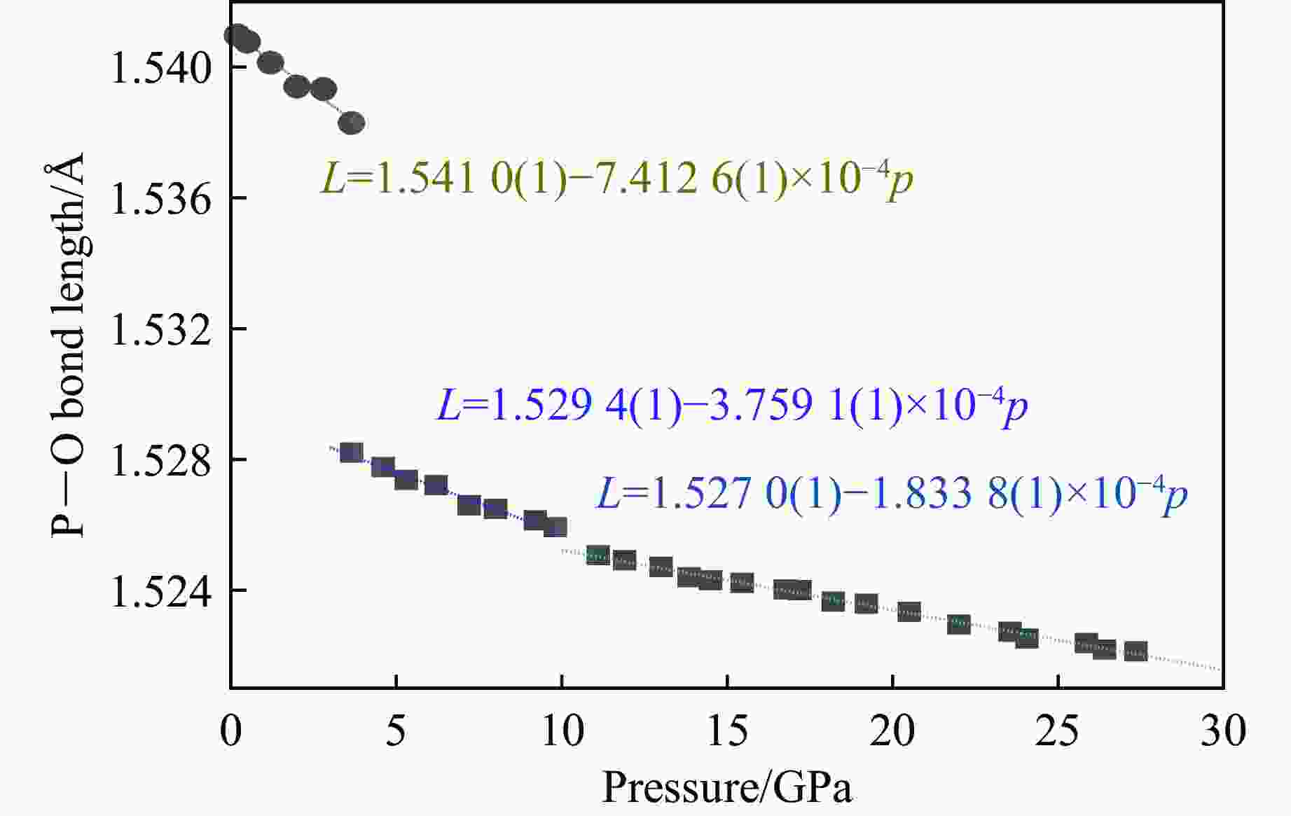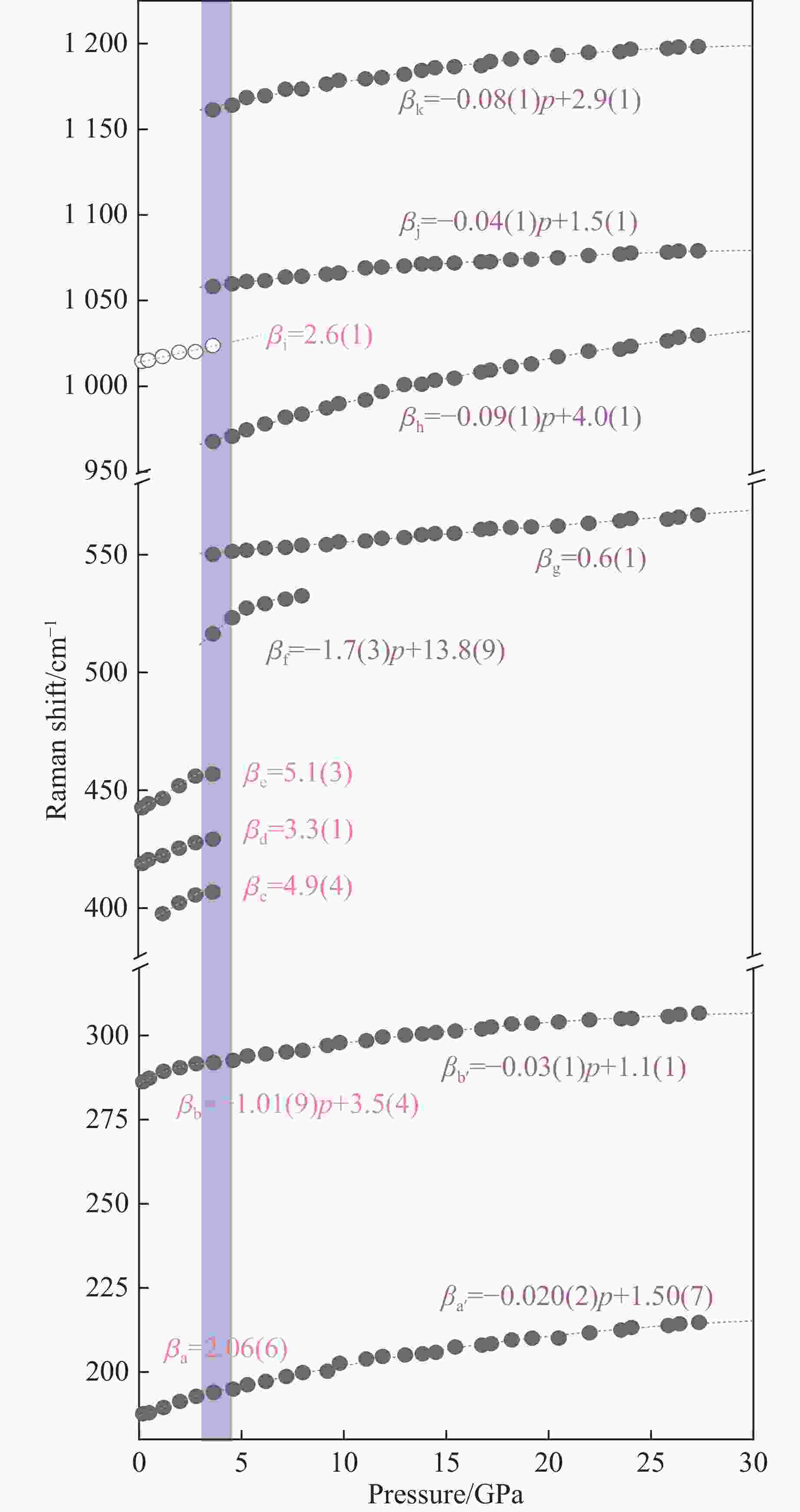 cm−1νc/cm−1 νd/cm−1 νe/cm−1 νf/cm−1 νg/cm−1 10−4 186.70(1) 6.8(1) 284.89(1) 7.4(1) 389.98(1) 415.99(1) 439.61(1) 0.2 187.55(1) 13.1(1) 286.24(1) 11.9(1) 418.87(1) 442.53(1) 0.5 187.90(1) 11.3(1) 287.27(1) 11.0(1) 420.55(1) 444.29(1) 1.2 189.45(1) 9.8(1) 289.33(1) 12.4(1) 397.59(1) 422.21(1) 446.54(1) 2.0 191.25(1) 10.3(1) 290.39(1) 11.5(1) 402.20(1) 425.39(1) 451.92(1) 2.8 192.77(1) 11.6(1) 291.58(1) 12.7(1) 405.51(1) 427.74(1) 455.99(1) 3.6 193.95(1) 12.7(1) 291.93(1) 11.2(1) 406.79(1) 429.17(1) 456.85(1) 516.39(1) 550.13(1) 4.6 194.88(1) 13.4(1) 292.57(1) 12.5(1) 523.21(1) 551.41(1) 5.3 196.21(1) 12.2(1) 293.91(1) 10.9(1) 527.35(1) 551.88(1) 6.2 197.20(1) 11.7(1) 294.49(1) 11.5(1) 529.14(1) 552.78(1) 7.2 198.66(1) 12.9(1) 295.08(1) 12.4(1) 531.08(1) 553.03(1) 8.0 199.80(1) 11.5(1) 295.55(1) 12.8(1) 532.51(1) 553.99(1) 9.2 200.22(1) 12.8(2) 297.00(1) 11.8(1) 554.27(1) 9.8 202.60(1) 13.9(1) 297.89(1) 10.9(1) 555.51(1) 11.1 203.84(1) 10.9(1) 298.46(1) 12.8(1) 555.83(1) 11.9 204.62(1) 13.0(2) 299.56(1) 13.5(1) 556.92(1) 13.0 205.06(1) 12.2(1) 300.12(1) 13.8(1) 557.22(1) 13.8 205.42(1) 15.9(2) 300.45(1) 13.2(1) 558.42(2) 14.5 205.82(1) 13.5(2) 300.85(1) 12.3(1) 558.92(1) 15.4 207.44(1) 16.8(2) 301.31(1) 11.6(1) 559.02(2) 16.7 207.98(1) 18.1(2) 301.88(1) 11.2(1) 560.70(1) 17.2 208.42(1) 15.4(2) 302.53(1) 12.7(1) 561.07(1) 18.2 209.53(1) 18.6(1) 303.45(1) 10.9(1) 561.52(3) 19.2 210.02(1) 16.3(2) 303.62(1) 11.5(1) 561.77(1) 20.5 210.08(1) 18.9(2) 303.98(1) 12.8(1) 562.12(3) 22.0 211.62(1) 20.6(3) 304.63(1) 13.2(1) 563.32(2) 23.5 212.45(1) 19.3(2) 304.93(1) 12.5(1) 564.38(2) 24.0 213.19(1) 21.0(2) 305.06(1) 12.8(1) 565.32(2) 25.8 213.82(1) 19.3(2) 305.62(1) 11.2(1) 564.99(1) 26.4 214.31(1) 20.5(3) 306.24(1) 13.9(1) 565.92(1) 27.3 214.72(1) 18.8(3) 306.62(1) 11.7(1) 566.85(3) 表 2 不同压力下α-FePO4或FePO4-Ⅱ的拉曼振动峰峰位和半高宽(900~