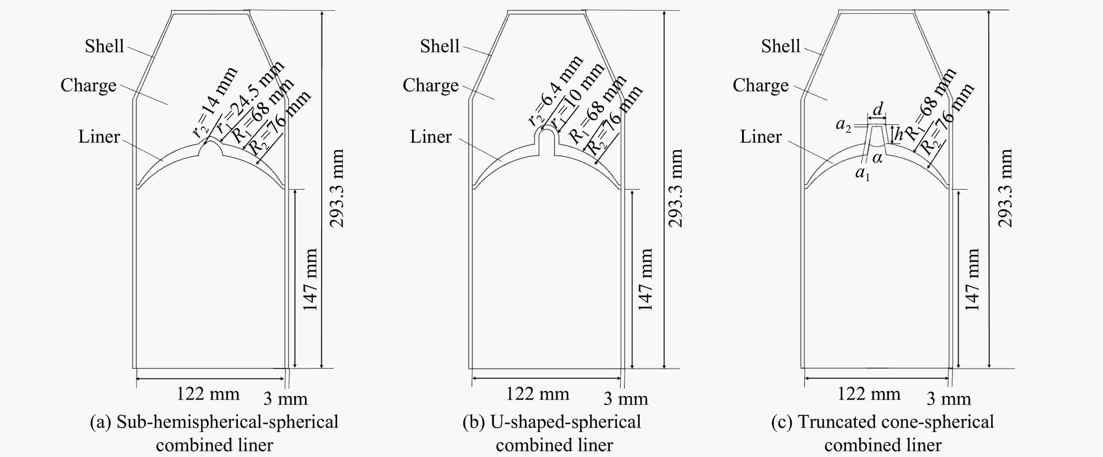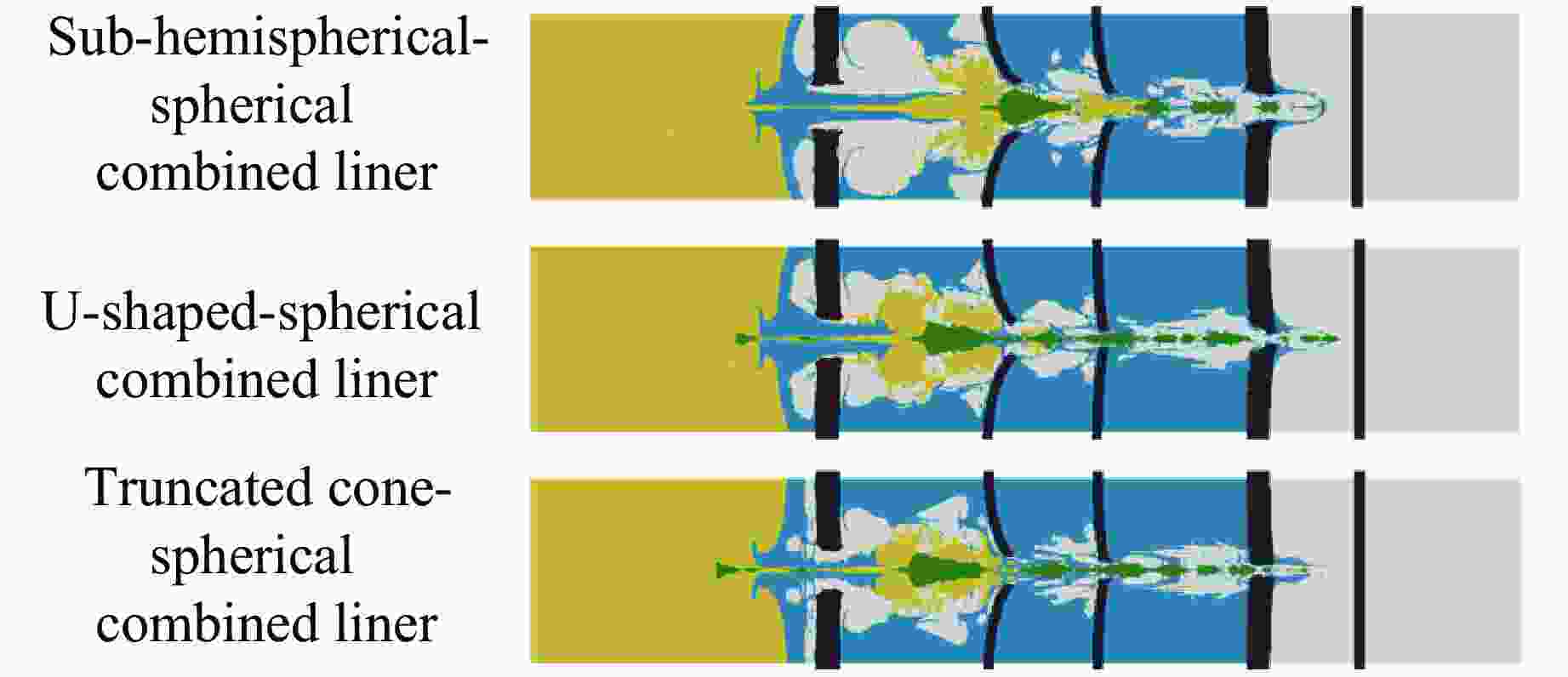 Type of liner Cavity channel area/cm2 Proportion of aqueous media/% Sub-hemispherical-spherical combined liner 147.12 34.2 U-shaped-spherical combined liner 113.60 26.4 Truncated cone-spherical combined liner 100.90 23.4 表 8 射流剩余动能和射流剩余速度