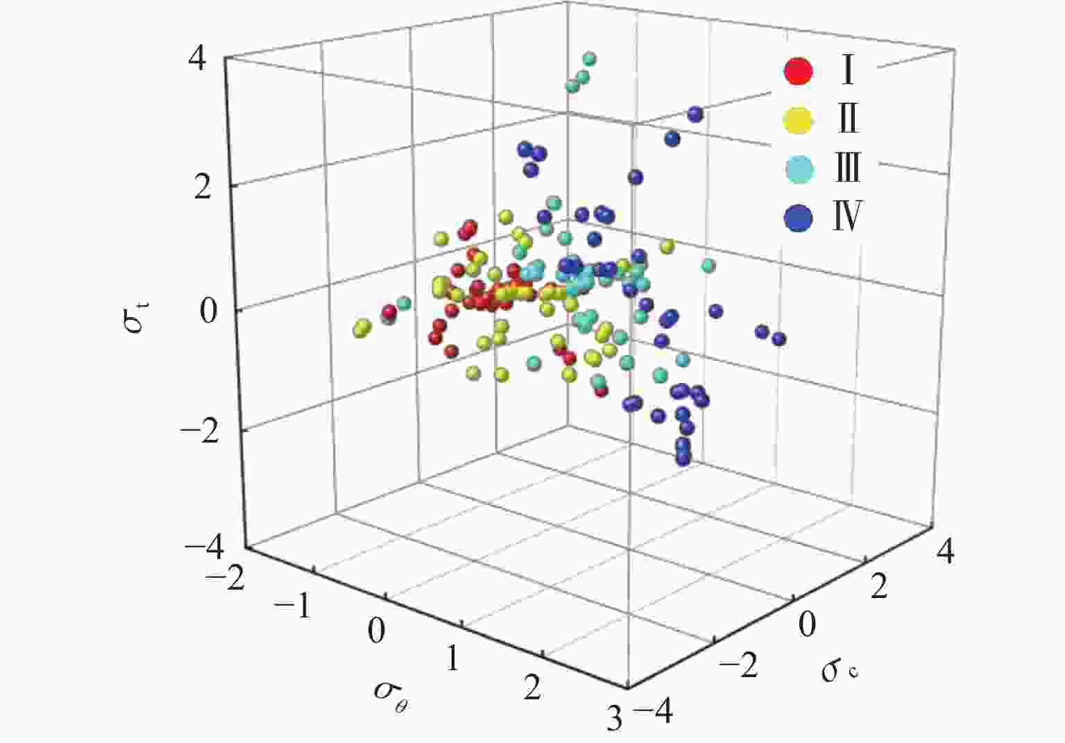 Serial No. σθ σc σt Rock burst level 1 −1.12 −0.57 −0.17 Ⅰ 2 −1.51 −1.40 −0.44 Ⅰ 3 0.24 1.69 0.22 Ⅲ … … … … … 167 1.46 2.46 −0.73 Ⅳ 168 2.12 −0.96 −1.72 Ⅳ 表 7 XGBoost超参数的初始值和预定的搜索范围