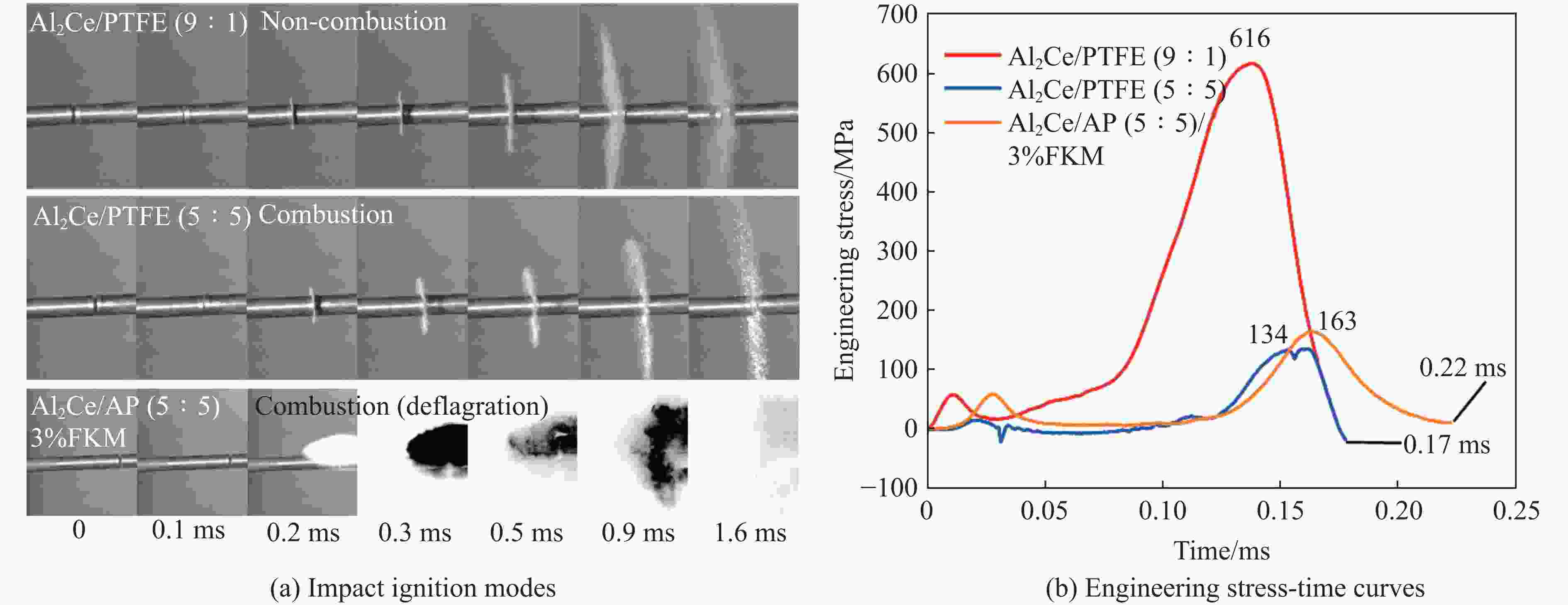 摘要: 金属铝(Al)作为常用的活性金属之一被广泛应用于活性材料体系中,但Al存在反应活性偏低制约体系能量释放的问题。为此,将铝铈合金引入反应体系中,利用稀土铈的高反应活性的特性强化铝的反应活性。为研究稀土基活性材料在冲击过载下的力学特性和点火性能,开展了Al2Ce/PTFE、Al/PTFE、Al2Ce/高氧酸铵(AP)、Al/AP 4种活性材料体系的制备和表征,通过分离式霍普金森压杆实验系统动态加载,测量了4种活性材料体系的动态应力-应变曲线、点火延迟、燃烧持续时间等性能;通过热分析测试,分析了不同含量活性金属对AP的热分解性能的影响。结果表明:4种活性材料存在未燃烧、燃烧和爆燃3种冲击点火形态;Al2Ce/PTFE和Al/PTFE材料的点火性能较差;Al2Ce/AP体系的极限强度和临界失效应变较高,且冲击点火形态为爆燃,点火延迟和持续燃烧时间均低于Al/AP体系;Ce元素的引入加速了AP的分解,并使Al2Ce/AP体系的焓值大幅提高,能量释放更集中。Ce元素可以有效地提高金属铝的反应活性,其高反应活性的特性使活性体系材料的反应进程加速,并显著强化活性材料体系在冲击作用下的能量释放。综上所述,稀土铝合金材料因具有高反应活性优势,对于研制铝基冲击反应材料具有重要意义。Abstract: Aluminum (Al), a commonly used reactive metals, is widely applied in reactive material systems. However, its relatively low reactivity restricts the energy release of systems. To improve the reactivity of aluminum, we introduced aluminum-cerium Al-Ce alloy containing the highly reactive rare earth element cerium into the system. The present study investigated the mechanical properties and ignition performance of four reactive material systems involving Al2Ce/PTFE, Al/PTFE, Al2Ce/ammonium perchlorate (AP), and Al/AP were investigated under shock overload. A split Hopkinson pressure bar (SHPB) system was used to reveal the dynamic stress-strain behavior, ignition delay, and combustion duration of the prepared samples. Thermal analysis was conducted to assess the influence of the reactive metal content on the thermal decomposition of AP. The results showed there are three distinct shock-induced ignition modes: non-ignition, combustion, and combustion (deflagration). Both Al2Ce/PTFE and Al/PTFE exhibited substandard ignition performance. The Al2Ce/AP system demonstrates higher ultimate strength and critical failure strain, achieving deflagration upon impact with significantly shorter ignition delay and combustion duration compared to Al/AP. The incorporation of the cerium accelerates AP decomposition and substantially increased the enthalpy of the Al2Ce/AP system, resulting in more concentrated energy release. Ce effectively enhances the reactivity of aluminum, and its high reactivity accelerates the reaction kinetics of the reactive system. Furthermore, it significantly intensifies energy release under impact loading. In conclusion, the rare earth aluminum alloy materials exhibit a high reactivity, which demonstrates significant potential for the development of aluminum-based impact reaction materials.