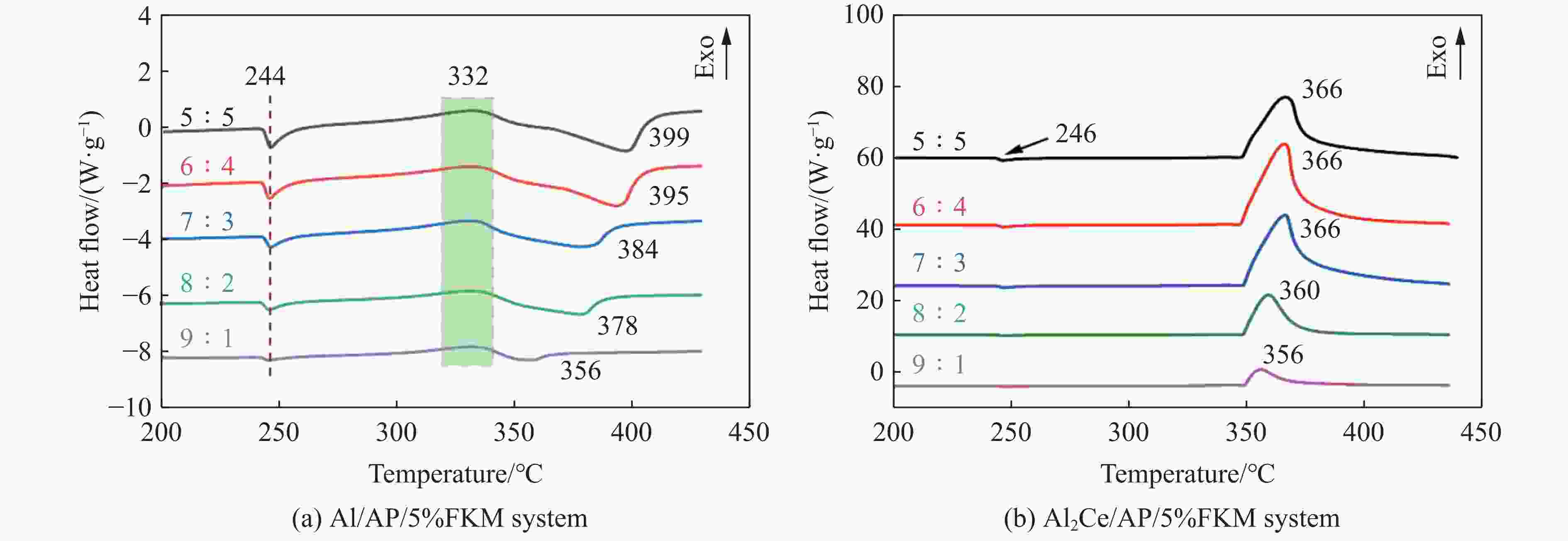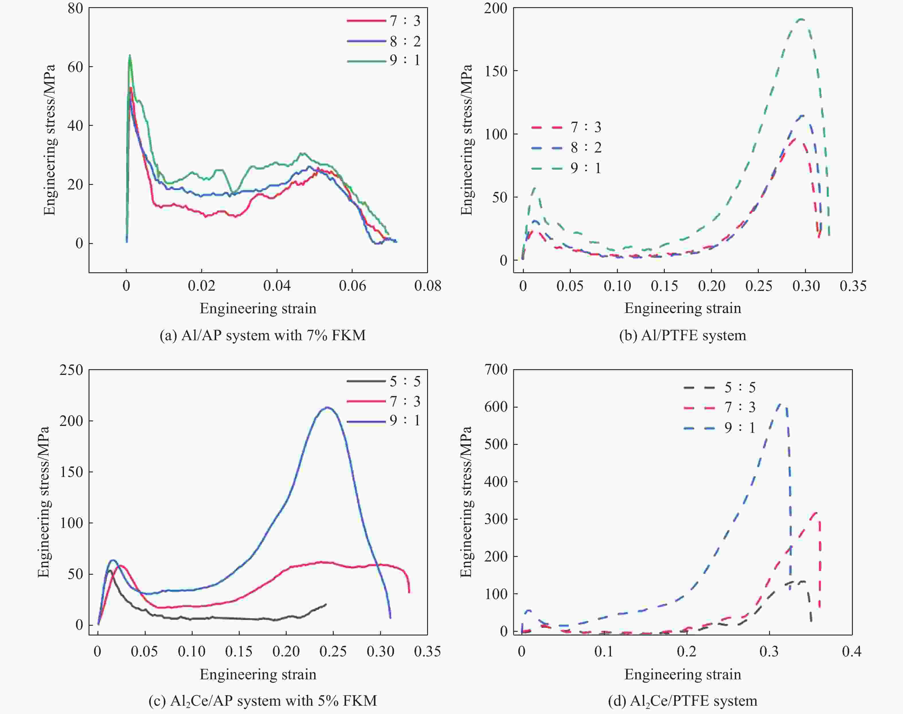Material Mass ratio Yield strength/MPa Ultimate strength/MPa Critical failure strain Al/AP system with 7% FKM 7∶3 52.82 25.74 0.05 8∶2 51.56 26.08 0.05 9∶1 63.91 30.66 0.05 Al/PTFE system 7∶3 24.68 97.39 0.29 8∶2 31.36 114.53 0.30 9∶1 57.30 191.00 0.30 Al2Ce/AP system with 5% FKM 5∶5 53.27 7∶3 58.27 61.91 0.24 9∶1 63.56 212.32 0.25 Al2Ce/PTFE system 5∶5 13.31 132.98 0.33 7∶3 16.93 318.90 0.36 9∶1 56.44 612.35 0.32 -
