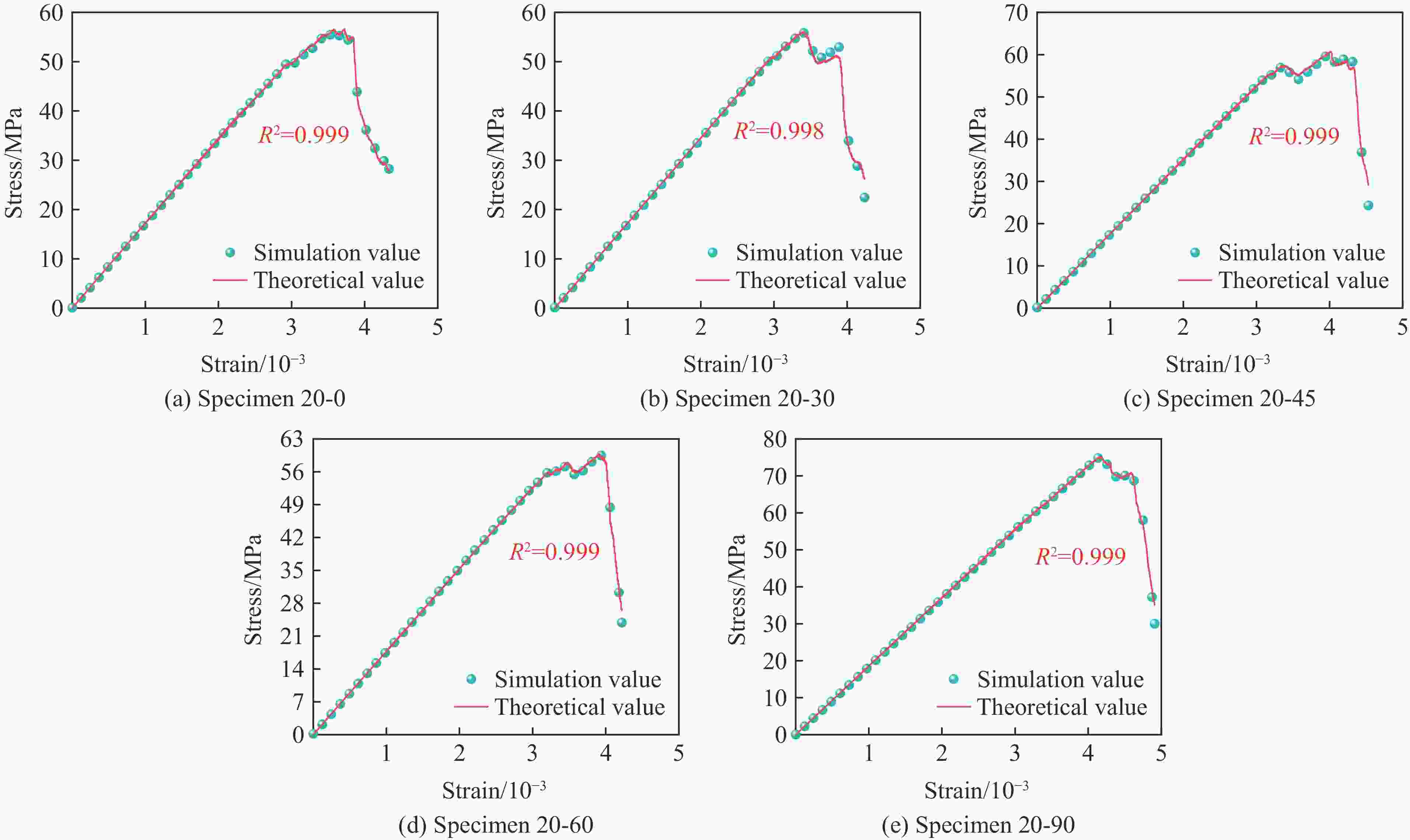 Specimen No. m ω λ ϕ R2 10-0 0.001 −0.364 78.839 −0.242 0.999 10-30 −0.632 −0.145 29.205 −0.116 0.999 10-45 −1.021 −0.374 108.360 −0.460 0.999 10-60 −0.032 −0.027 6.610 −0.018 0.999 10-90 −0.515 −0.322 89.375 −0.381 0.999 20-0 −0.212 −0.066 15.181 −0.062 0.999 20-30 −0.016 −0.040 7.050 −0.019 0.998 20-45 −0.290 −0.225 53.109 −0.139 0.998 20-60 −4.647 −1.272 316.756 −1.196 0.999 20-90 −0.060 −0.020 7.033 −0.017 0.999 30-0 −0.672 −0.496 103.613 −0.432 0.999 30-30 −0.933 −0.785 168.428 −0.640 0.999 30-45 1.174 −3.509 547.213 −1.085 0.998 30-60 0.001 −0.025 6.504 −0.020 0.999 30-90 0.065 −0.082 28.310 −0.089 0.999 -
