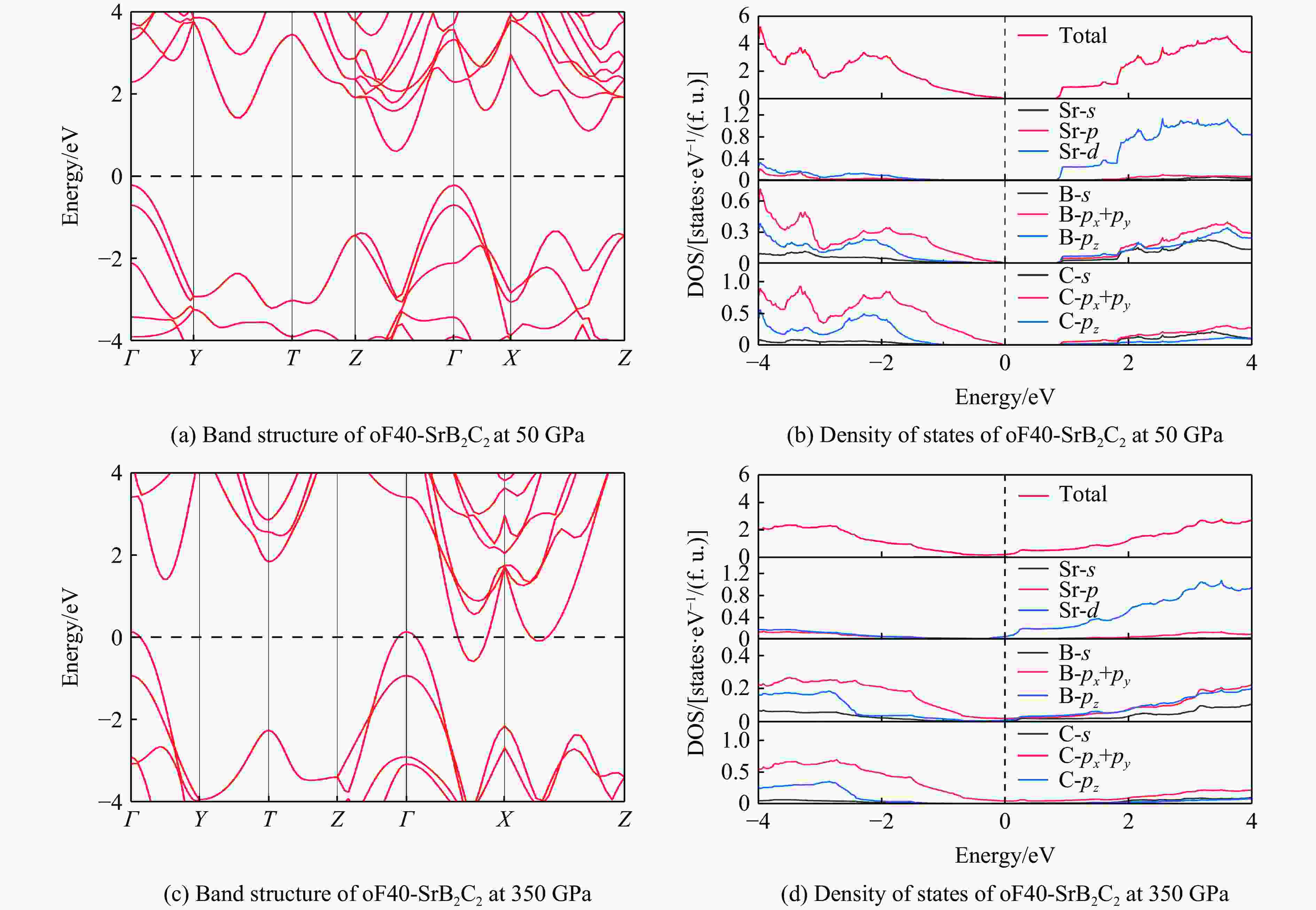 摘要: 采用基于密度泛函理论的第一性原理计算方法和基于粒子群优化算法的结构预测方法,在0~350 GPa压力范围内对SrB2C2进行结构搜索,成功确定了SrB2C2在常压下是属于四方晶系的tI20-SrB2C2,在高压下是属于正交晶系的oF40-SrB2C2。基于焓差曲线,确定了SrB2C2的相变压力为44.7 GPa。通过计算声子谱、弹性常数和形成焓,验证了tI20-SrB2C2和oF40-SrB2C2在对应压力下的稳定性和实验合成的可能性。由不同方向的杨氏模量和剪切模量可以看出,tI20-SrB2C2具有比oF40-SrB2C2更明显的力学各向异性,主要是由于sp2杂化的硼碳键组成了层状结构的tI20-SrB2C2,而oF40-SrB2C2的硼碳键主要是sp3杂化的共价键,形成了更稳定的三维网状四面体结构。电子结构计算表明,SrB2C2均为间接带隙半导体,电子局域函数计算说明了tI20-SrB2C2和oF40-SrB2C2中的硼碳键分别为sp2和sp3共价键。Abstract: By employing the first-principles calculations and the structure prediction method, which are based on density functional theory and particle swarm optimization algorithm respectively, this work conducted a structural search of SrB2C2 in the pressure range of 0−350 GPa, and successfully determined the structure of tetragonal phase tI20-SrB2C2 at ambient pressure and orthorhombic phase oF40-SrB2C2 at high pressures. Based on the enthalpy difference curve of SrB2C2, the phase transition pressure was determined to be 44.7 GPa. Moreover, the stability and the possibility of experimental synthesis of tI20-SrB2C2 and oF40-SrB2C2 at the corresponding pressure were verified by calculating the phonon spectrum, elastic constants and formation enthalpy. In addition, the tI20-SrB2C2 has higher degree of mechanical anisotropy than oF40-SrB2C2, which can be seen from the Young’s modulus and shear modulus as a function of orientations. It can be ascribed to the fact that the sp2-hybridized boron-carbon bonds form the layered structure of tI20-SrB2C2, while the boron-carbon bonds of oF40-SrB2C2 are mainly sp3-hybridized covalent bonds, forming a more stable three-dimensional tetrahedral network structure. The electronic structure calculations show that SrB2C2 is an indirect band gap semiconductor, and the calculated electronic localization function reveals that the boron-carbon bonds in tI20-SrB2C2 and oF40-SrB2C2 are sp2 and sp3 covalent bonds, respectively.