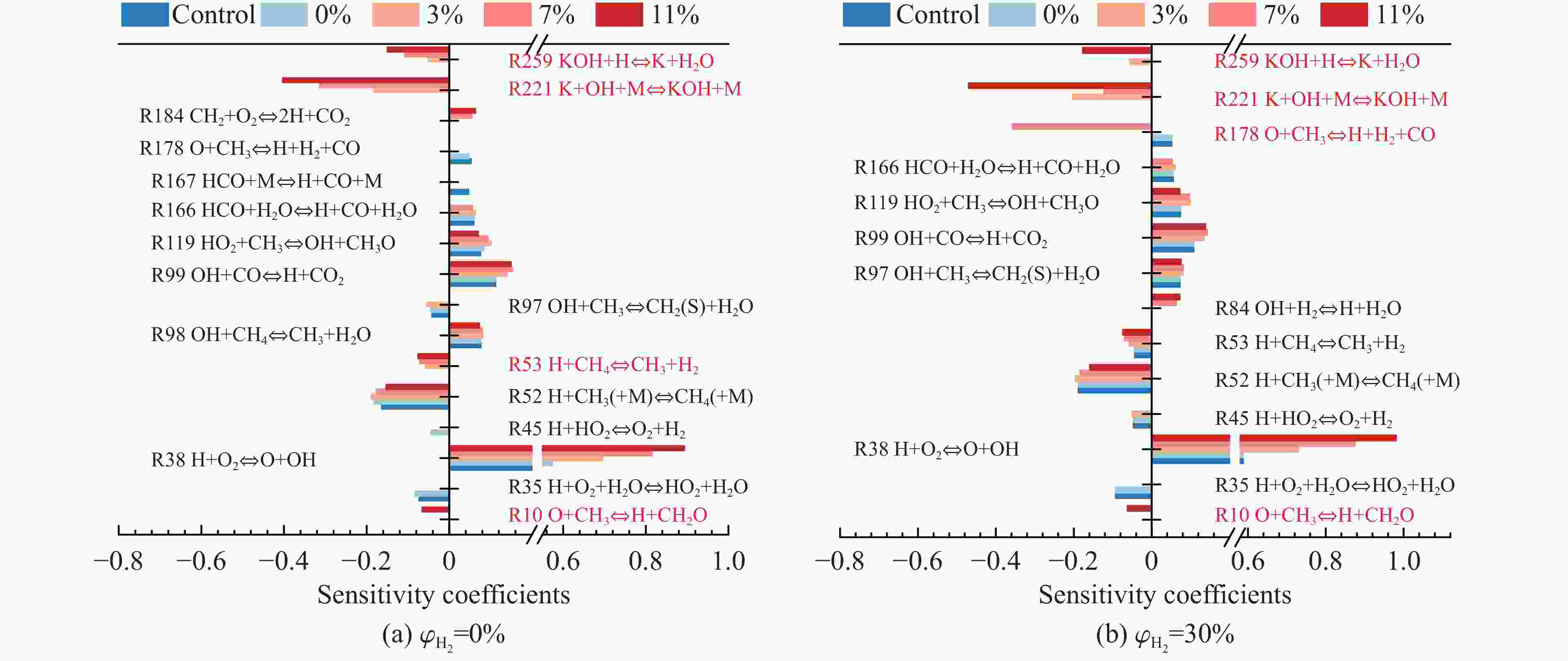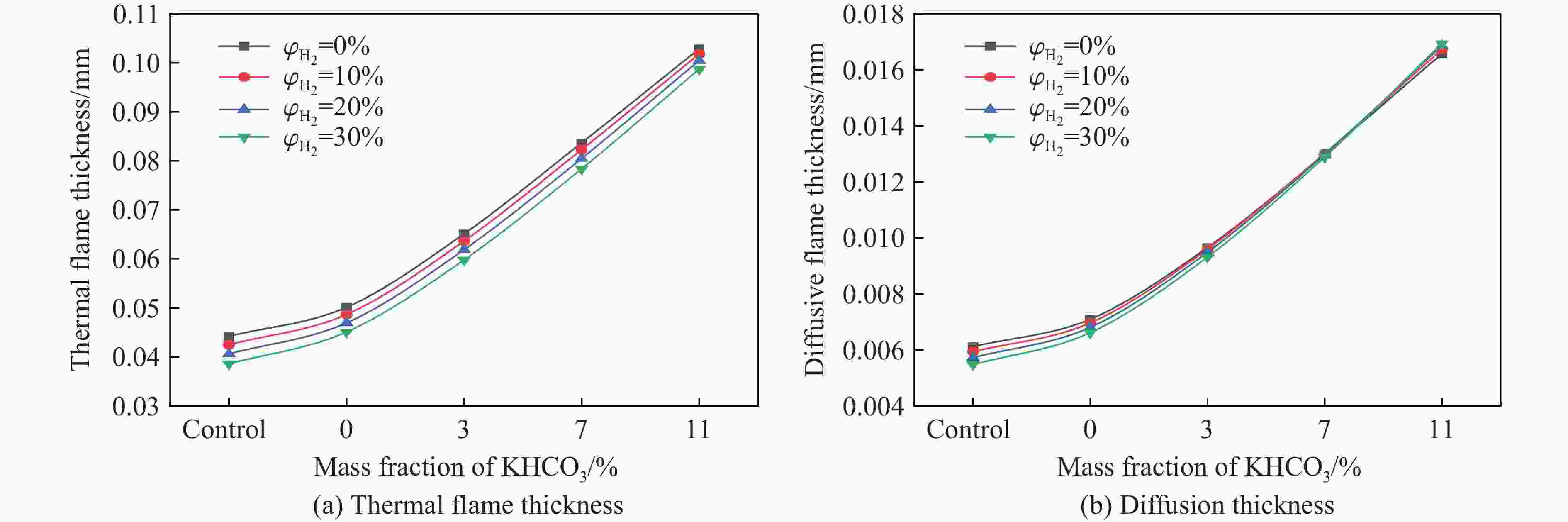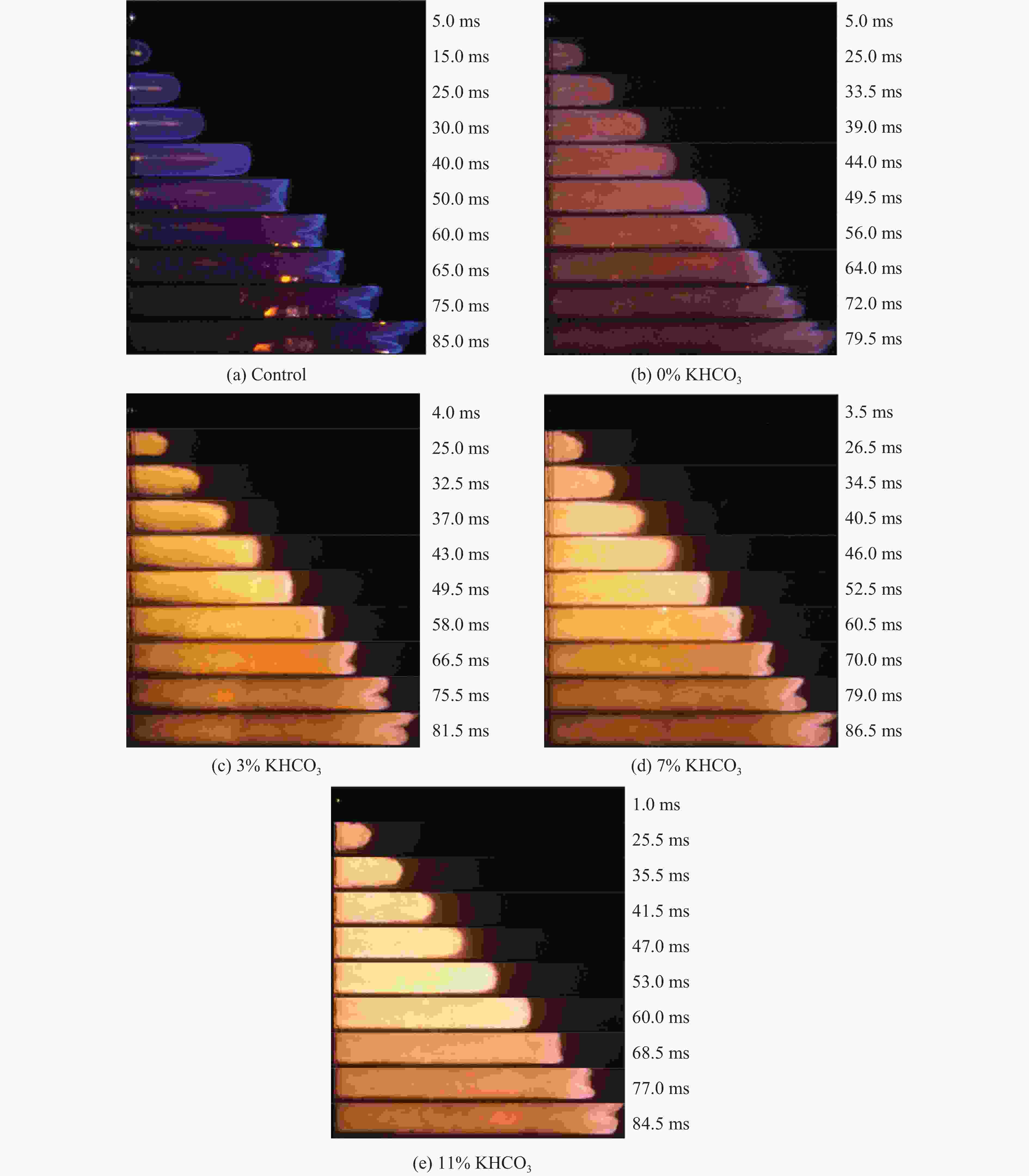 $ {\varphi}_{{{\mathrm{H}}_{2}}} $/% Mass fraction of KHCO3/% $ {t}_{{{\mathrm{p}}_{\max }}} $/ms pmax/kPa $ {(\mathrm{d}p/\mathrm{d}t)}_{\text{avg}} $/(MPa·s−1) 0 Control 37.62 24.13±0.84 0.64±0.03 0 34.54 21.74±0.61 0.63±0.03 3 49.80 20.34±0.92 0.41±0.02 7 39.90 18.71±0.41 0.47±0.02 11 44.36 15.77±0.63 0.36±0.01 10 Control 37.18 26.16±0.81 0.70±0.03 0 45.14 23.46±0.59 0.52±0.02 3 37.70 22.16±0.95 0.59±0.02 7 34.82 18.31±0.73 0.53±0.02 11 52.12 16.29±0.34 0.31±0.01 20 Control 35.54 27.75±0.83 0.78±0.03 0 44.48 26.95±1.12 0.61±0.03 3 42.02 25.74±0.62 0.61±0.02 7 41.50 26.79±1.23 0.65±0.02 11 49.42 22.40±0.72 0.45±0.02 30 Control 34.88 29.92±0.78 0.86±0.03 0 39.82 30.49±1.49 0.77±0.03 3 36.52 26.72±0.88 0.73±0.02 7 41.50 26.79±0.75 0.65±0.03 11 41.84 25.36±1.07 0.61±0.02 -