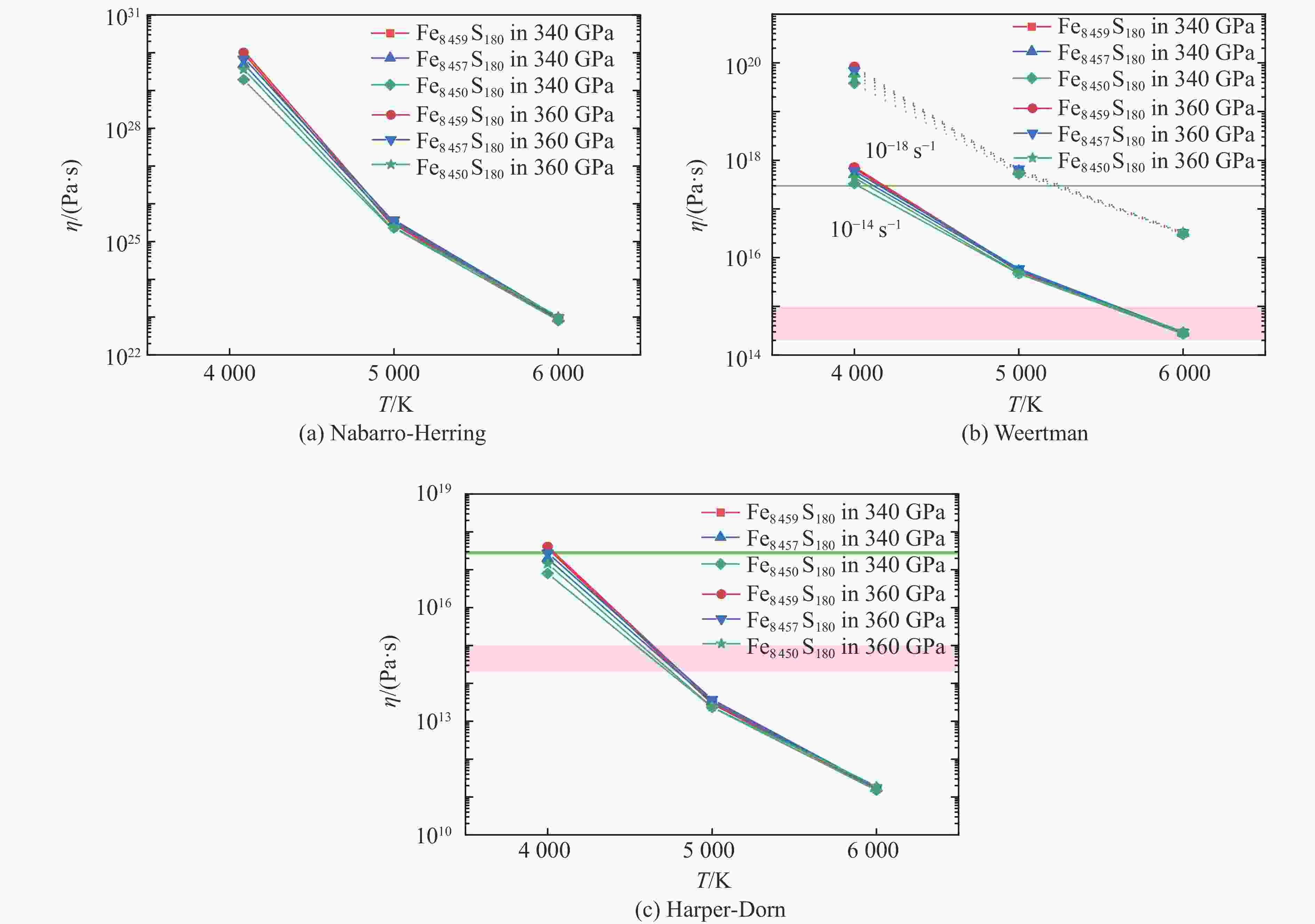 Figure 10. Viscosities predicted by different creap models at 340 and 360 GPa (The pink region represents the constraint on inner-core viscosity from free-core nutation[85], while the green region denotes the constraint from core-mantle gravitational coupling[84].)