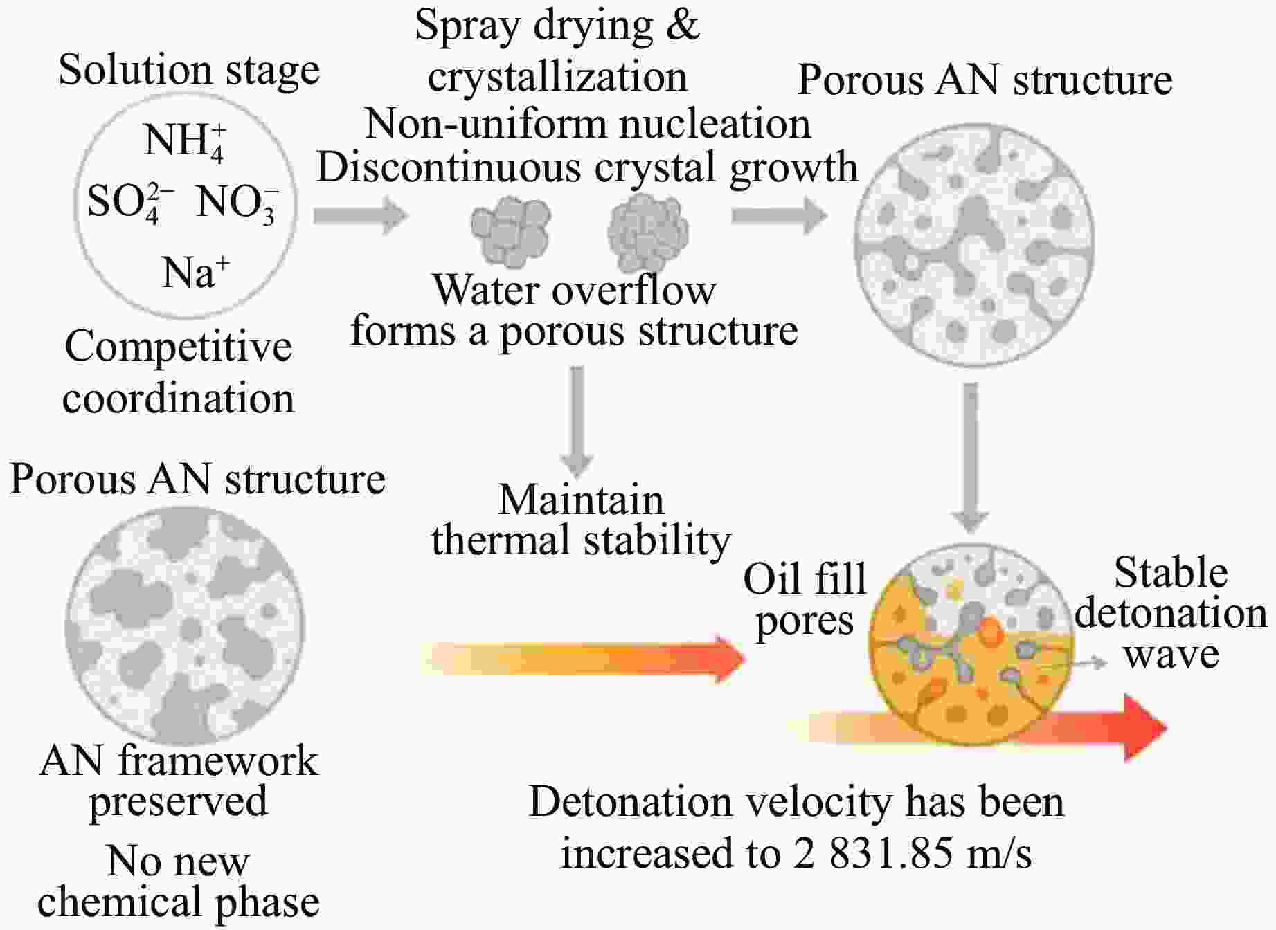 2831.85 m/s。微量PST可在基本不损害热安全性的前提下,诱导硝酸铵形成多孔结构,并显著改善爆速表现,具有较大的工程应用潜力。Abstract: Porous ammonium nitrate is frequently used for specific applications due to its porous structure when compared with conventional ammonium nitrate, however, its higher transportation costs increase overall operational expenses. This study investigated the preparation of porous granular modified ammonium nitrate using ionic surfactant PST as an additive via spray granulation. The effects of varying PST concentrations (0−0.4%) on the pore structure, oil absorption capacity, thermal stability, and explosive properties of ammonium nitrate were examined. The research results indicate that increasing PST content gradually transforms dense ammonium nitrate particles into a porous structure with distinct interconnected pores. Thermal stability remains essentially unchanged, and the matrix chemical composition undergoes no fundamental alteration, though its adsorbed water content decreases. The modified samples exhibit enhanced binding capacity with the oil phase. The detonation velocity of the assembled charge increases from “failed to detonate normally” in the unmodified state to2831.85 m/s. Trace amounts of PST can induce the formation of a porous structure in ammonium nitrate without significantly compromising thermal safety, while markedly improving detonation velocity performance, demonstrating potential for engineering applications.-