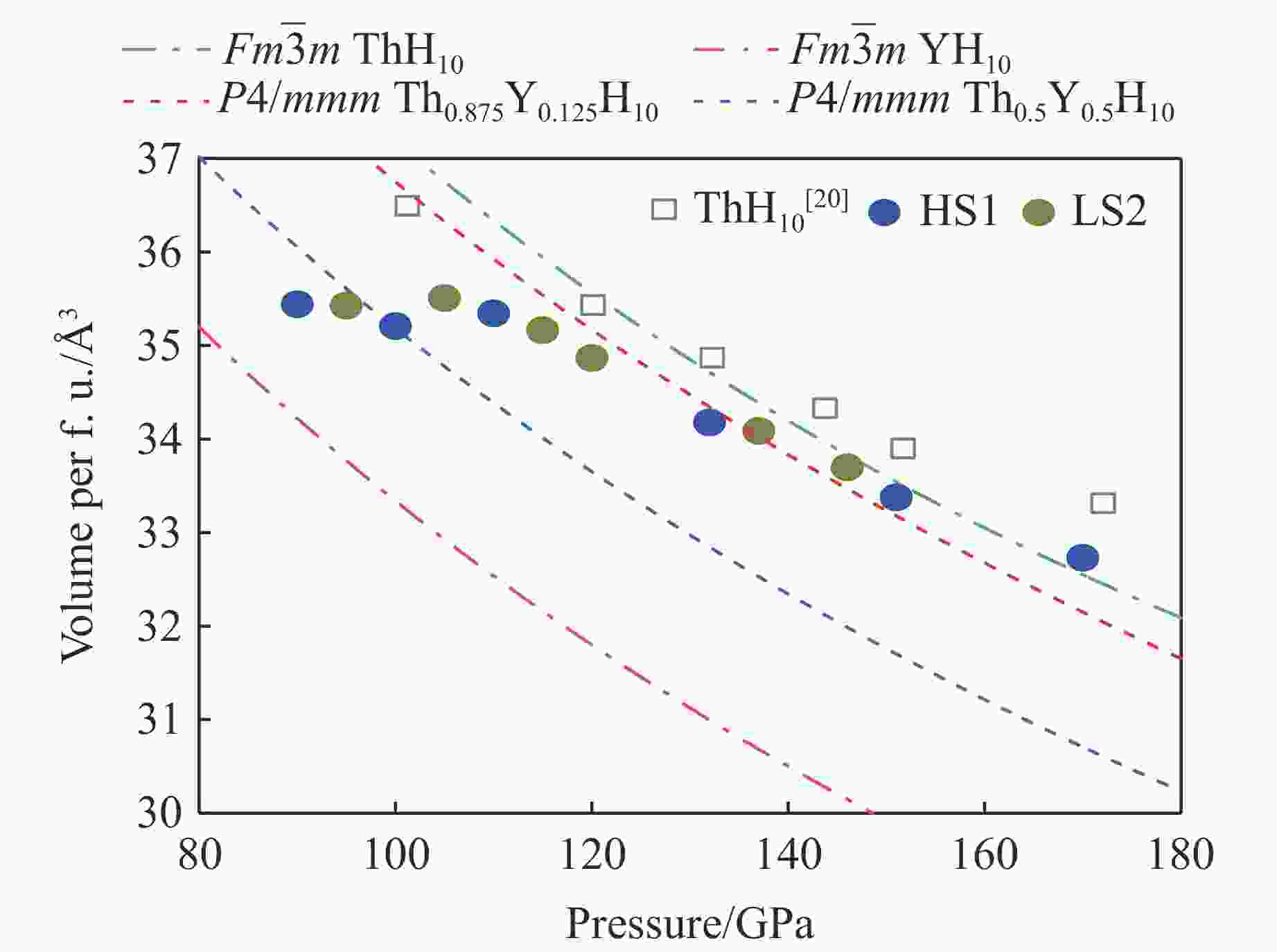 图 2 样品体积随压力的变化趋势(实心符号代表本工作的合成样品,空心符号代表文献[20]中的实验结果,虚线为理论计算的不同相的体积-压力曲线)