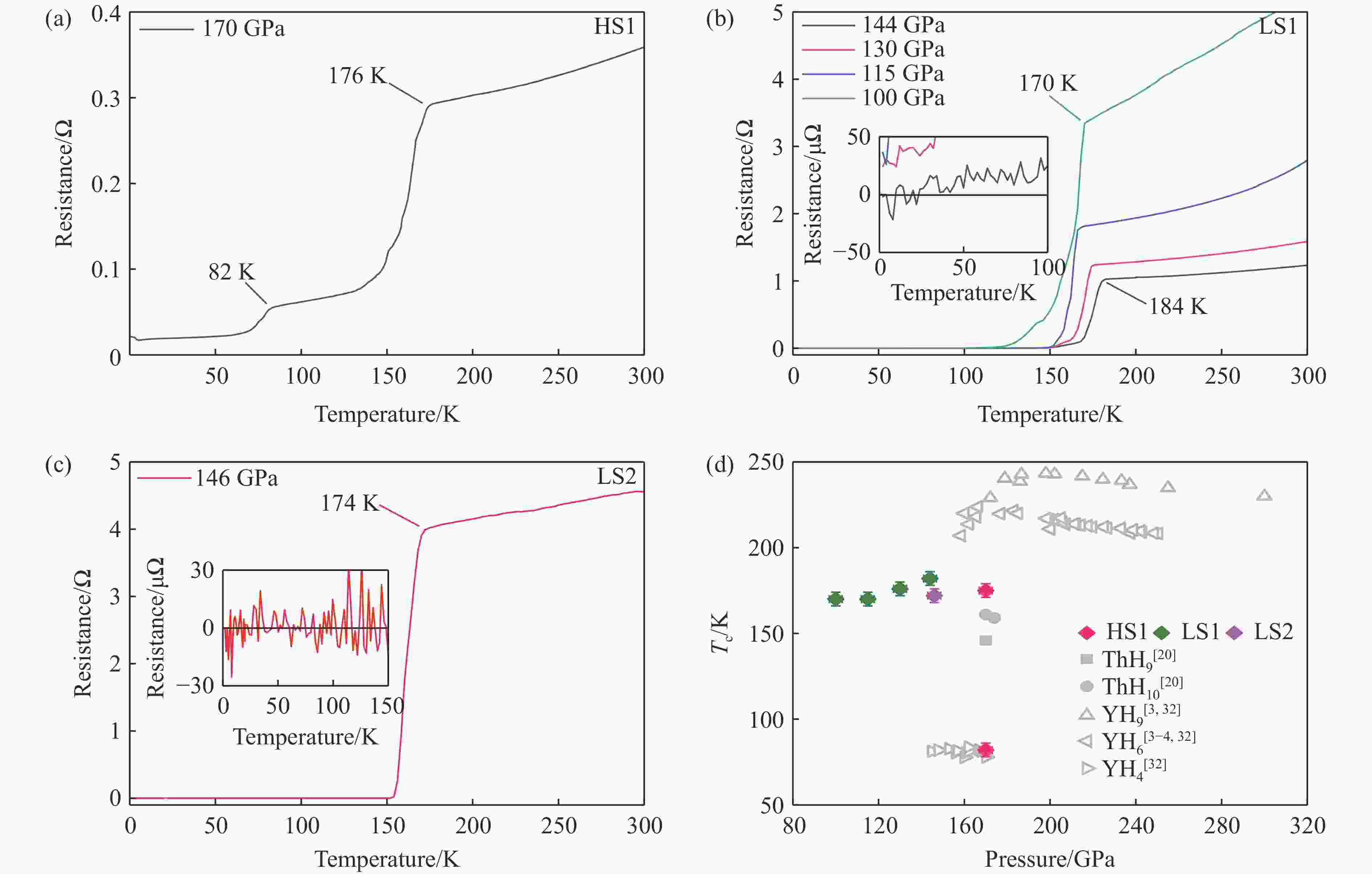 Figure 3. Electrical transport measurements for different samples (a)−(c), and the trend of the extracted Tc with pressure and comparison with binary systems (d) (The insets in (b) and (c) show electrical transport measurements of the samples below Tc. The colored symbols in (d) represent results measured in this experiment, and the gray symbols represent the results measured in other studies on binary systems[3–4, 20, 32].)