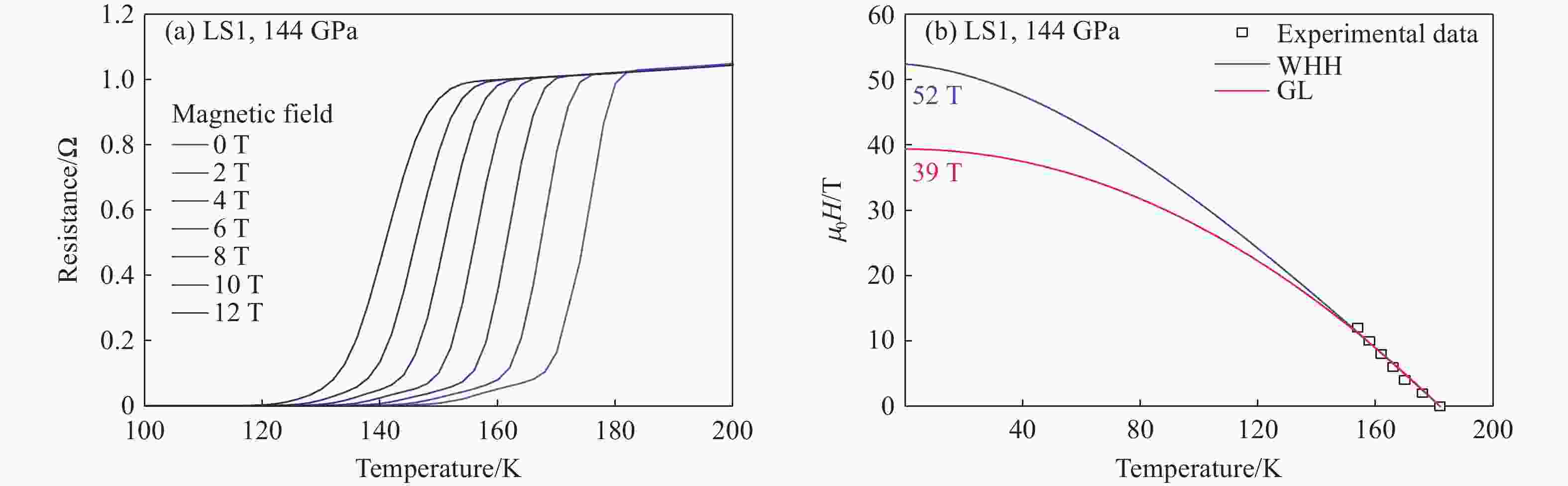 摘要: 近年来,氢基超导体在高压下实现的近室温超导引起了广泛关注,然而,大多数具有高超导转变温度(Tc)的氢化物需要在极高的压力下才能稳定,极大地限制了其应用潜力。为此,提出了在三元Th-Y-H体系中探索中等压力下获得高Tc超导体的可能性。利用金刚石对顶砧,结合原位激光加热技术,以钍(Th)、氢化钇(YH3)和氨硼烷(NH3BH3)为前驱体,在高温高压条件下合成了Th-Y-H三元氢化物。结合同步辐射X射线衍射测量与理论研究结果,确定其主要产物为立方相的(Th,Y)H10,其中Y的占比为10%~15%。电输运测量结果显示,相近压力下其Tc较ThH10提升约10%,在144 GPa下样品的Tc最高可达184 K,且在降压至100 GPa时仍可达170 K,接近该压力下已知氢化物的最高Tc纪录。外加磁场下的测试进一步证实了超导的存在,并基于WHH模型和GL模型估算其上临界场分别为52和39 T。研究结果表明,Th-Y-H是具有优异超导性的三元超导材料体系,通过在二元体系中合理引入新的元素,可有效调控晶体稳定性和电子性质,为在中等压力甚至低压下探索高Tc超导氢化物提供了新的思路与实验依据。Abstract: Recent achieved superconductivity near room temperature, especially in hydrogen-based superconductors under high pressure, have attracted broad interest. However, most systems with high superconducting critical temperature (Tc) are only stable under extremely high pressures, which limits their practical applicability. This study proposes the possibility of obtaining high-Tc superconductors at moderate pressures within the ternary Th-Y-H system. The synthesis was carried out using Th, YH3, and NH3BH3 as precursors under high pressure and high temperature, applied by diamond anvil cells combined with in-situ laser heating technology. Combining with the synchrotron X-ray diffraction (XRD) measurements and theoretical studies, the main product was identified as Fm$ \overline{3} $m (Th,Y)H10, with Y accounting for approximately 10%−15%. Electrical transport measurements reveal that its Tc increases by approximately 10%, compared to ThH10 under similar pressure. At 144 GPa, the sample has a maximum Tc of 184 K, which remains at 170 K when decompressed to 100 GPa—approaching the highest level known for hydrides at this pressure. Measurements under an applied magnetic field further verify the superconductivity, with upper critical fields estimated at 52 and 39 T based on the WHH and GL models, respectively. These results indicate that the ternary Th-Y-H superconducting system is an outstanding candidate for high-Tc superconductors, and the crystal stability and electronic properties can be effectively controlled by reasonably introducing new element into the binary system. This work provides new insights and experimental evidences for exploring high-Tc superconducting hydrides under moderate or even low pressures.