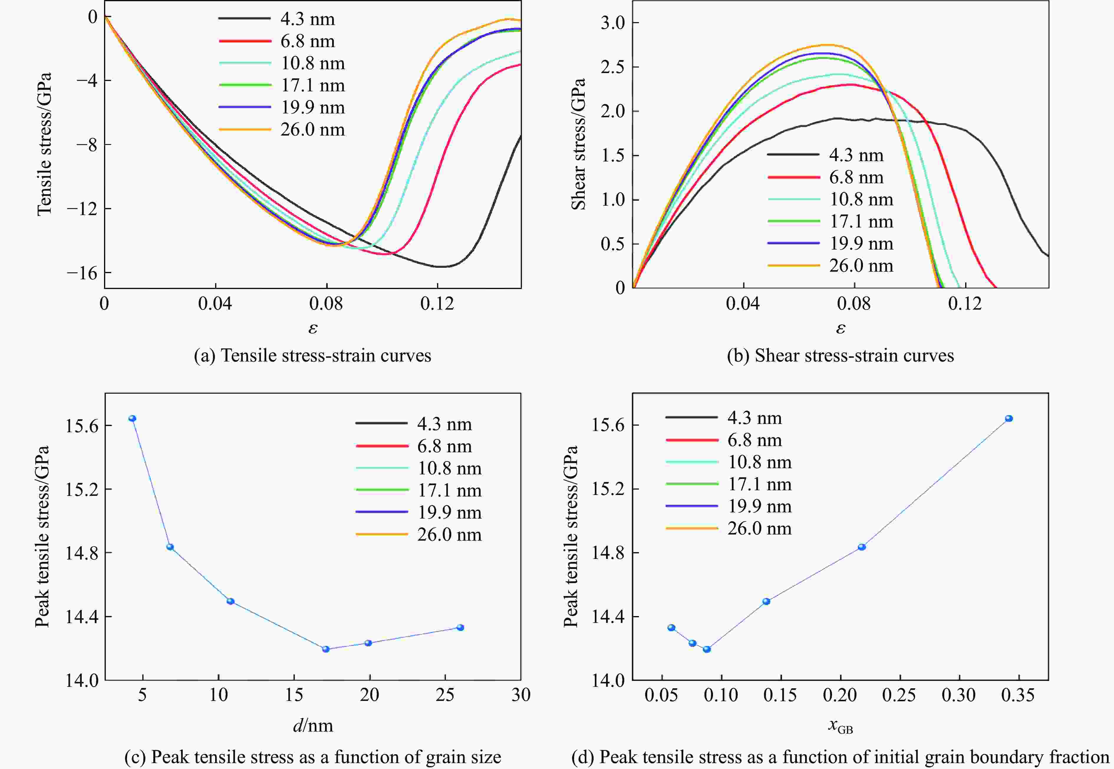 Figure 11. Tensile stress (a) and shear stress (b) as a function of strain, and variations of the peak tensile stress with grain size (c) and the initial grain boundary fraction (d) (The peak stress is plotted in absolute value, representing the fracture strength.)