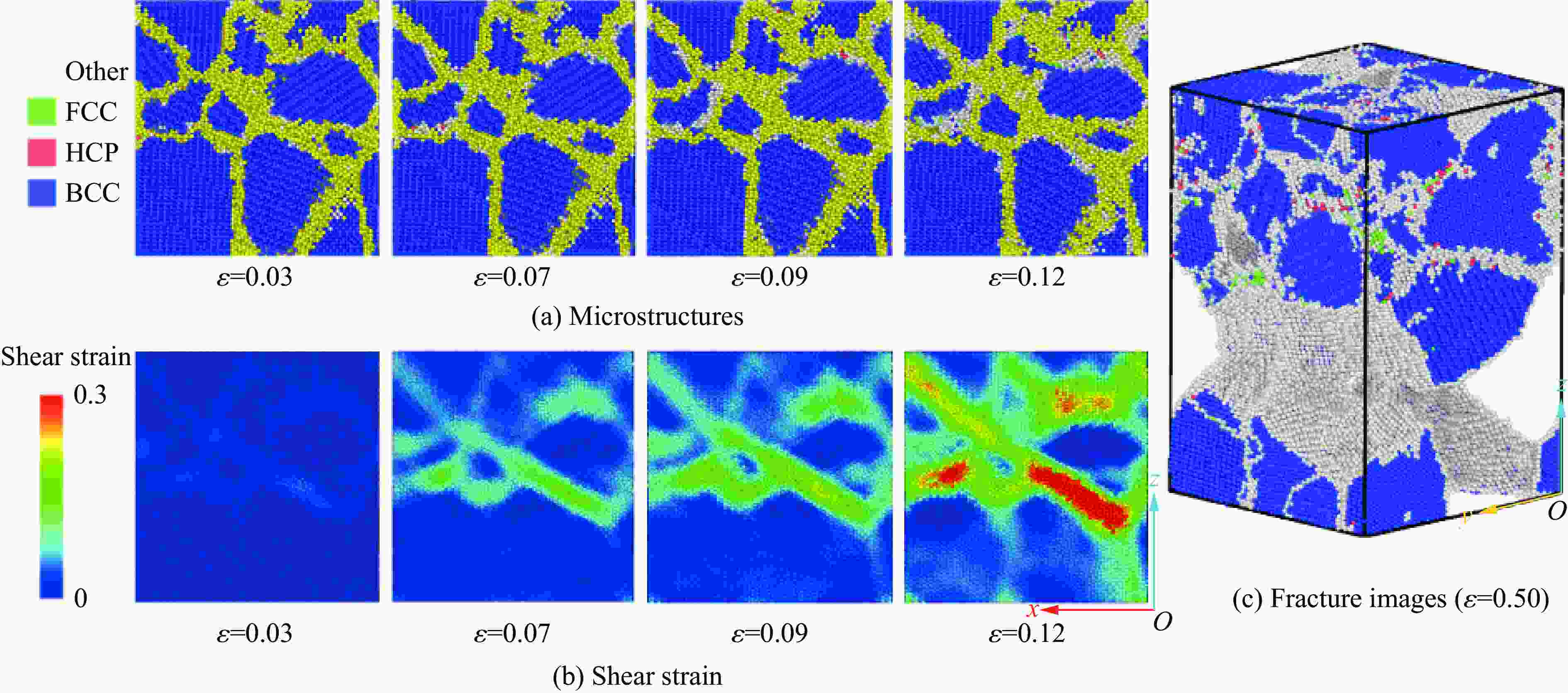 图 13 晶粒尺寸为6.8 nm时不同拉伸应变阶段的微结构(a)、对应的剪切应变(b)以及断裂图像(c)(微结构中黄色原子表示初始晶界原子,橙色箭头代表该处发生了晶界迁移)