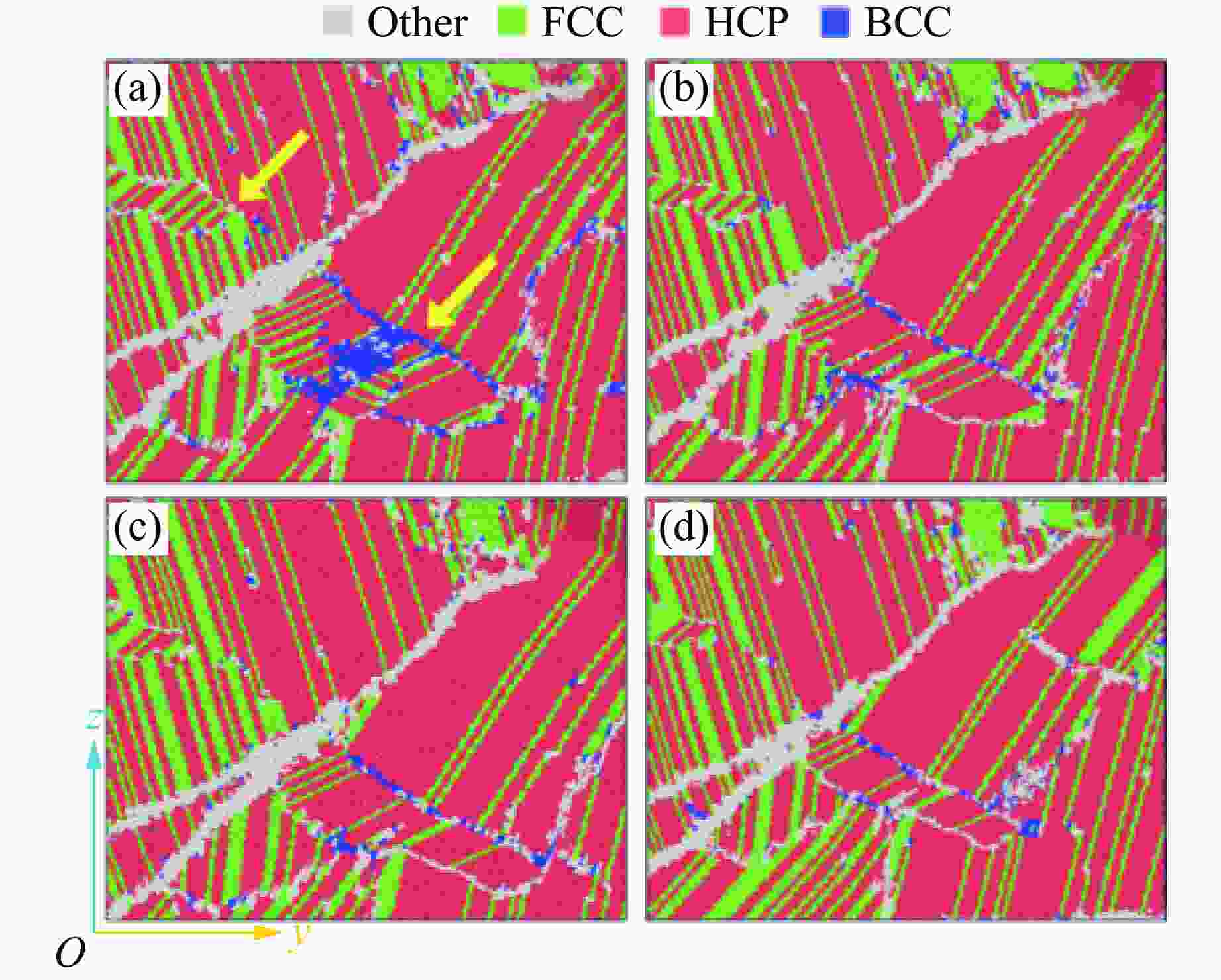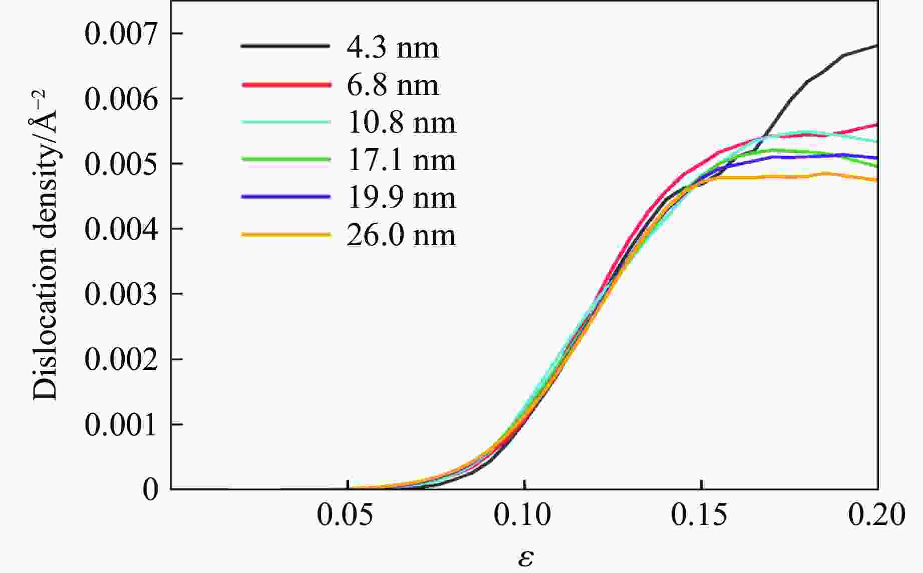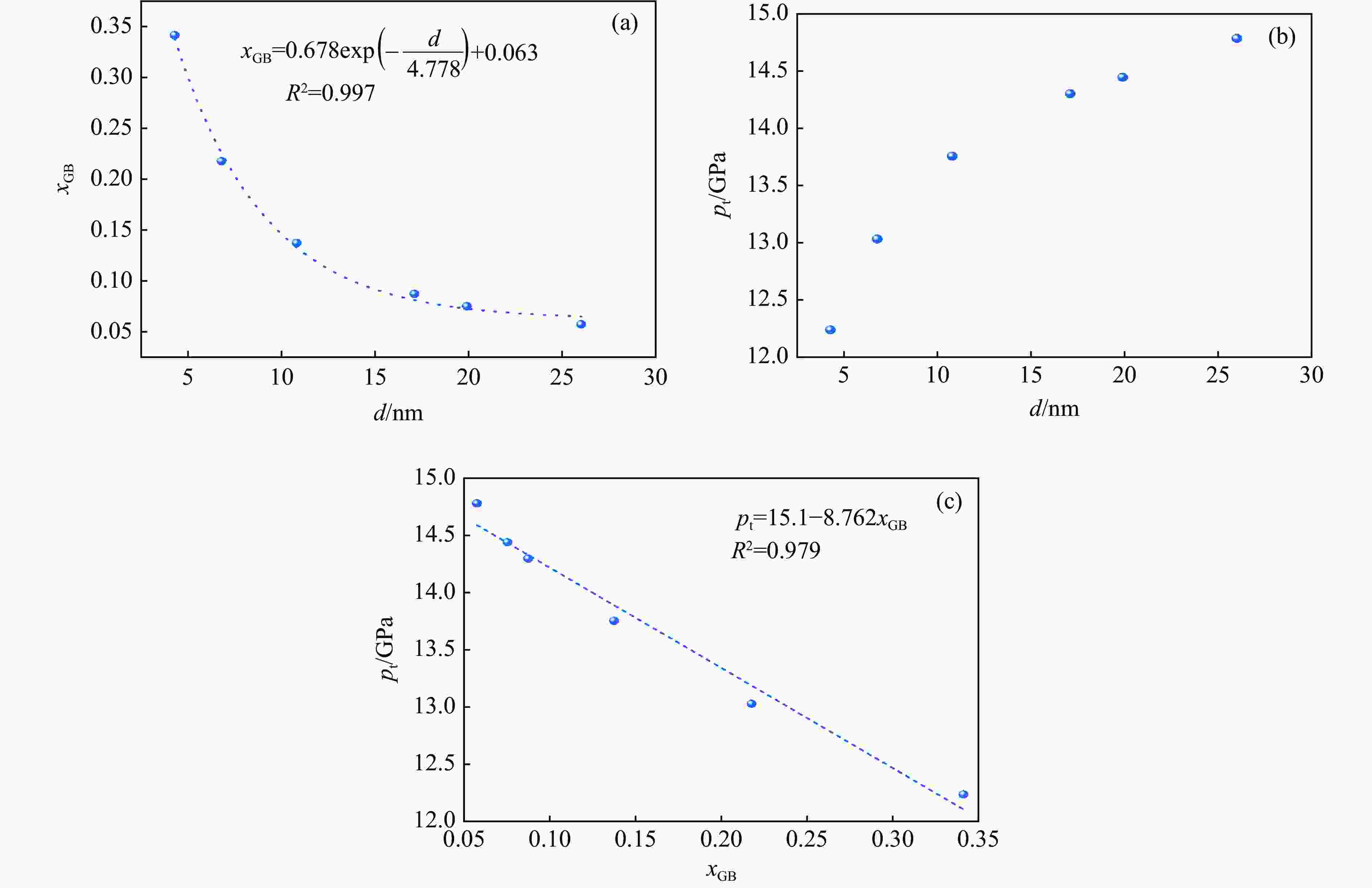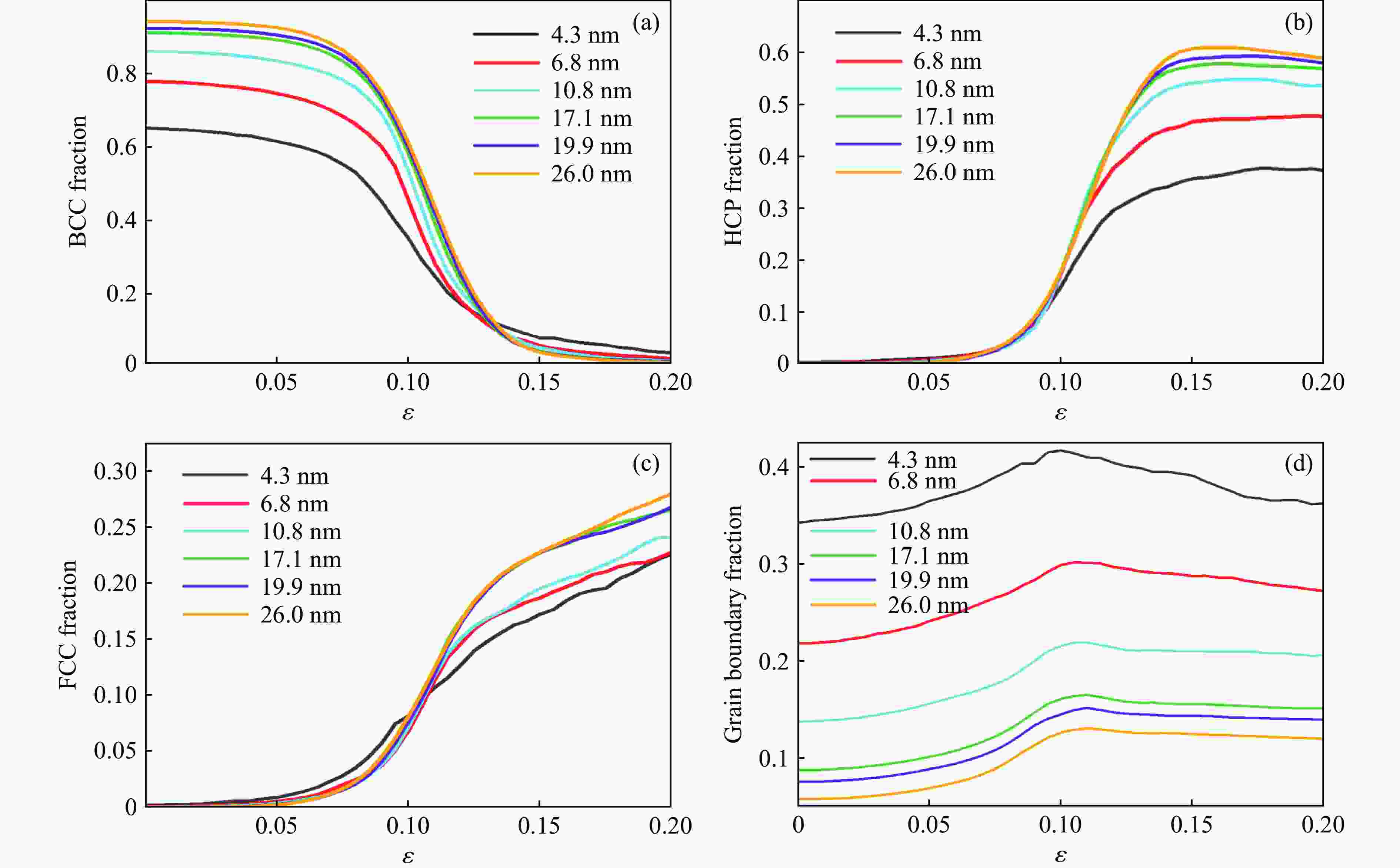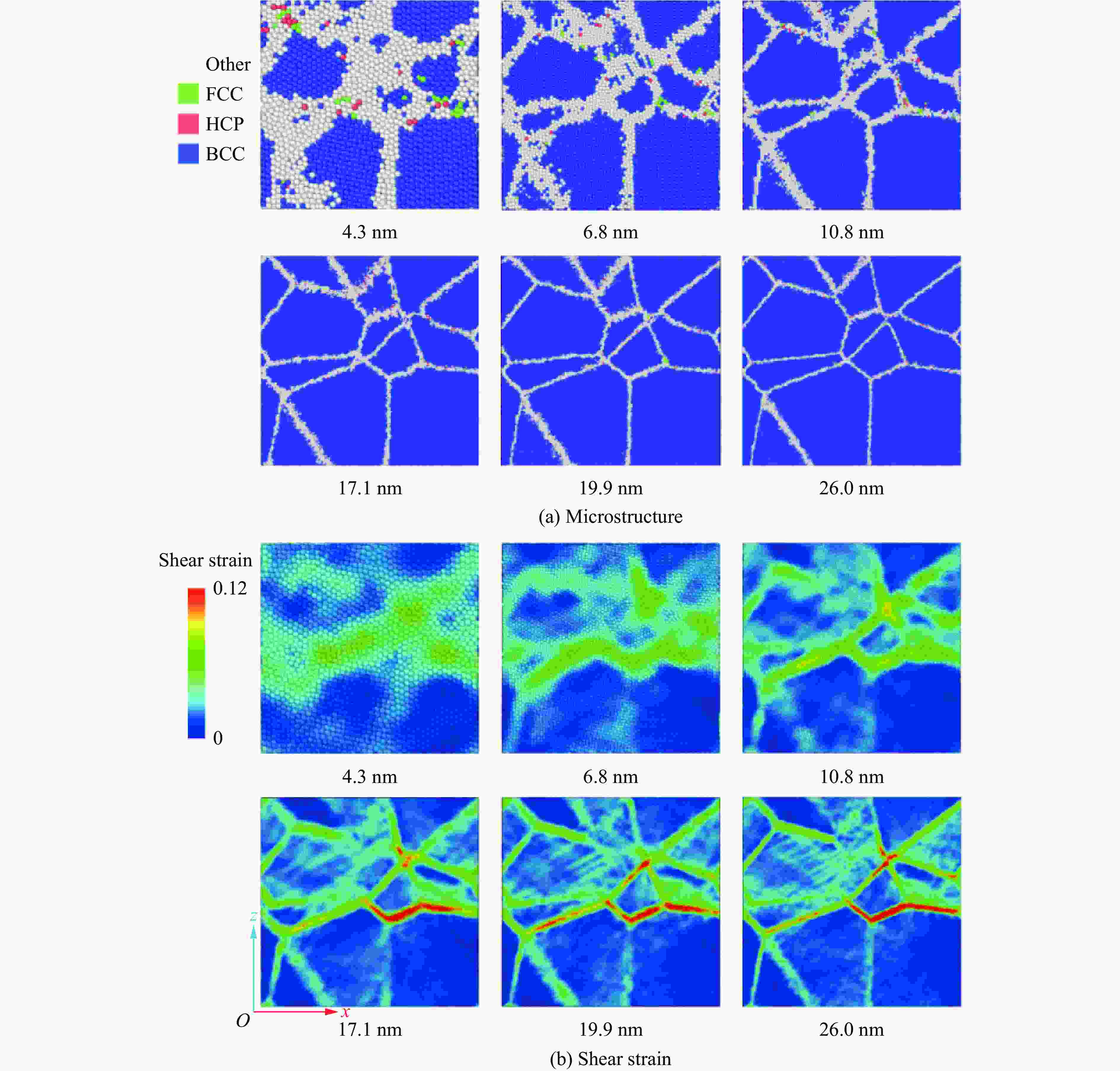摘要: 晶粒度效应是影响金属材料动态力学性能的重要因素之一。以相变金属铁为研究对象,构建了拓扑结构与取向分布相同的不同纳米晶粒度的铁模型,旨在考察特定晶粒分布状态下的尺寸效应。分子动力学模拟结果表明,不同晶粒度模型在高应变率单轴压缩下均经历了弹性变形、α→ε相变和高压相塑性变形等阶段。在弹性变形阶段,晶界起到了一定的软化层作用,导致细晶模型的应力低于粗晶模型的应力;结构相变发生后,晶界对新相的塑性发展起到阻碍作用,使细晶模型应力高于粗晶模型应力。相变发生时,小晶粒的相变阈值更低,相变后的新相形成层错结构,而在较大晶粒中出现孪晶结构。随着应变增加,在大晶粒中观察到孪晶的消失及层错的重构过程。在高应变率拉伸下,大晶粒中晶界的剪切应变高度局域化,易形成连续剪切带,并优先成为裂纹拓展通道;晶粒细化后,晶界剪切逐渐转变为弥散化模式,有效裂纹拓展路径受到晶界网络的约束。晶界作用的转变导致损伤断裂强度随晶粒尺寸变化呈现出非单调的变化规律。Abstract: Grain size effect is one of the key factors governing the dynamic mechanical response of metallic materials. Phase transformation iron is selected as the model material, and a series of nanocrystalline polycrystals with identical topology and grain orientation distributions but different grain sizes are constructed to investigate size effects under a fixed grain configuration. Molecular dynamics simulations show that, under high strain rate uniaxial compression, all models undergo elastic deformation, α→ε phase transition, and high-pressure phase plastic deformation. During the elastic stage, grain boundaries act as a soft layer, leading to lower stresses in the fine grain models than in the coarse grain model. After the structural phase transition, grain boundaries hinder the plastic development of the new phase, so that the fine grain models exhibit higher stress than the coarse grain models. At the onset of phase transition, the threshold of phase transition of smaller grains is lower, and the transformed phase in fine grains mainly forms stacking fault structures, whereas twinning structures appear in relatively larger grains. With increasing strain, the disappearance of twinning and the reconstruction of stacking faults are observed in large grains. Under high strain rate tension, shear strain of grain boundary in the large grain models is highly localized, readily forming continuous shear bands that serve as preferred paths of crack propagation. After grain refinement, shear strain of grain boundary gradually evolves into a diffuse mode, and the effective paths of crack propagation are constrained by the network of grain boundaries. The change of grain boundary effects leads to a non-monotonic variation of fracture strength with the grain size.