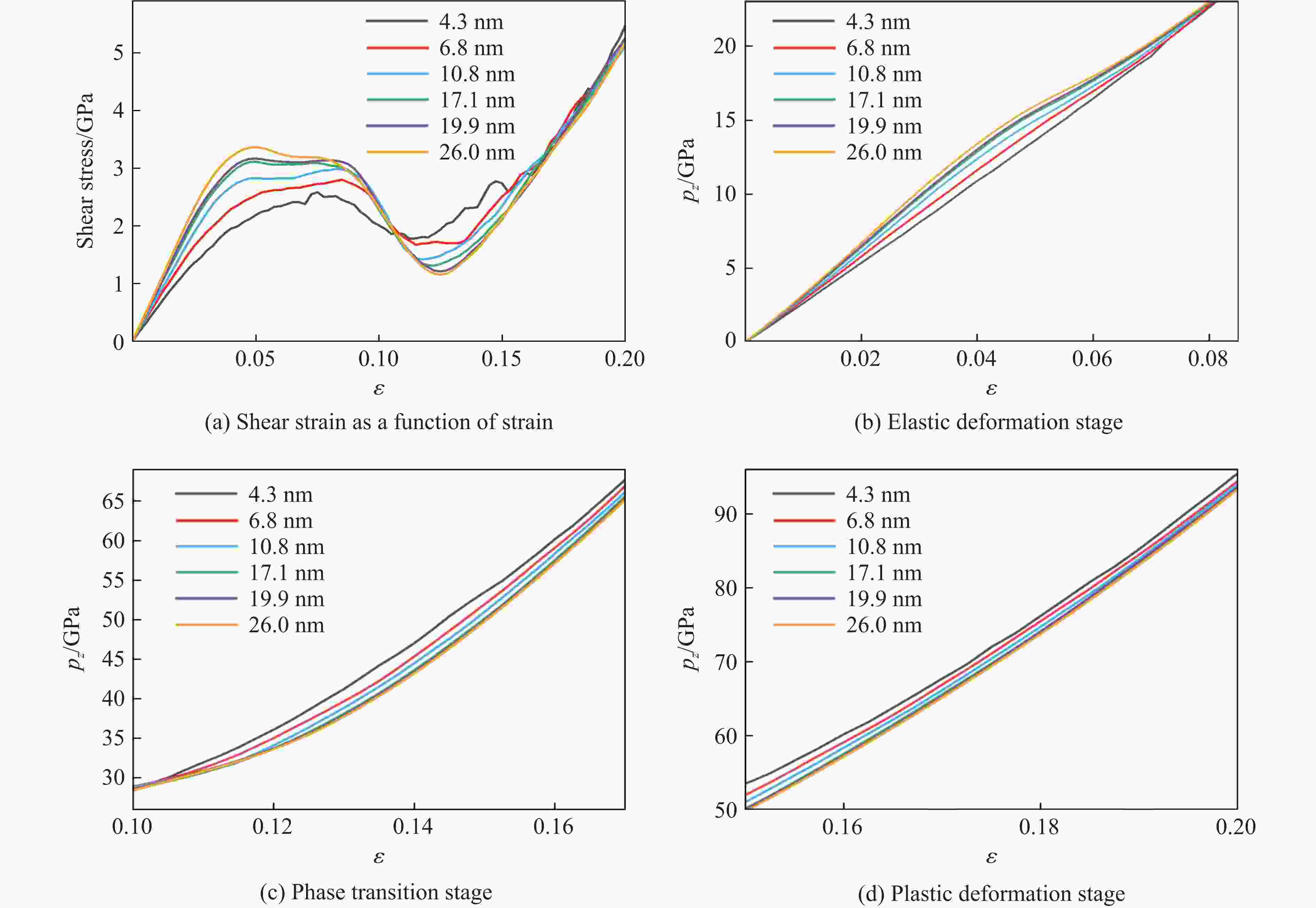 图 5 不同晶粒度下铁的剪应力-应变曲线 (a),以及弹性变形阶段(b)、相变阶段(c)和高压相塑性变形阶段(d)的应力-应变曲线