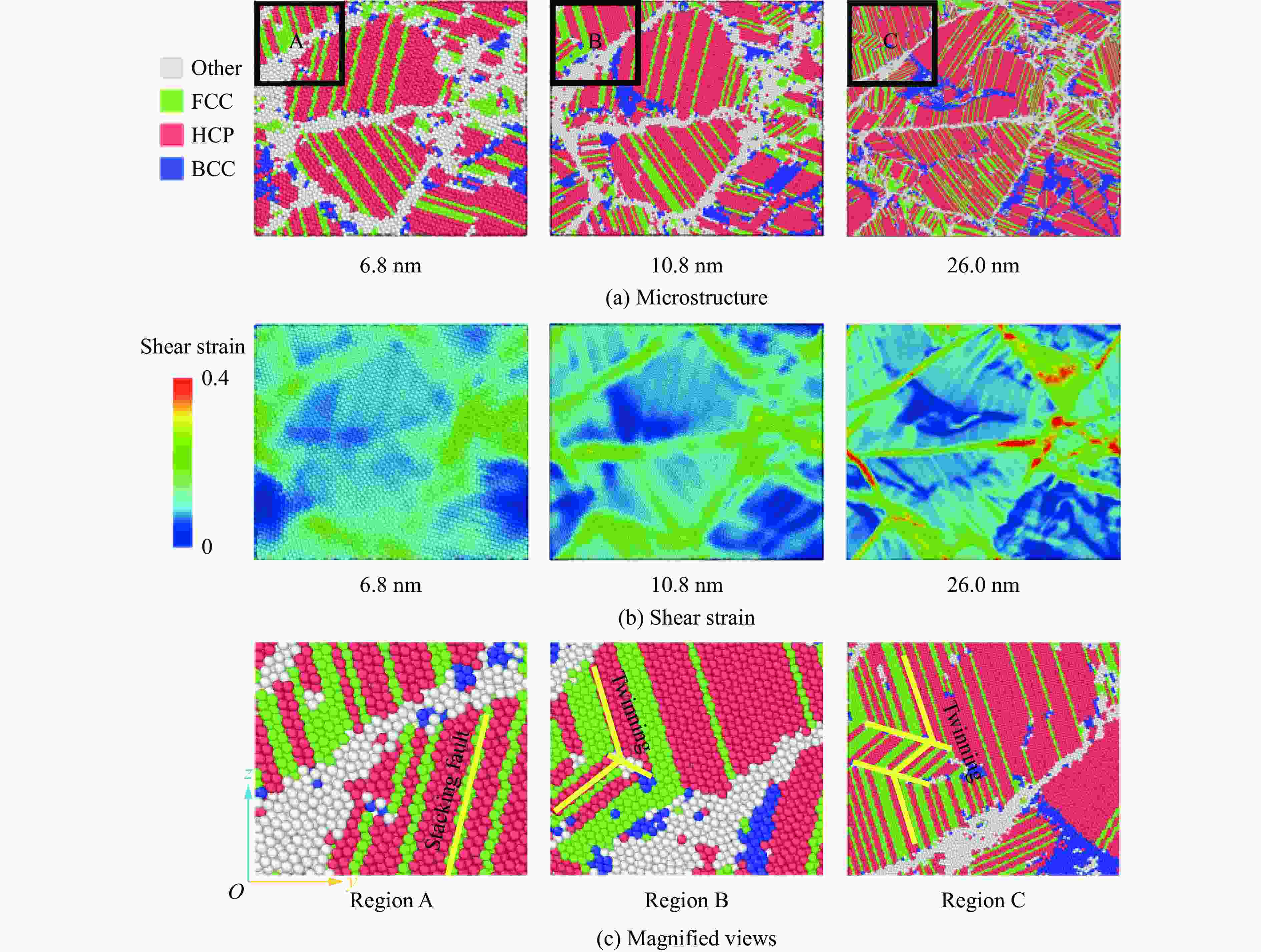 Figure 7. Microstructures (a) and shear strain (b) of polycrystalline Fe with grain sizes of 6.8, 10.8, and 26.0 nm at a strain of 0.14, and magnified views of the same region (c) (The highlighted yellow lines are used to identify stacking faults and twinning.)
