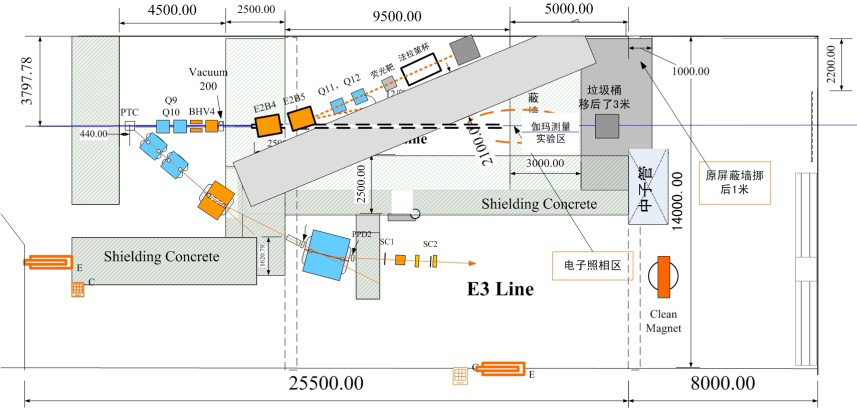 The main purpose of Beijing Test Beam Facility (BTBF) open access for beam tests of the new type of detectors, and also provides a means of testing the prototype detector in the initial stage. Another application of the BTBF is its mixing particle radiation field, the radiation field formed around the target when the electron beam bombard the target, it very like the cosmic rays irradiation environment, so it can be used for irradiation study of the materials, agriculture and genetic science. The BEPCII three-purpose reconstruction project is coming to an end. The Beijing test beam is a separate beam line from BEPCII and will be available for full year from April 2020. The BEPCII three-purpose reconstruction project is coming to an end. The Beijing test beam is a separate beam line from BEPCII and will be available for full year from April 2020. E2 line beam current parameters: 10ps, 1-2nC, 1.8-2.5GeV (concurrent mode), 1.1-2.5GeV (dedicated mode), 12.5-50Hz. E3 line single-particle beam line: can provide GeV single-energy electron, single-energy proton and single-energy Pi particles and their accompanying particles, frequency 1-4Hz, have potential for improvement. Beam time: When used with synchrotron mode, 170s/200s can be used. When used in collision mode, 15s/90s can be used.